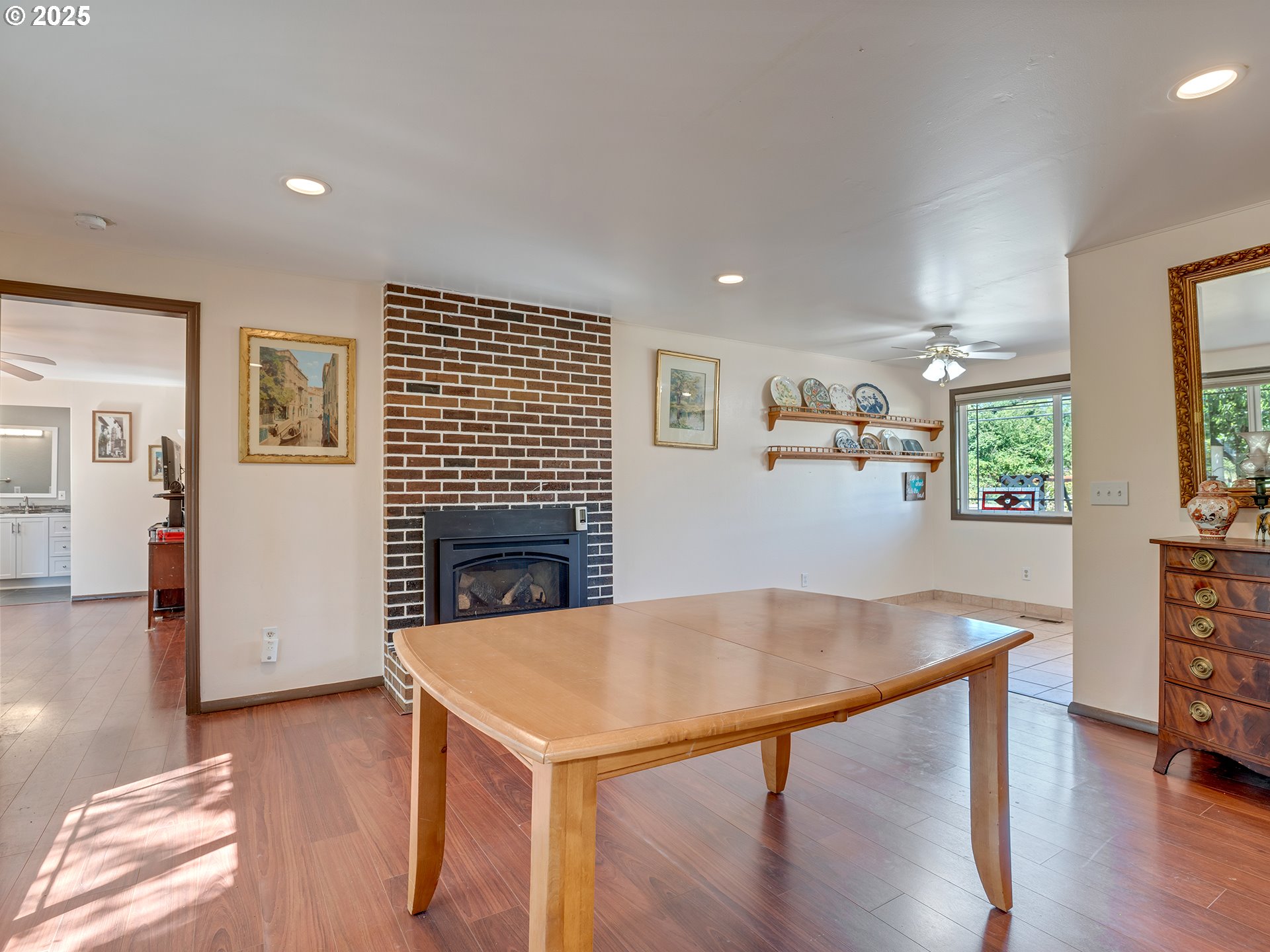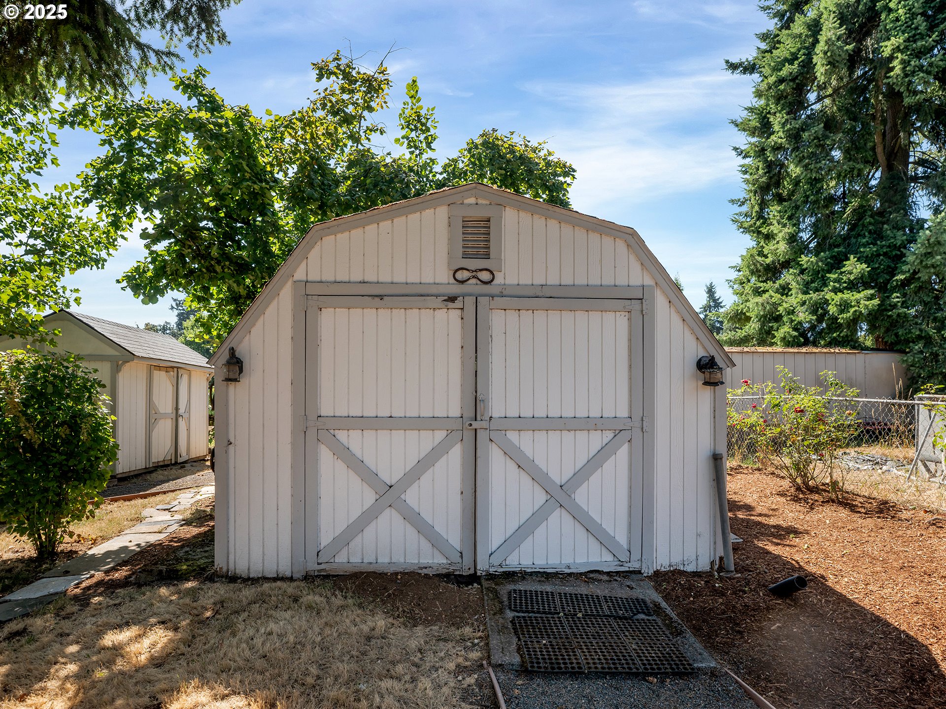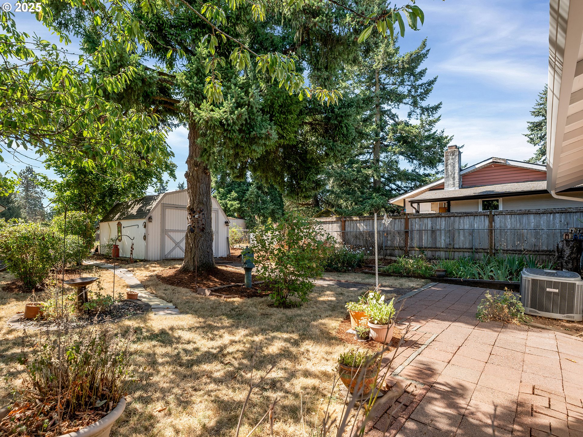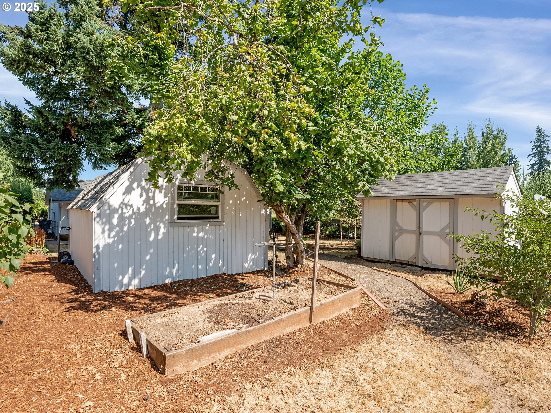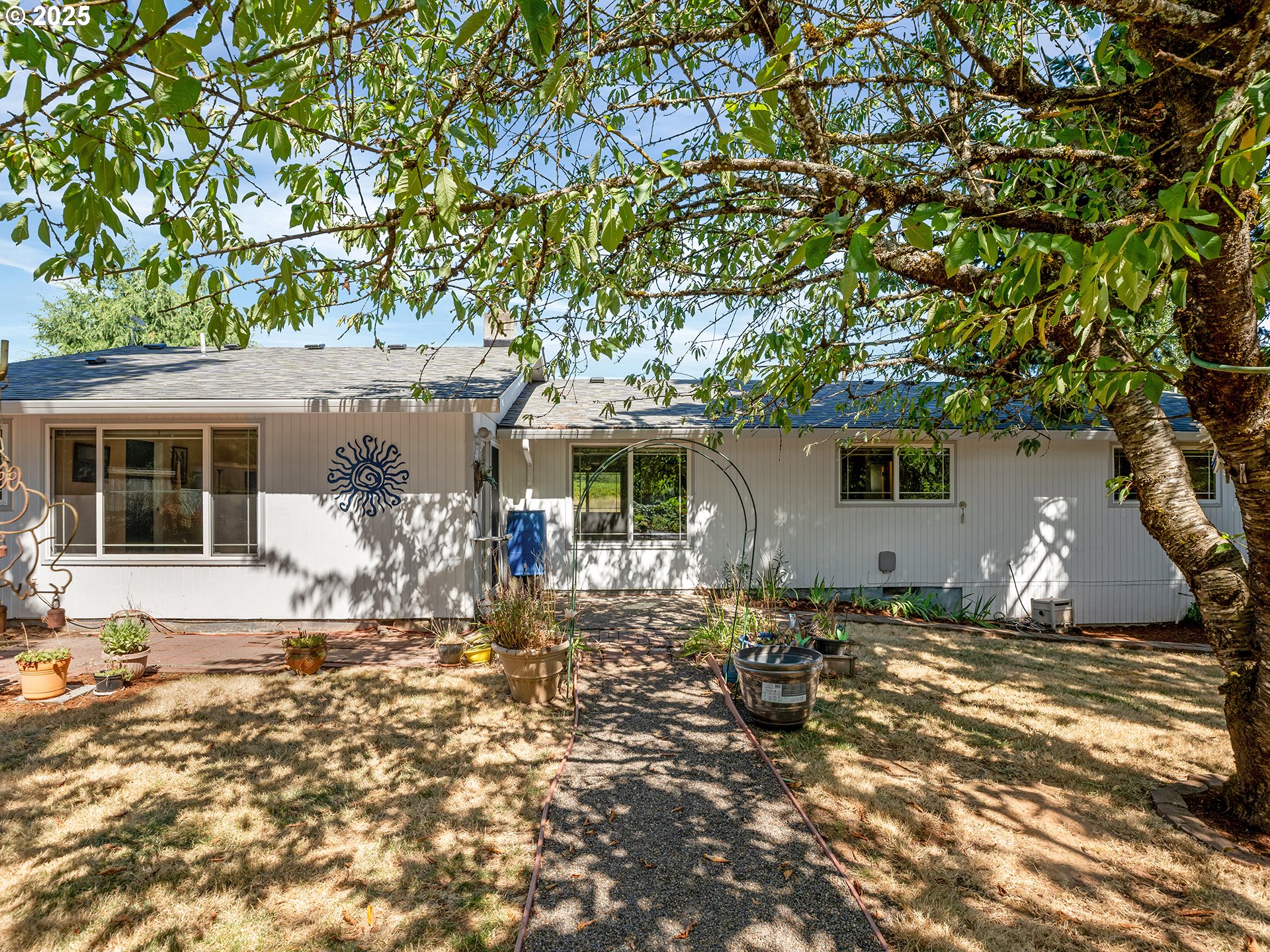 Excellent single level home in the popular Finnegans neighborhood on a wonderful, lusciously landscaped large (0.28 acre) private lot surrounded by greenspace on three sides and with flowers galore and multiple fruit trees including apples, plums, cherries, a grape arbor and a filbert tree! This bountiful lot also has the convenience of a circular driveway, backyard patio and two sheds (12x16 & 12x8) for ample outdoor storage. Inside the easy flow floorplan consists of three bedrooms (two with new carpeting as of June 2025), two bathrooms, an extended kitchen for either additional work/storage space or an eat-in option. Use the center room for either a living room or dining room with a cozy fireplace and the additional room as you wish for bonus space. Other features include mostly solid surface floors, double paned vinyl windows with newer blinds throughout (approx 2019), updated kitchen in 2019 (with quartz countertops, soft close cabinets and drawers and pull out shelves), updated bathroom in 2025, water heater approx 6yrs old, HVAC (with central A/C) approx 4yrs old, newer roof (2025), updated paint inside and out (approx 2019), updated canned lighting added in 2024, crawlspace refresh including Visqueen vapor barrier and insulation (2024). Home also comes with a newer Generac generator and is part of the Clackamas River Water District. Annual HOA dues of $79/year are for greenspace and park/rec facility maintenance only.