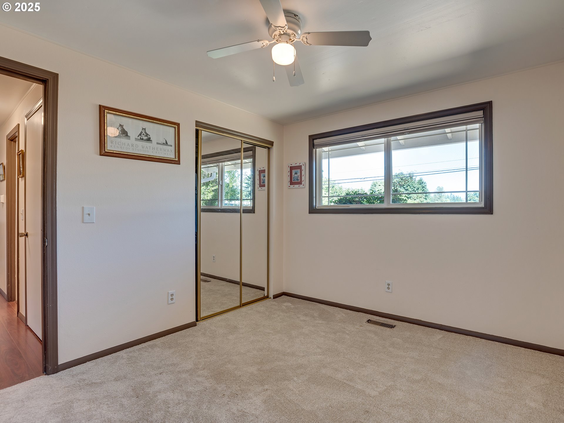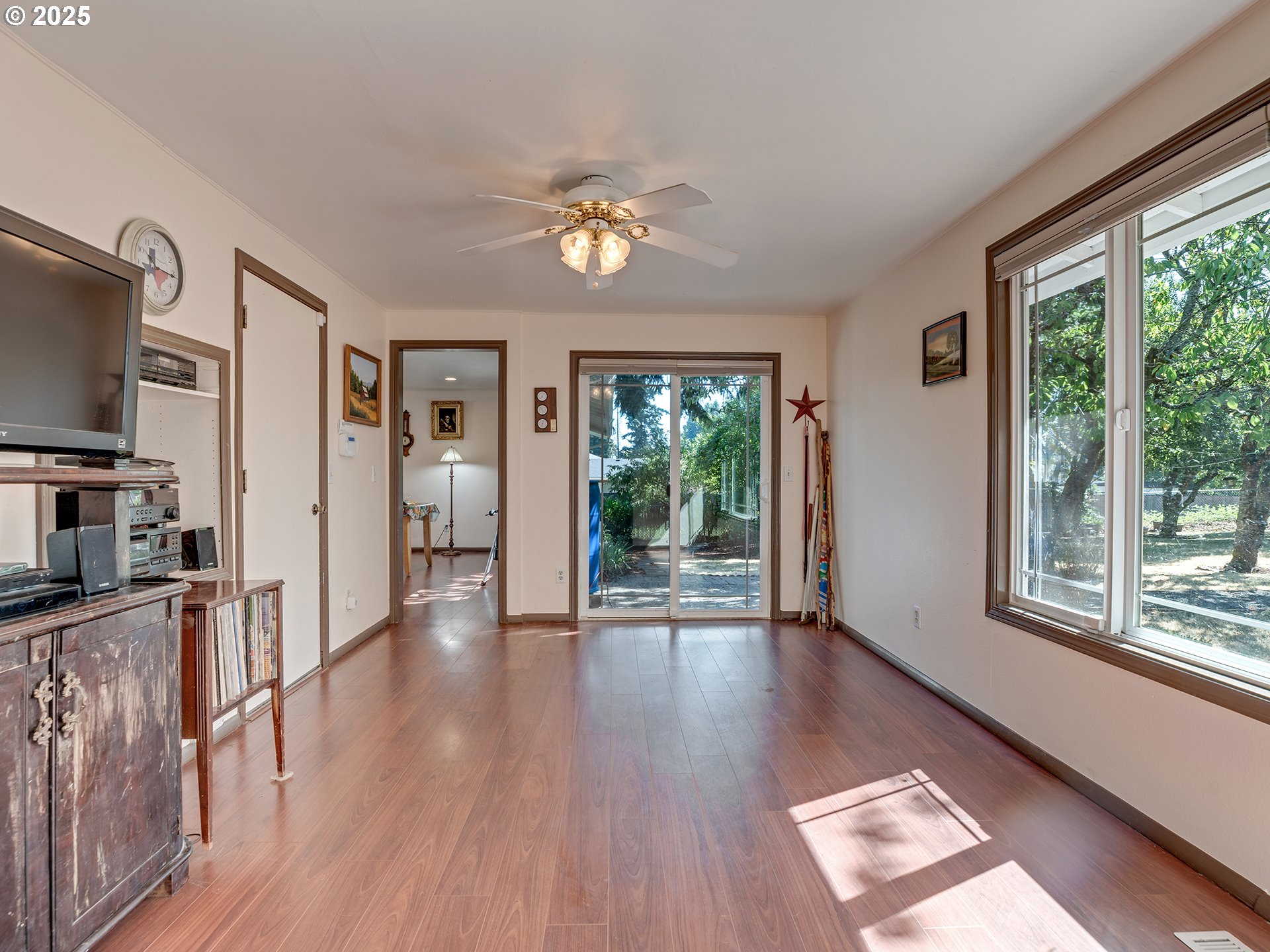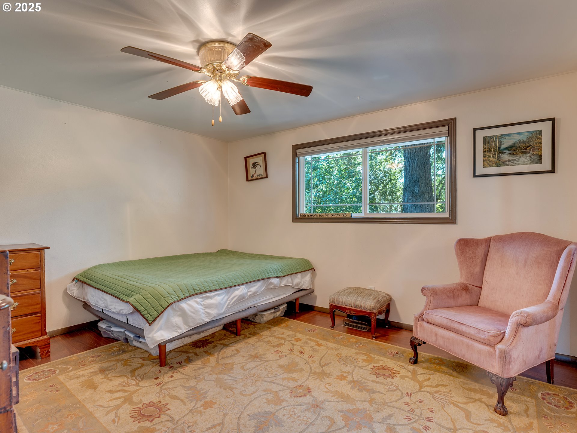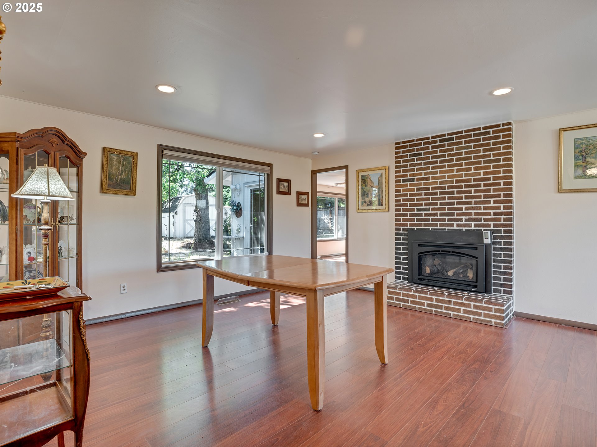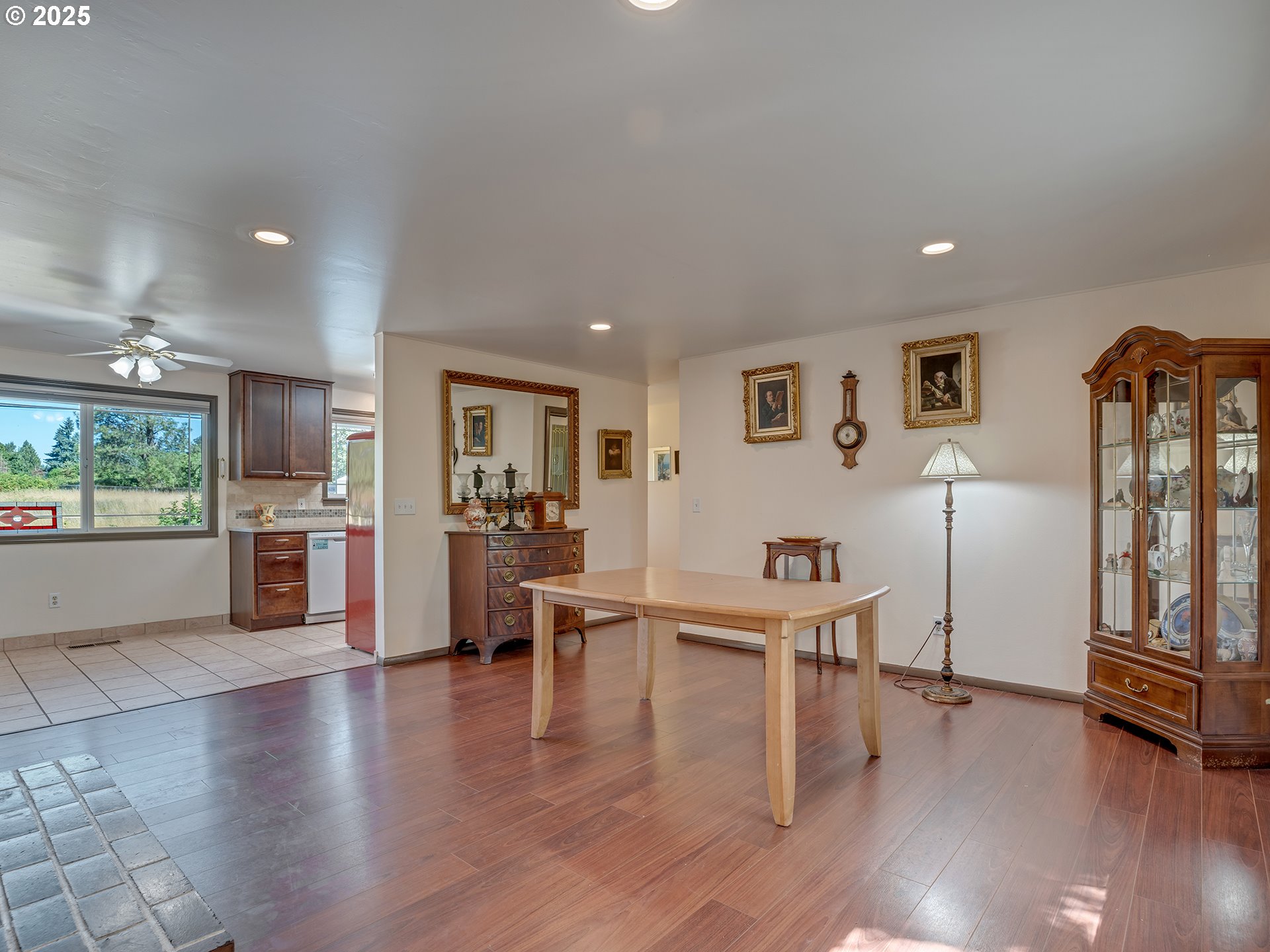 Excellent single level home in the popular Finnegans neighborhood on a wonderful, lusciously landscaped large (0.28 acre) private lot surrounded by greenspace on three sides and with flowers galore and multiple fruit trees including apples, plums, cherries, a grape arbor and a filbert tree! This bountiful lot also has the convenience of a circular driveway, backyard patio and two sheds (12x16 & 12x8) for ample outdoor storage. Inside the easy flow floorplan consists of three bedrooms (two with new carpeting as of June 2025), two bathrooms, an extended kitchen for either additional work/storage space or an eat-in option. Use the center room for either a living room or dining room with a cozy fireplace and the additional room as you wish for bonus space. Other features include mostly solid surface floors, double paned vinyl windows with newer blinds throughout (approx 2019), updated kitchen in 2019 (with quartz countertops, soft close cabinets and drawers and pull out shelves), updated bathroom in 2025, water heater approx 6yrs old, HVAC (with central A/C) approx 4yrs old, newer roof (2025), updated paint inside and out (approx 2019), updated canned lighting added in 2024, crawlspace refresh including Visqueen vapor barrier and insulation (2024). Home also comes with a newer Generac generator and is part of the Clackamas River Water District. Annual HOA dues of $79/year are for greenspace and park/rec facility maintenance only.