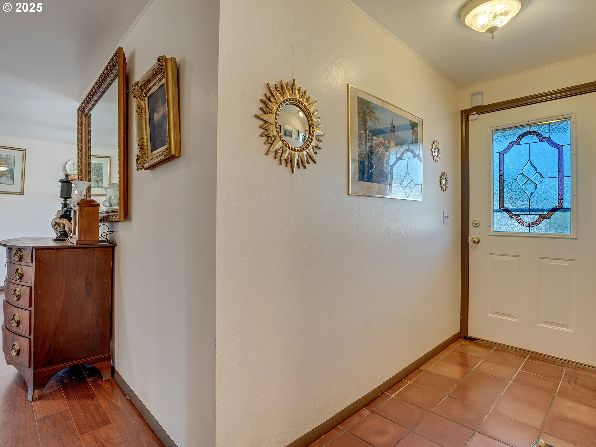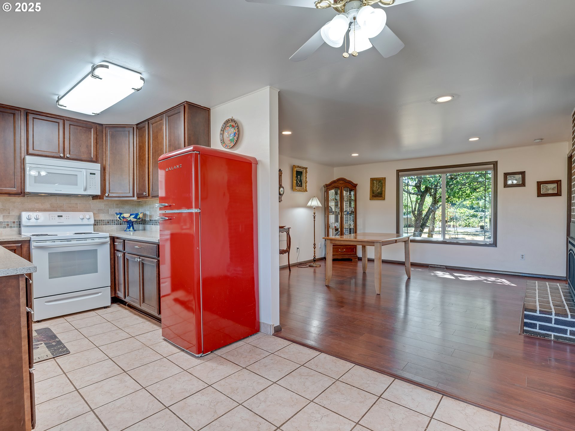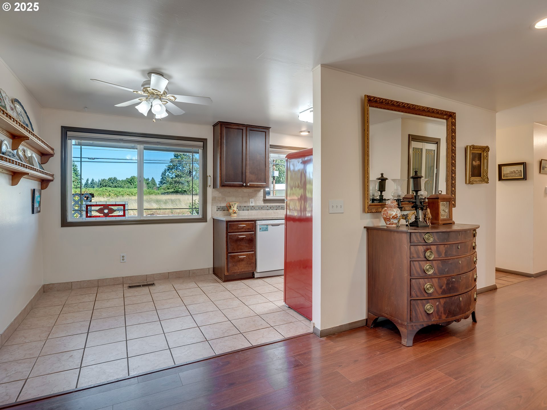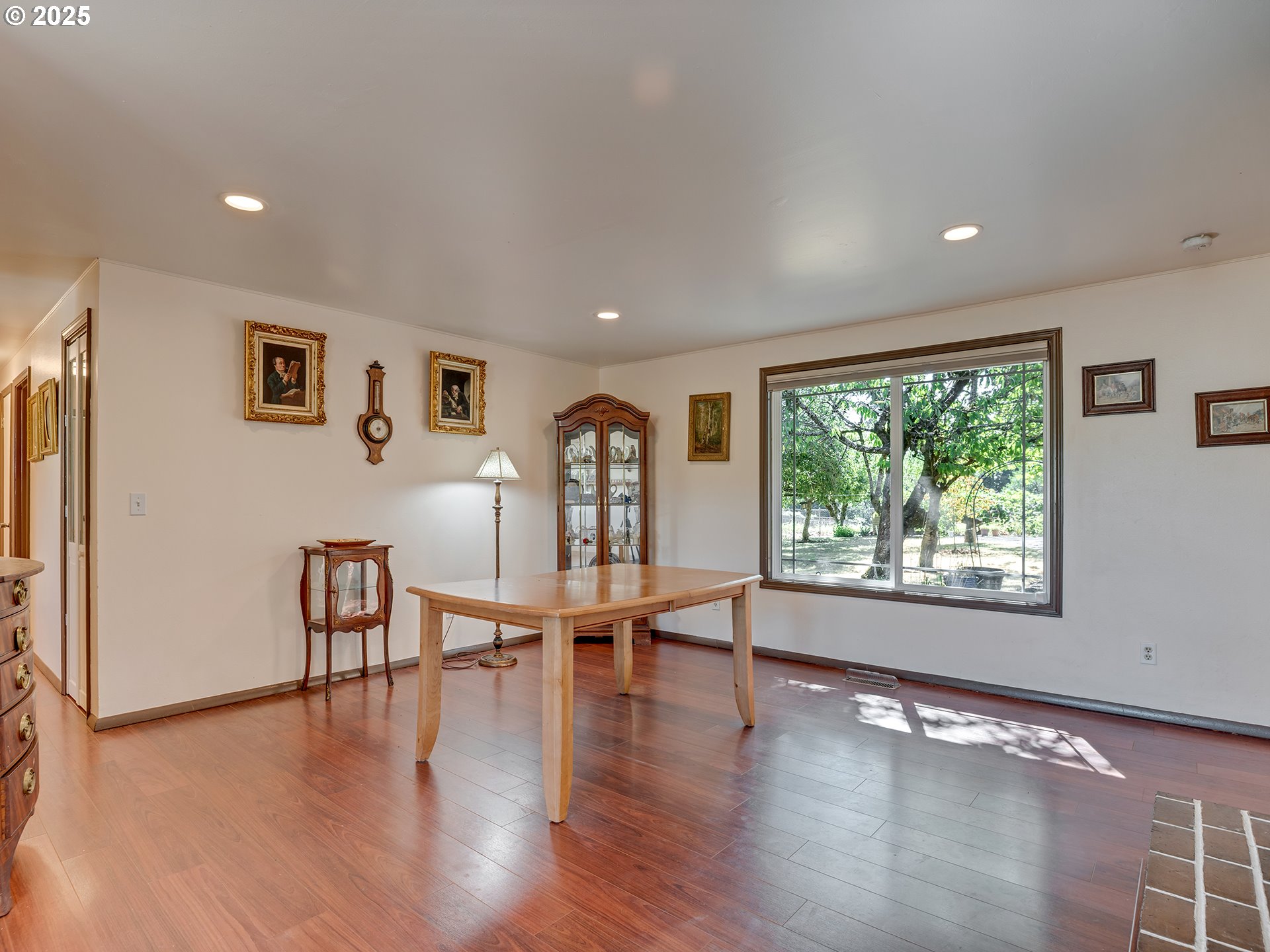 Excellent single level home in the popular Finnegans neighborhood on a wonderful, lusciously landscaped large (0.28 acre) private lot surrounded by greenspace on three sides and with flowers galore and multiple fruit trees including apples, plums, cherries, a grape arbor and a filbert tree! This bountiful lot also has the convenience of a circular driveway, backyard patio and two sheds (12x16 & 12x8) for ample outdoor storage. Inside the easy flow floorplan consists of three bedrooms (two with new carpeting as of June 2025), two bathrooms, an extended kitchen for either additional work/storage space or an eat-in option. Use the center room for either a living room or dining room with a cozy fireplace and the additional room as you wish for bonus space. Other features include mostly solid surface floors, double paned vinyl windows with newer blinds throughout (approx 2019), updated kitchen in 2019 (with quartz countertops, soft close cabinets and drawers and pull out shelves), updated bathroom in 2025, water heater approx 6yrs old, HVAC (with central A/C) approx 4yrs old, newer roof (2025), updated paint inside and out (approx 2019), updated canned lighting added in 2024, crawlspace refresh including Visqueen vapor barrier and insulation (2024). Home also comes with a newer Generac generator and is part of the Clackamas River Water District. Annual HOA dues of $79/year are for greenspace and park/rec facility maintenance only.
