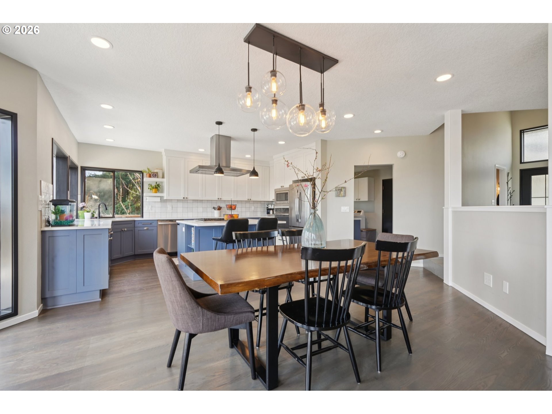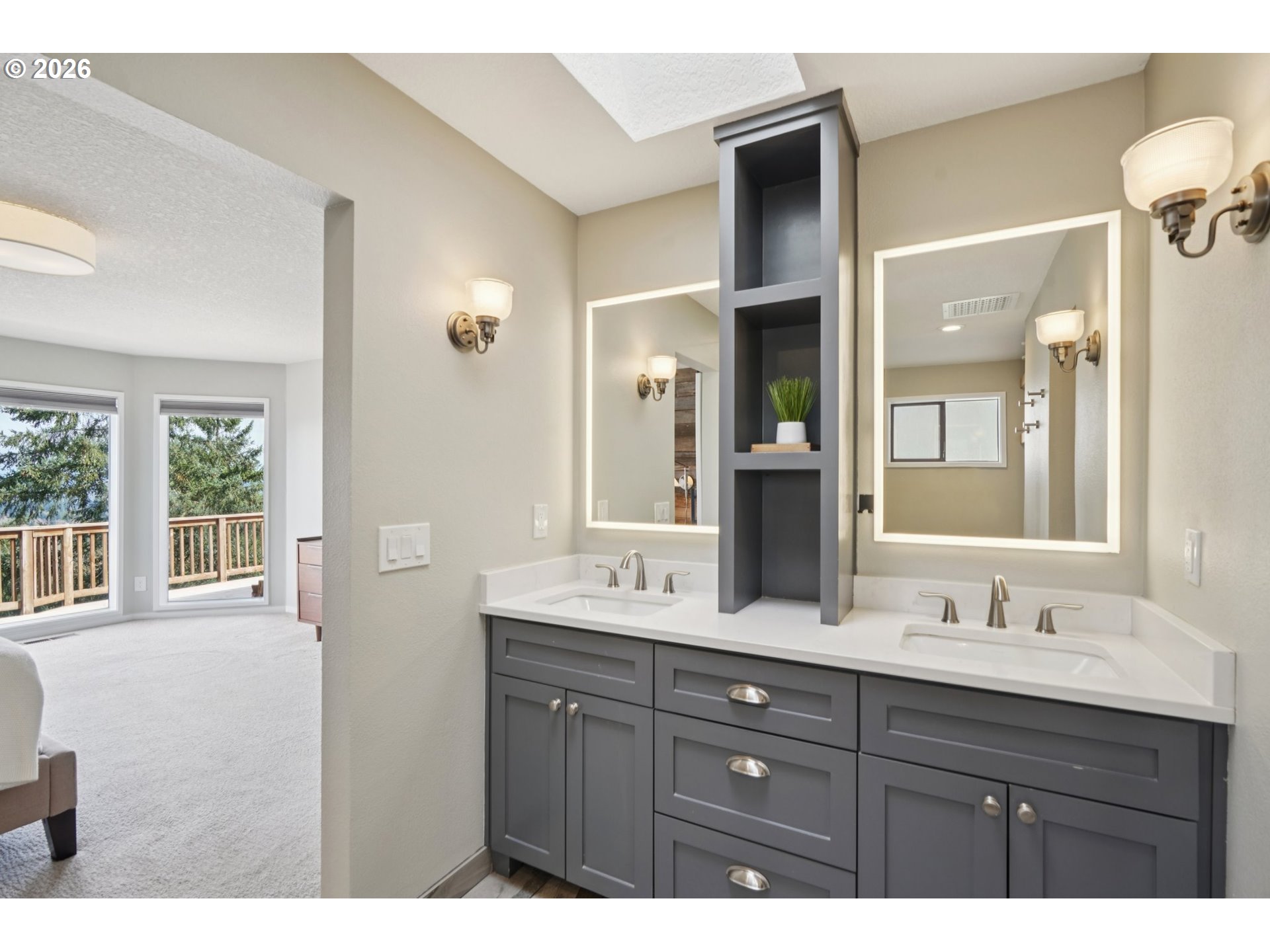 Sweeping territorial, city, and mountain views take center stage in this beautifully updated contemporary home in West Linn’s desirable Hidden Springs neighborhood. Designed to capture the scenery, the main level features vaulted ceilings, skylights, hardwood floors, and a spacious great room that opens to the deck—perfect for enjoying the incredible outlook year-round.The updated kitchen offers quartz countertops, stainless steel appliances (including refrigerator), an island, pantry, and generous storage. The primary suite features a walk-in closet with organizer, stylish barn door detail, walk-in shower, and custom blackout/privacy shades. Two additional bedrooms include wall-to-wall carpet and closet organizers, and all bathrooms have been recently updated. Outdoor living is just as inviting with a view deck featuring exterior UV shades, a fenced yard, and workshop space. Additional updates include a new roof, new energy-efficient front door with transom and sidelight privacy glass, new furnace, central A/C, forced air gas heating, public water and sewer, and an attached garage with driveway parking. Conveniently located near parks, schools, and everyday amenities. Mortgage savings may be available for buyers of this listing.