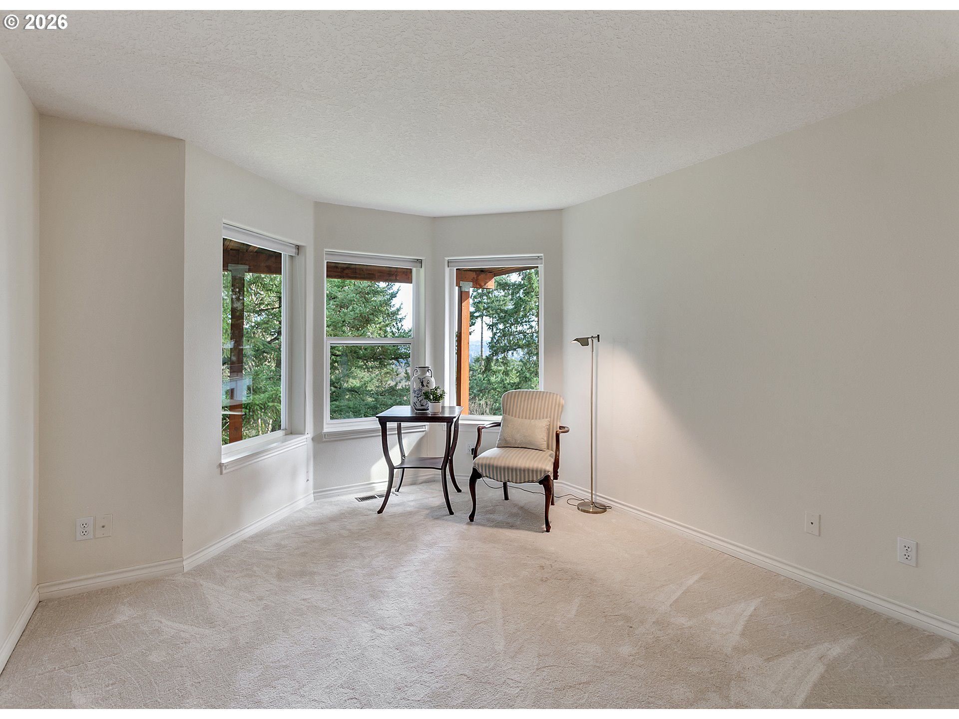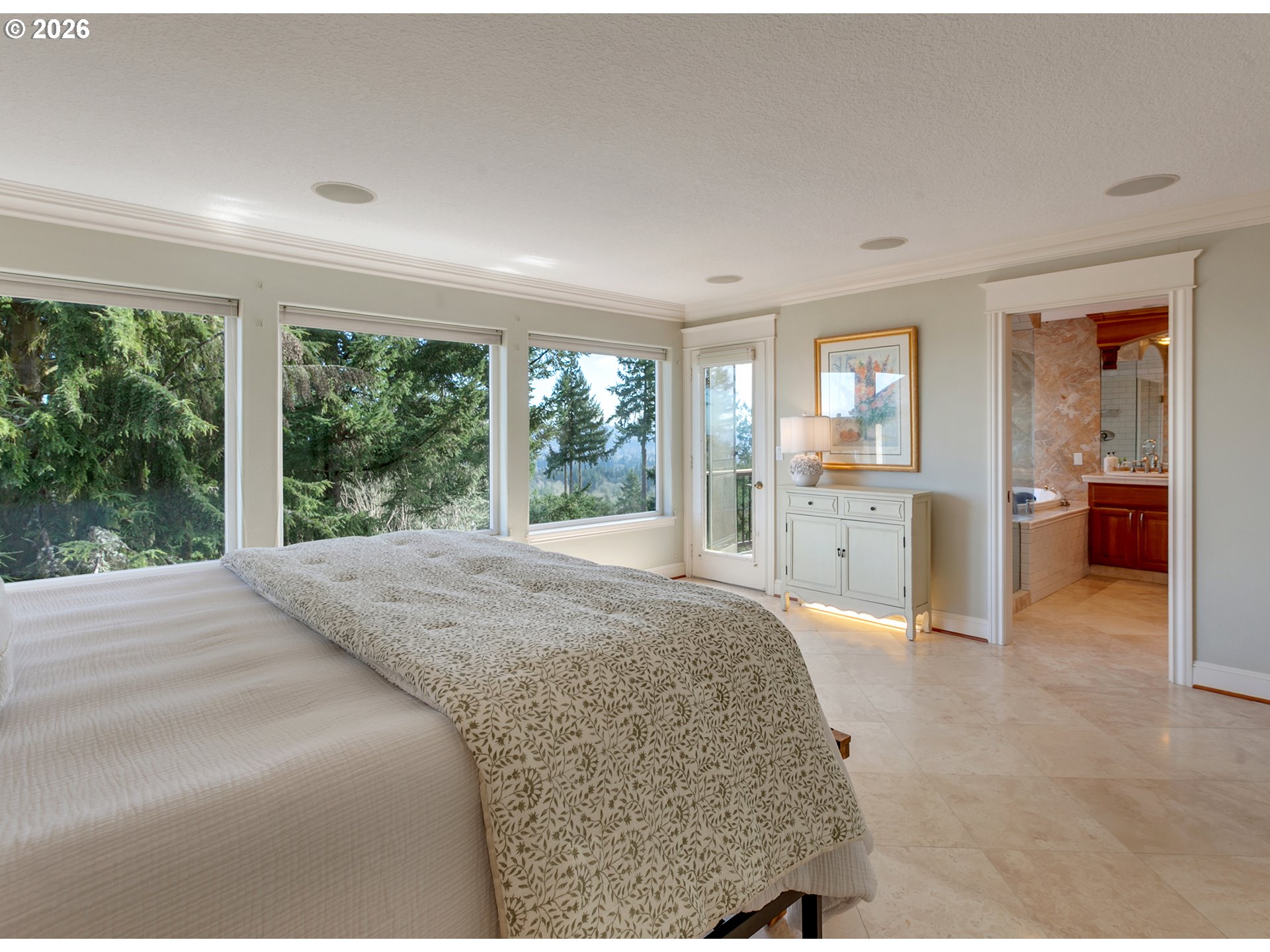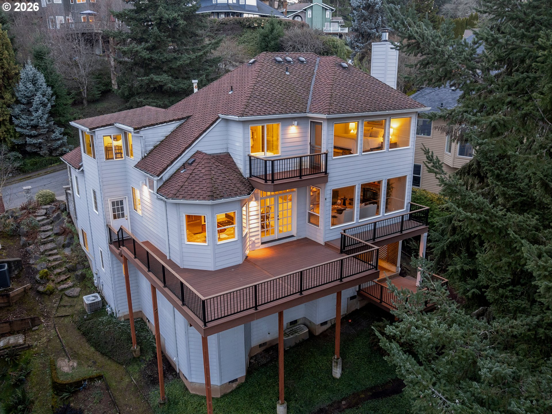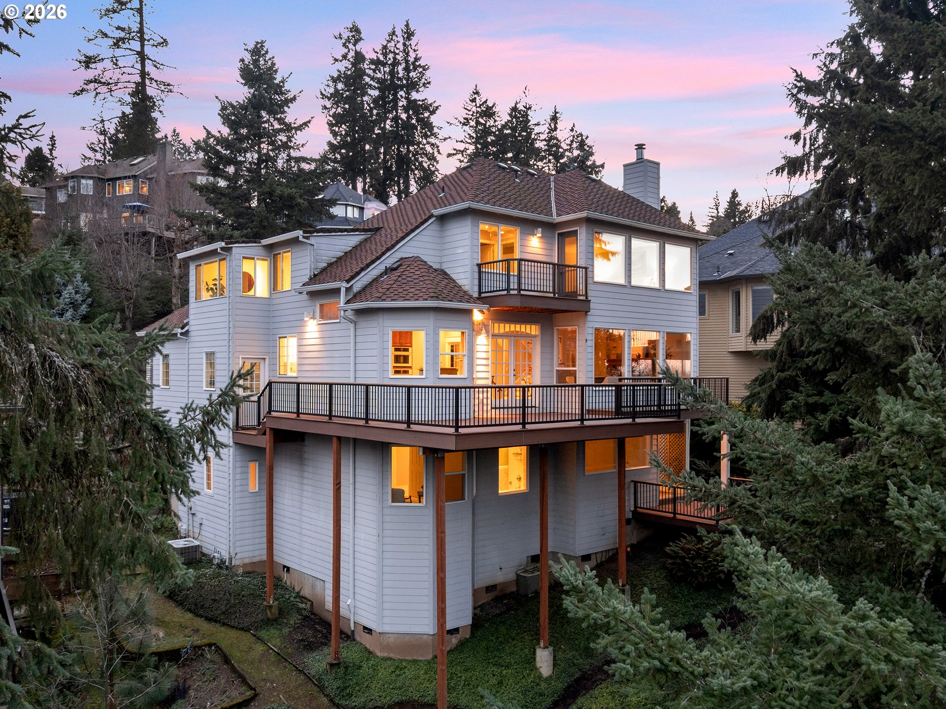 OPEN SUNDAY 3/8 FROM 12-2 PM! Perched in a peaceful, elevated setting with sweeping 180-degree mountain, valley, and city views, this beautifully maintained home blends timeless architecture with exceptional livability. A dramatic two-story entry welcomes you into expansive living spaces framed by oversized windows that flood the home with natural light while capturing the surrounding trees and skyline. The spacious great room showcases a striking stone fireplace and flows seamlessly into the dining area and kitchen, while French doors open to an impressive oversized deck, creating the perfect environment for entertaining or quiet mornings taking in the view.The kitchen features rich wood cabinetry, quality finishes, a walk-in pantry, and a bay window with a view. Retreat to the luxurious primary suite occupying the entire upper level, complete with panoramic windows, a spa-inspired bath, private deck, and generous space for the ultimate closet design, with washer and dryer hookups already in place. Flexible bonus and office spaces provide room to live, work, and host with ease, while abundant storage inside and out keeps everything effortlessly organized. Perfectly landscaped lighted trails wind down the property for exploring and enjoying the natural Oregon beauty. With its private feel, thoughtful layout, and rare view presence, this home captures the very best of Northwest living.