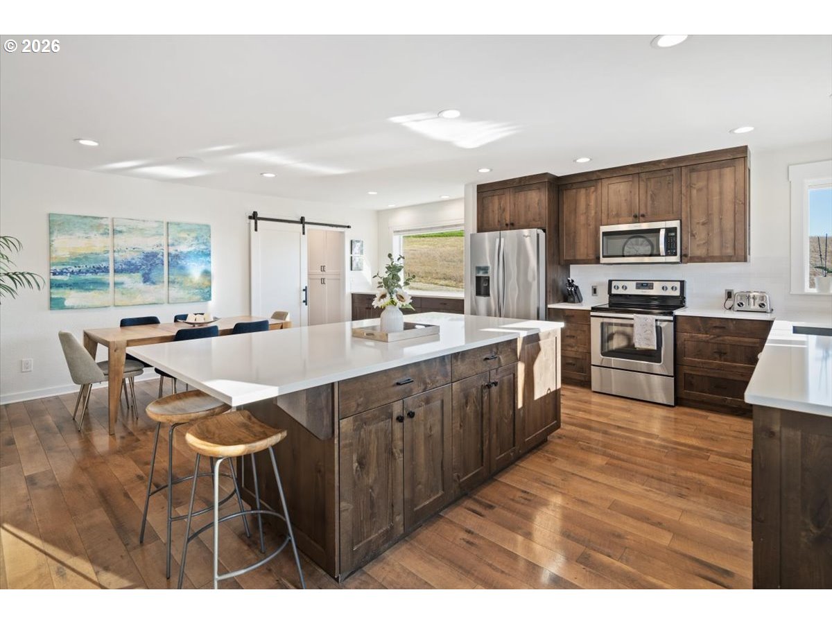 (503) 893-8874Set behind a private drive on flat, fully usable acreage in the coveted Hamlet area of Stafford, this home captures the privacy and scale that define true Stafford living. Spanning over 4,000 sq ft, the floor plan centers on true main level living with flexibility without compromise. Main living spaces are defined by vaulted ceilings, exposed beam detail, and walls of windows that frame unobstructed westerly views and fill the interior with natural light. Sliding doors off the living room open to a covered deck designed for year round enjoyment and effortless indoor outdoor connection. The spacious primary suite on the main level feels expansive yet serene, with direct deck access and a soaking tub intentionally placed within its own picture frame view of the landscape beyond. A generous walk in closet with custom built ins and a dedicated laundry area is thoughtfully incorporated for seamless daily living, elevating the suite into a true private retreat. The kitchen anchors both gathering and daily function with substantial island seating, abundant cabinetry, and seamless flow into dining and living areas. Downstairs, additional bedrooms, a full bathroom, a generous family or bonus room, and a dedicated home gym expand the home’s versatility and function. A separate upper wing with kitchen, bath, and laundry offers a fully self contained living space with exceptional versatility. Meaningful updates reflect attentive ownership, including newer mechanical systems and roof. An oversized four car garage, detached shop, and substantial mudroom and laundry off the garage complete this exceptional offering. Usable acreage allows for gardens, recreation, or future expansion, including space for a pool. The grounds provide both openness and privacy, creating true separation from neighboring properties. A property where scale, usability, and design align.