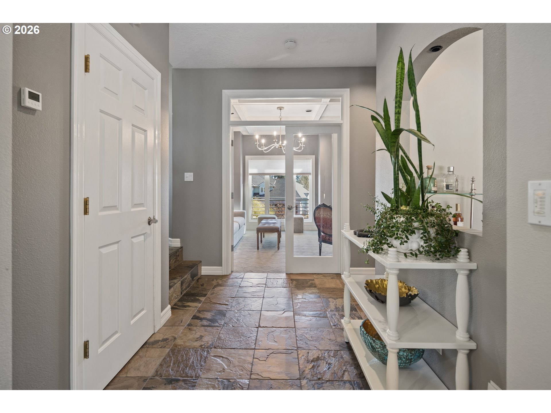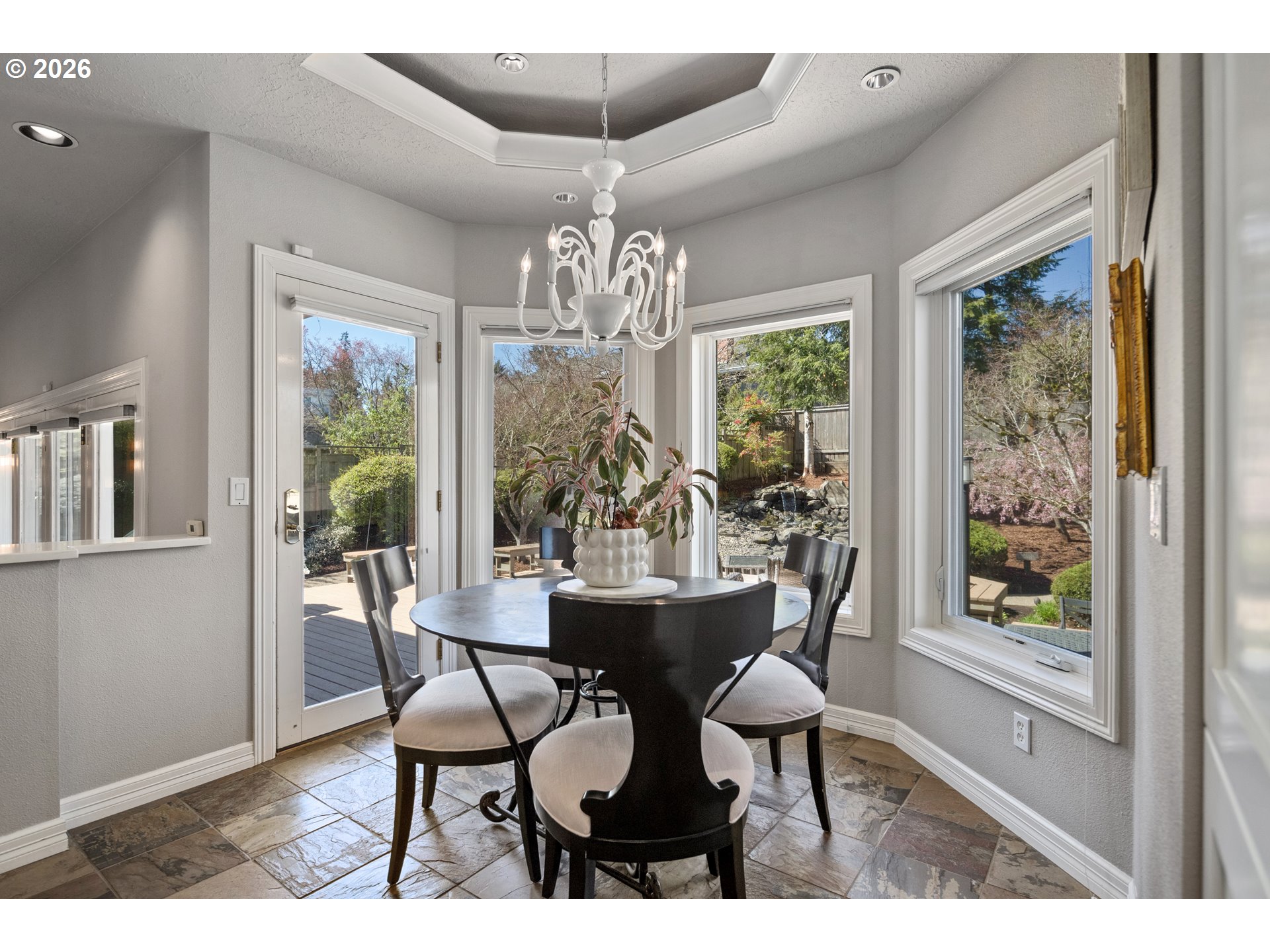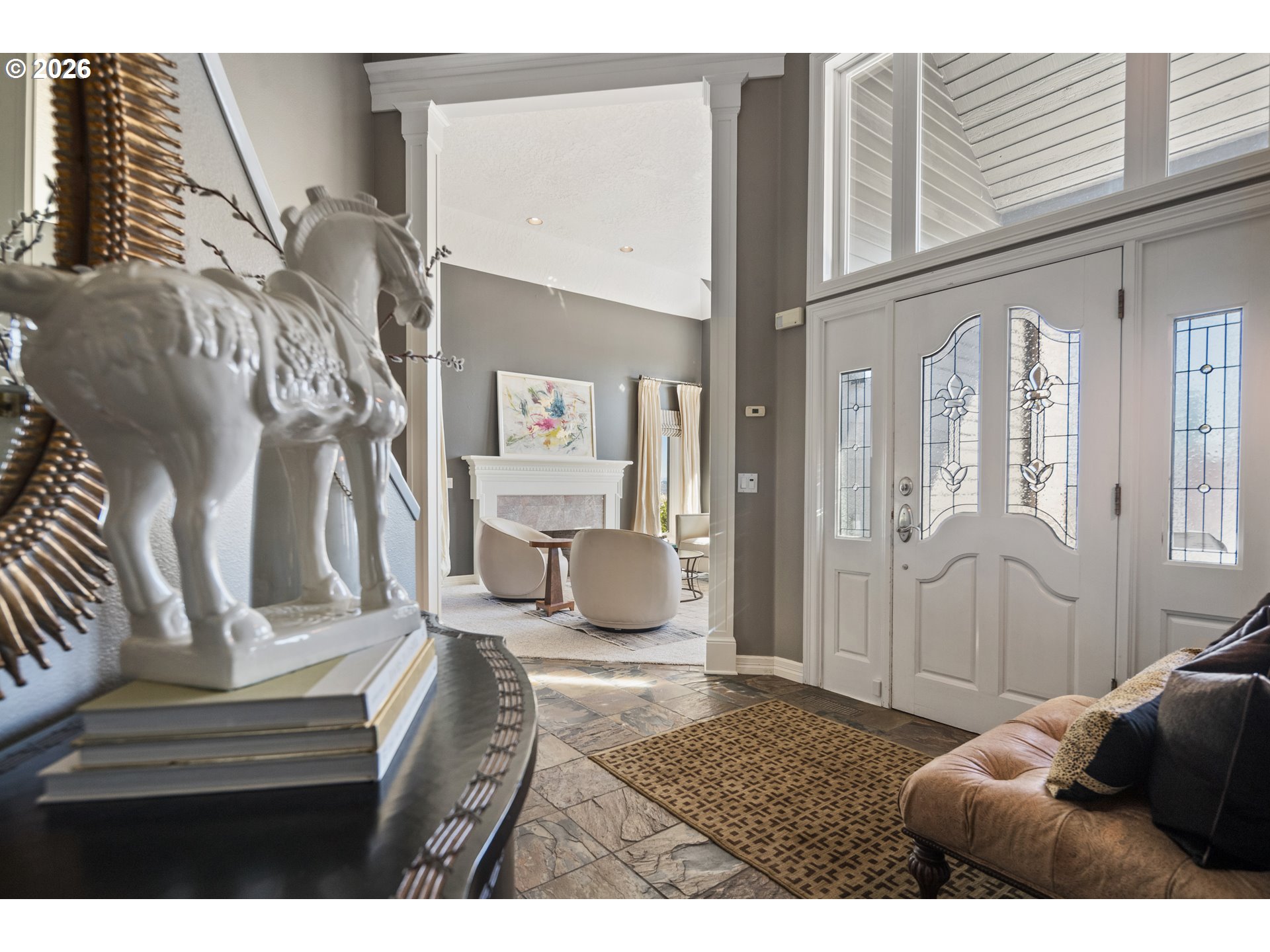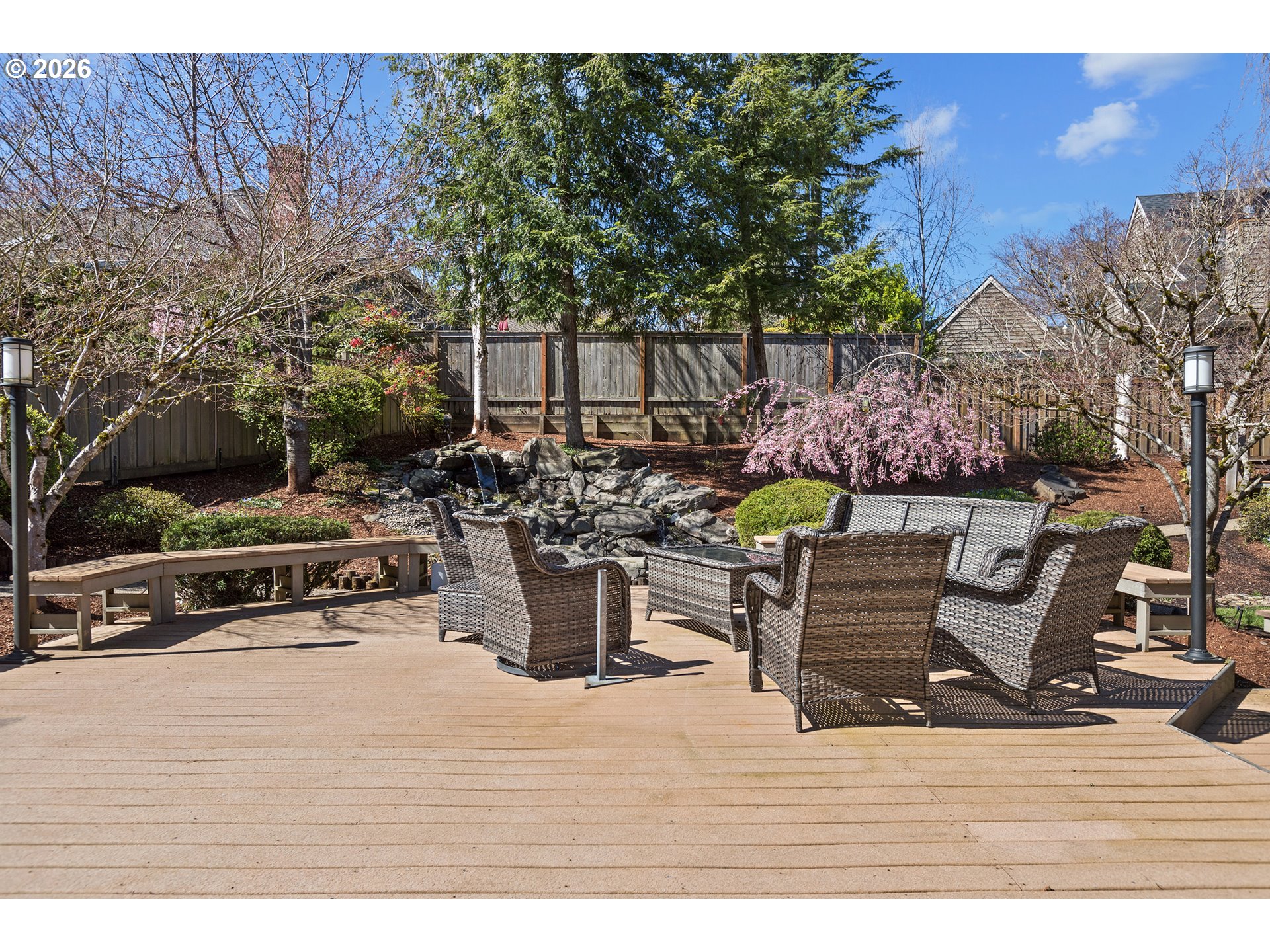 (503) 893-8874Located in the scenic hills of West Linn, this Northwest Contemporary home pairs thoughtful architectural detail with an extraordinary outdoor setting. An expansive Trex deck overlooks a private, impeccably landscaped backyard, where a winding path leads past a stone waterfall and blooming cherry tree to a garden pergola - a beautifully considered outdoor space equally suited to lively gatherings and quiet afternoons. Inside, a dramatic double-height entry sets the tone. The living room is warmed by a gas fireplace beneath soaring angled tray ceilings and flooded with natural light from a two-story bay window with mountain views. The family room, anchored by a second fireplace with sleek floor-to-ceiling porcelain surround, features french door access to the deck, a dry bar with wine cooler, and recessed tray ceilings that flow into the gourmet kitchen. The kitchen is as stylish as it is functional. Heated slate floors, a farmhouse sink, a quartzite island with additional prep sink, surrounding quartz countertops, and Wolf and Sub-Zero appliances complement a sun-drenched breakfast nook that opens to the back deck. The adjacent dining room, graced with elegant wainscoting and a large picture window, offers access to an additional east-facing deck for evening dinners al fresco with sweeping views of hills and mountains. A home office with a coffered ceiling, a powder room, and a laundry room complete the main floor. In addition to two bedrooms, a full bath, and a generous bonus space, the upper level hosts a spacious primary suite featuring angled tray ceilings, wainscoting, and a sitting area that leads to a private balcony. In the en suite bath, a double vanity complements a soaking tub, a shower with multi-head body spray system, and a walk-in closet. A three-car garage provides ample storage. West Linn is home to top-tier schools, celebrated wineries, and a charming historic main street, all within 30 minutes of downtown Portland.