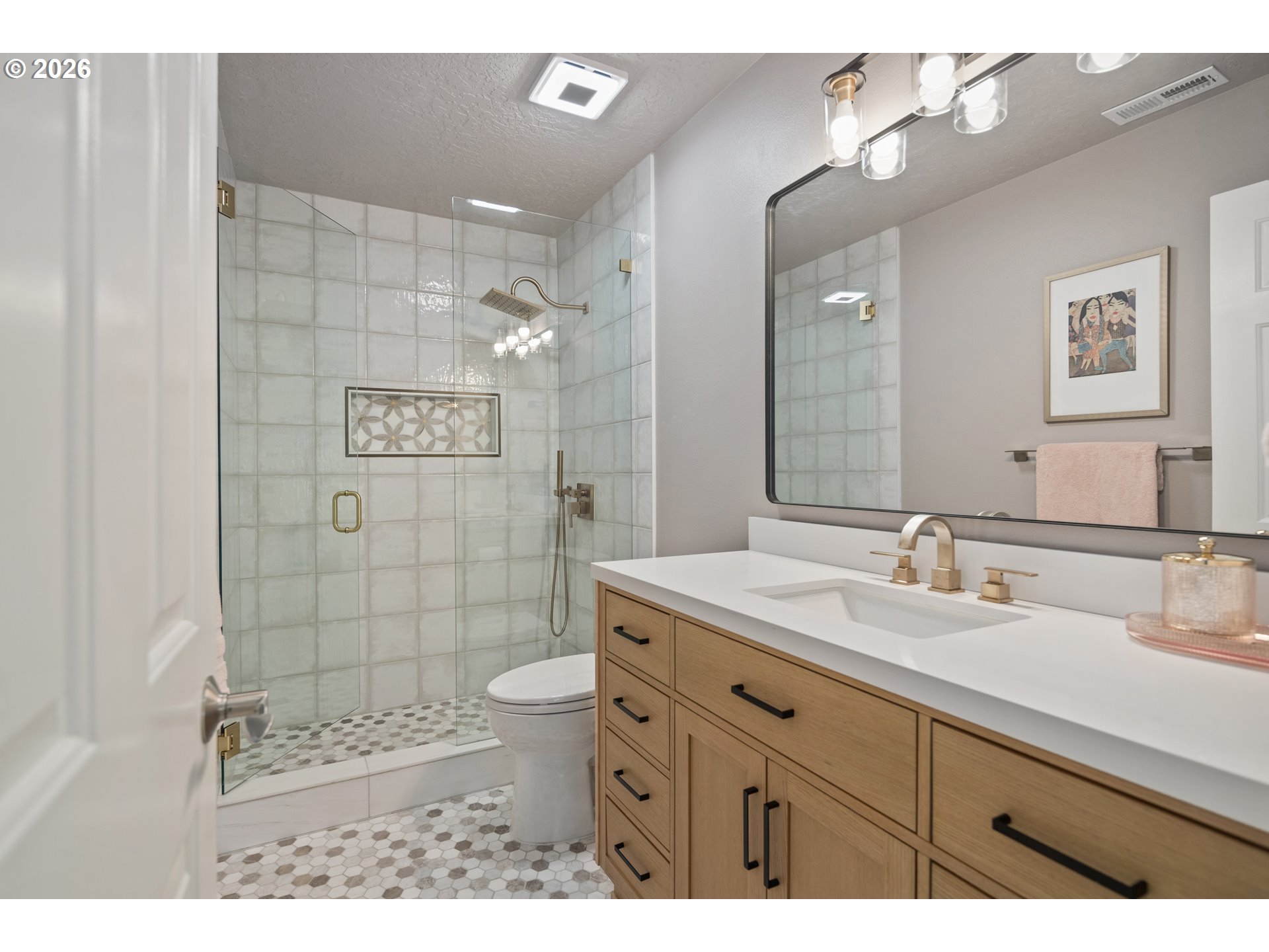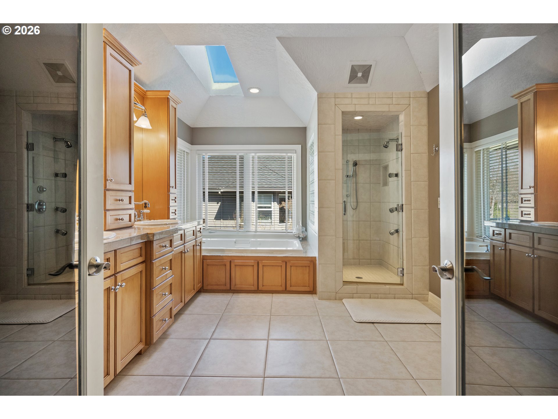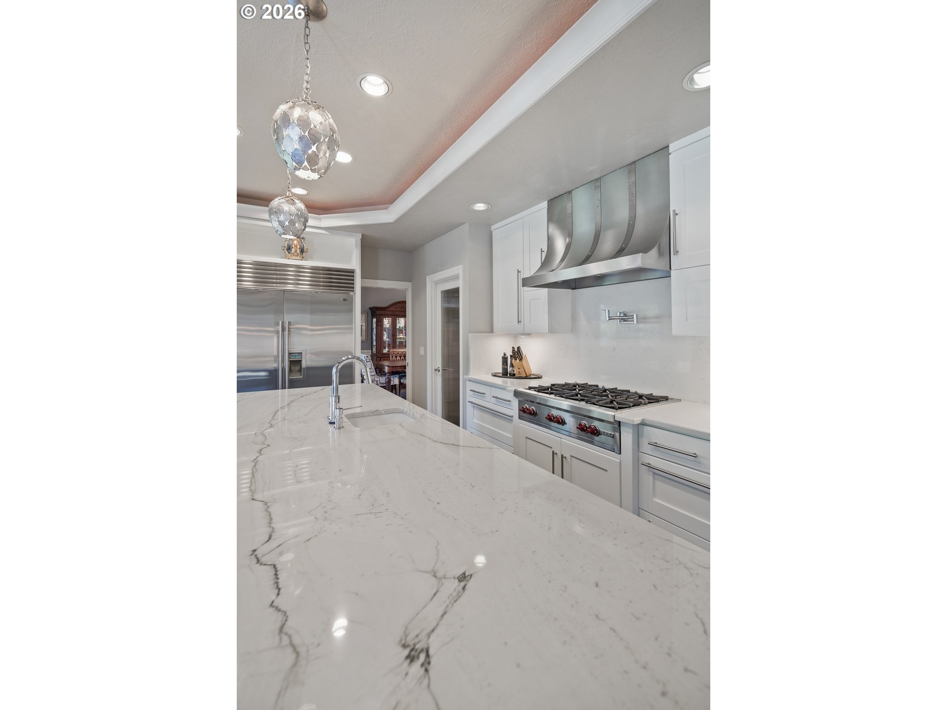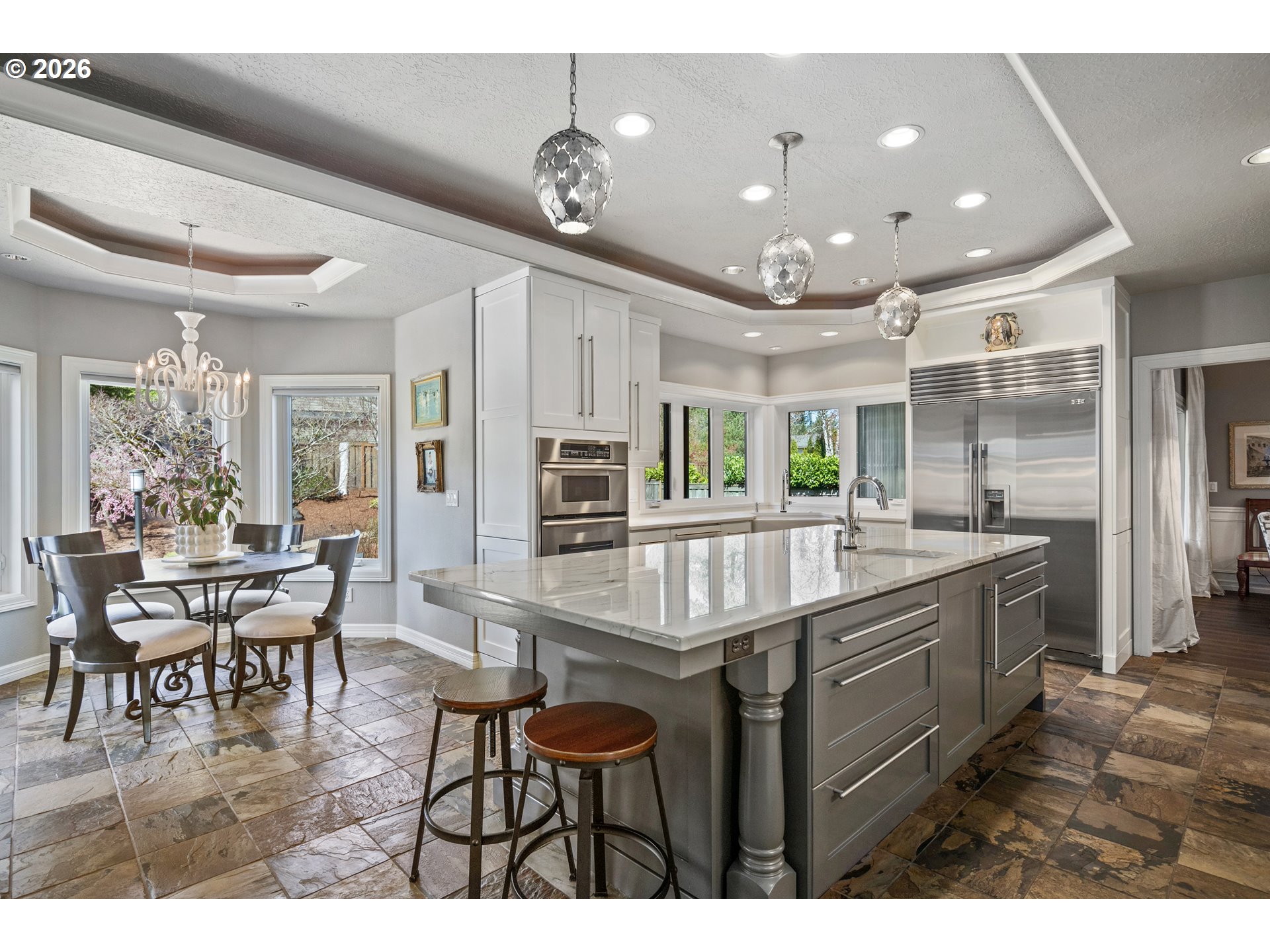 (503) 893-8874Located in the scenic hills of West Linn, this Northwest Contemporary home pairs thoughtful architectural detail with an extraordinary outdoor setting. An expansive Trex deck overlooks a private, impeccably landscaped backyard, where a winding path leads past a stone waterfall and blooming cherry tree to a garden pergola - a beautifully considered outdoor space equally suited to lively gatherings and quiet afternoons. Inside, a dramatic double-height entry sets the tone. The living room is warmed by a gas fireplace beneath soaring angled tray ceilings and flooded with natural light from a two-story bay window with mountain views. The family room, anchored by a second fireplace with sleek floor-to-ceiling porcelain surround, features french door access to the deck, a dry bar with wine cooler, and recessed tray ceilings that flow into the gourmet kitchen. The kitchen is as stylish as it is functional. Heated slate floors, a farmhouse sink, a quartzite island with additional prep sink, surrounding quartz countertops, and Wolf and Sub-Zero appliances complement a sun-drenched breakfast nook that opens to the back deck. The adjacent dining room, graced with elegant wainscoting and a large picture window, offers access to an additional east-facing deck for evening dinners al fresco with sweeping views of hills and mountains. A home office with a coffered ceiling, a powder room, and a laundry room complete the main floor. In addition to two bedrooms, a full bath, and a generous bonus space, the upper level hosts a spacious primary suite featuring angled tray ceilings, wainscoting, and a sitting area that leads to a private balcony. In the en suite bath, a double vanity complements a soaking tub, a shower with multi-head body spray system, and a walk-in closet. A three-car garage provides ample storage. West Linn is home to top-tier schools, celebrated wineries, and a charming historic main street, all within 30 minutes of downtown Portland.