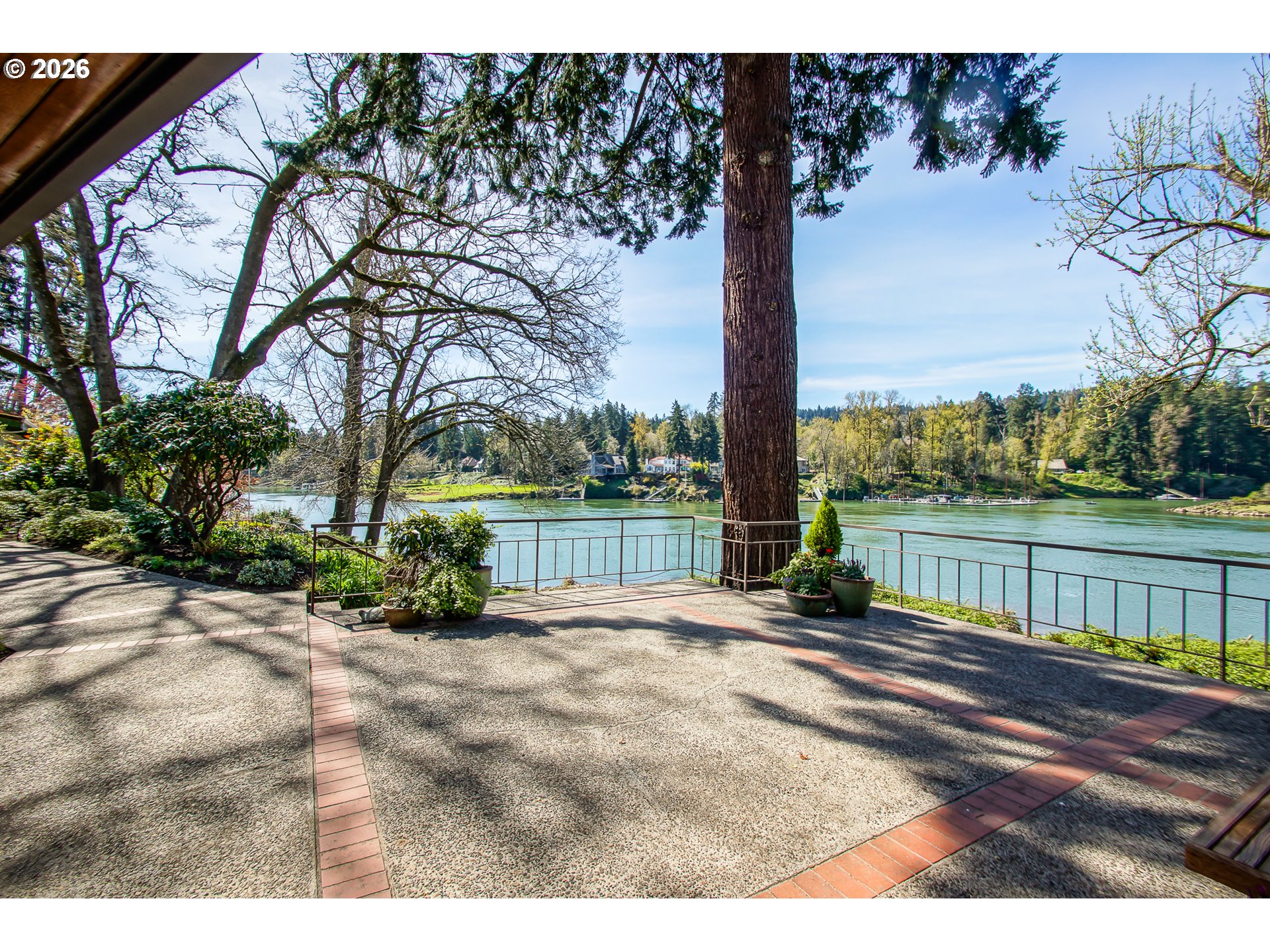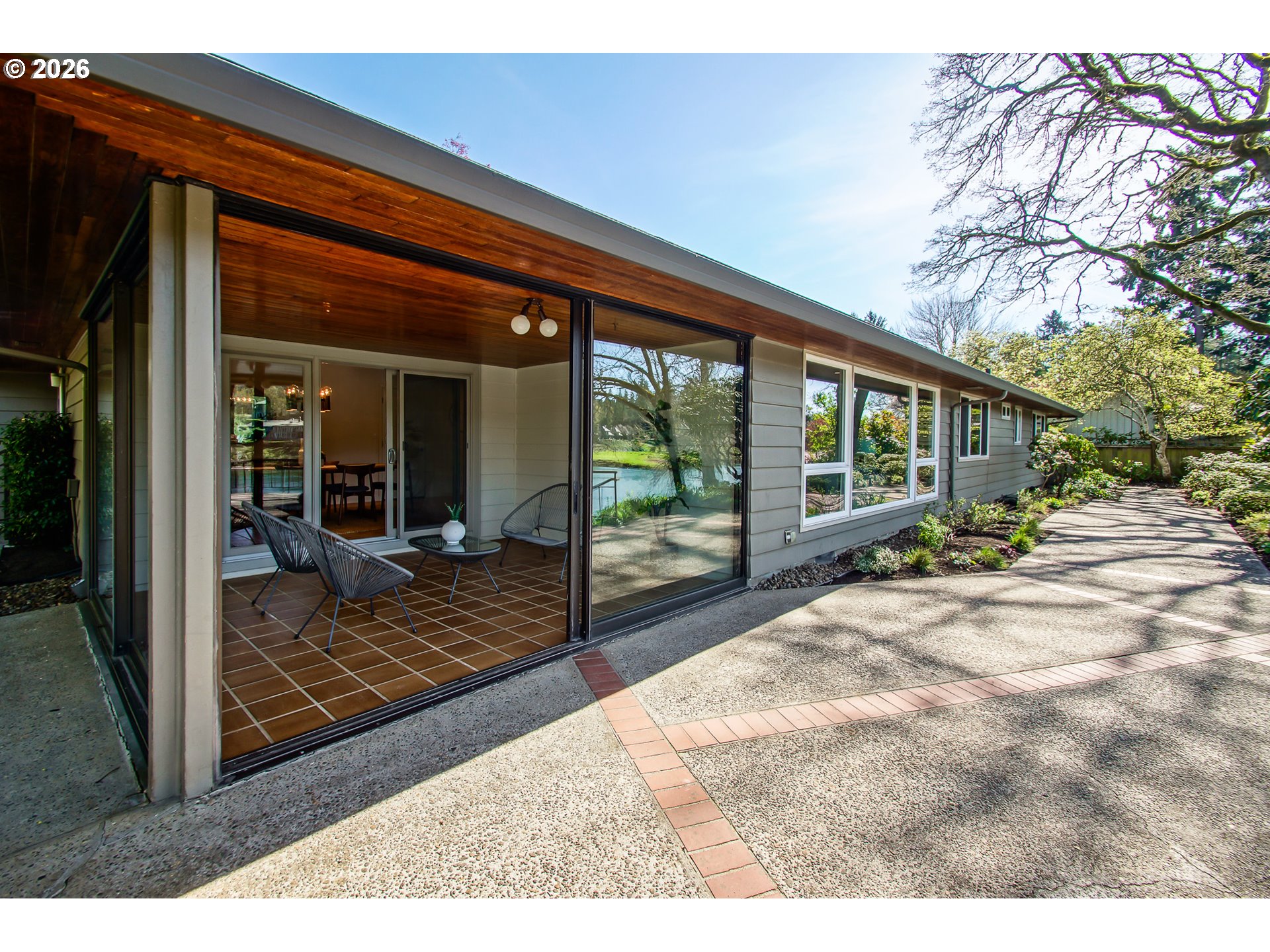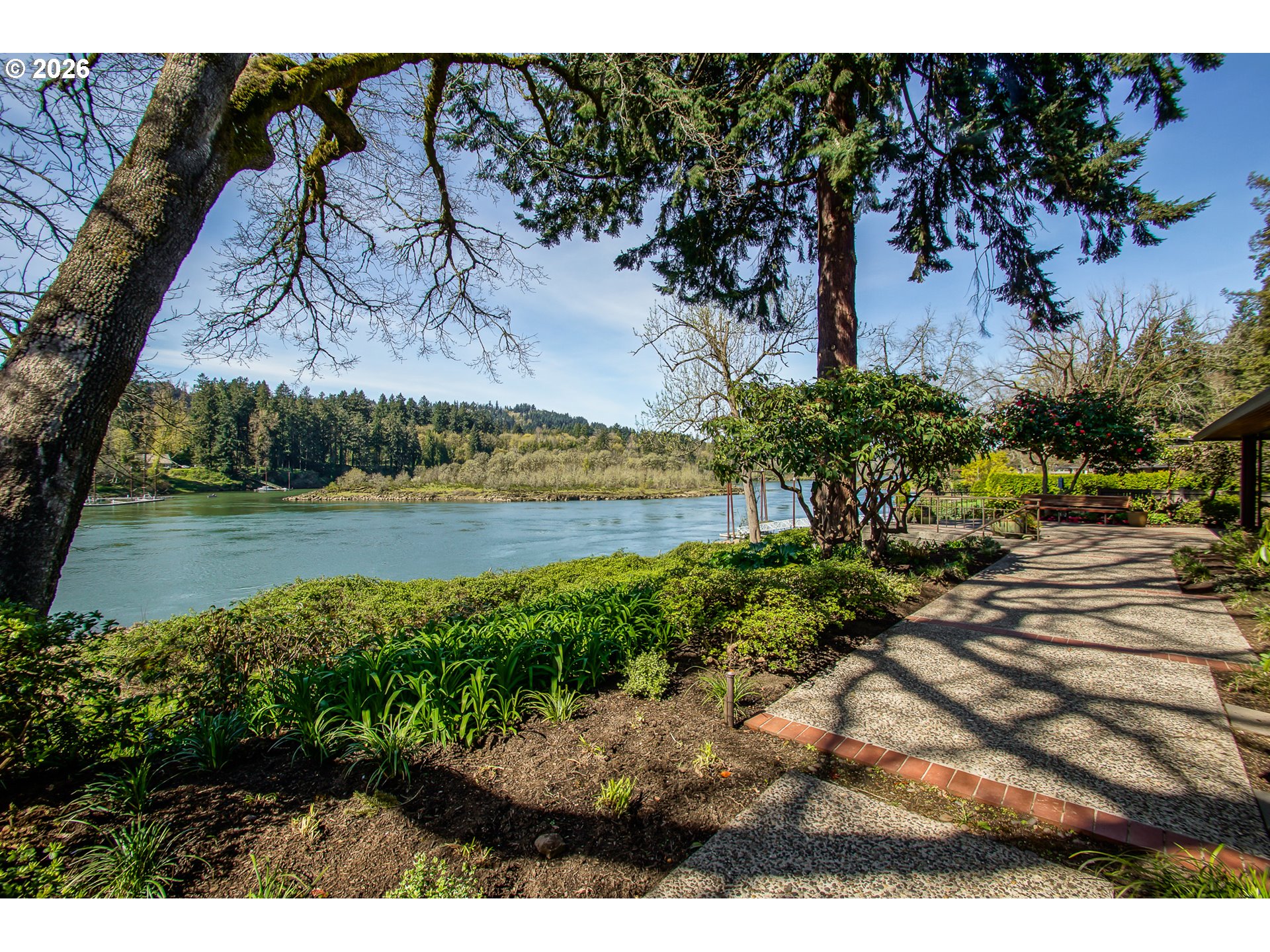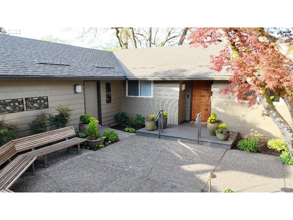 As you enter the courtyard, you know you’ve arrived somewhere special. Set in Riveroaks—one of Milwaukie’s most inviting riverfront neighborhoods—this 1961 MCM delivers easy one-level living with sweeping Willamette River views and a floorplan built for both entertaining and everyday comfort. Walls of windows keep the riverfront setting front and center. Watch osprey and bald eagles, rowers, fishermen and boats drift by. The living and dining rooms connect to a bright sunroom with sliders to a generous terrace, while a dramatic three-sided glass fireplace anchors the main spaces. The kitchen nods to its vintage roots with a built-in double oven set into the hearth, and the large family room offers exceptional storage plus convenient access to the front courtyard for effortless indoor-outdoor living. Four bedrooms are tucked into a private wing with large closets and hardwood floors. The primary suite features an updated, spa-inspired bath with a zero-entry shower; a second updated bath offers a long soaking tub and crisp white tile. Outside, enjoy the NW landscape icon Barbara Fealey–designed landscaping, a custom carved door from another NW icon artist Leroy Setziol’s studio, and a quiet neighborhood park next door. Enjoy easy access to the river for your canoe, kayak or paddleboard. THIS is like being on vacation, but at home. Come see it and you'll get it. Open Sat 12-3 pm and Sun 1-3 pm!