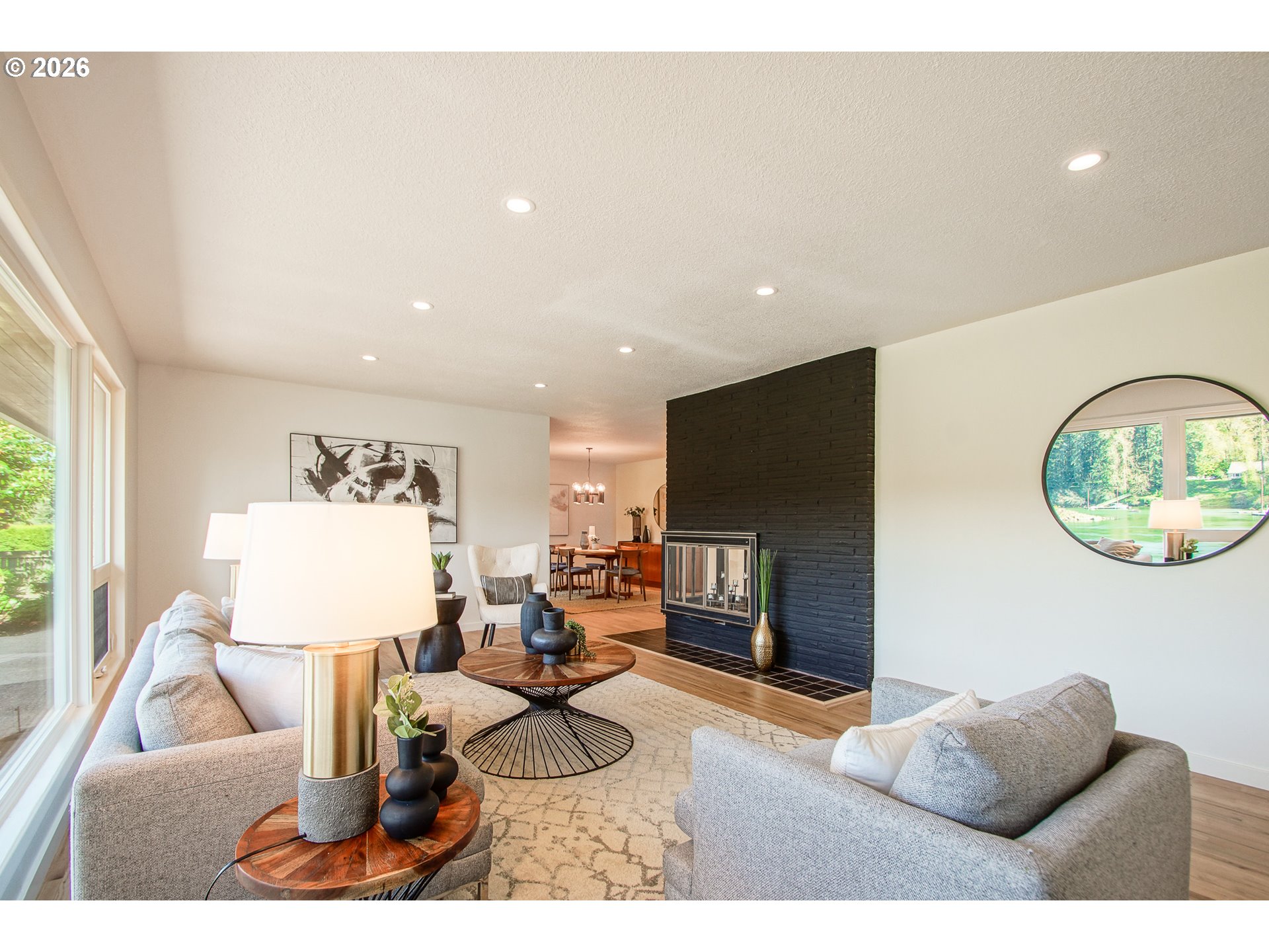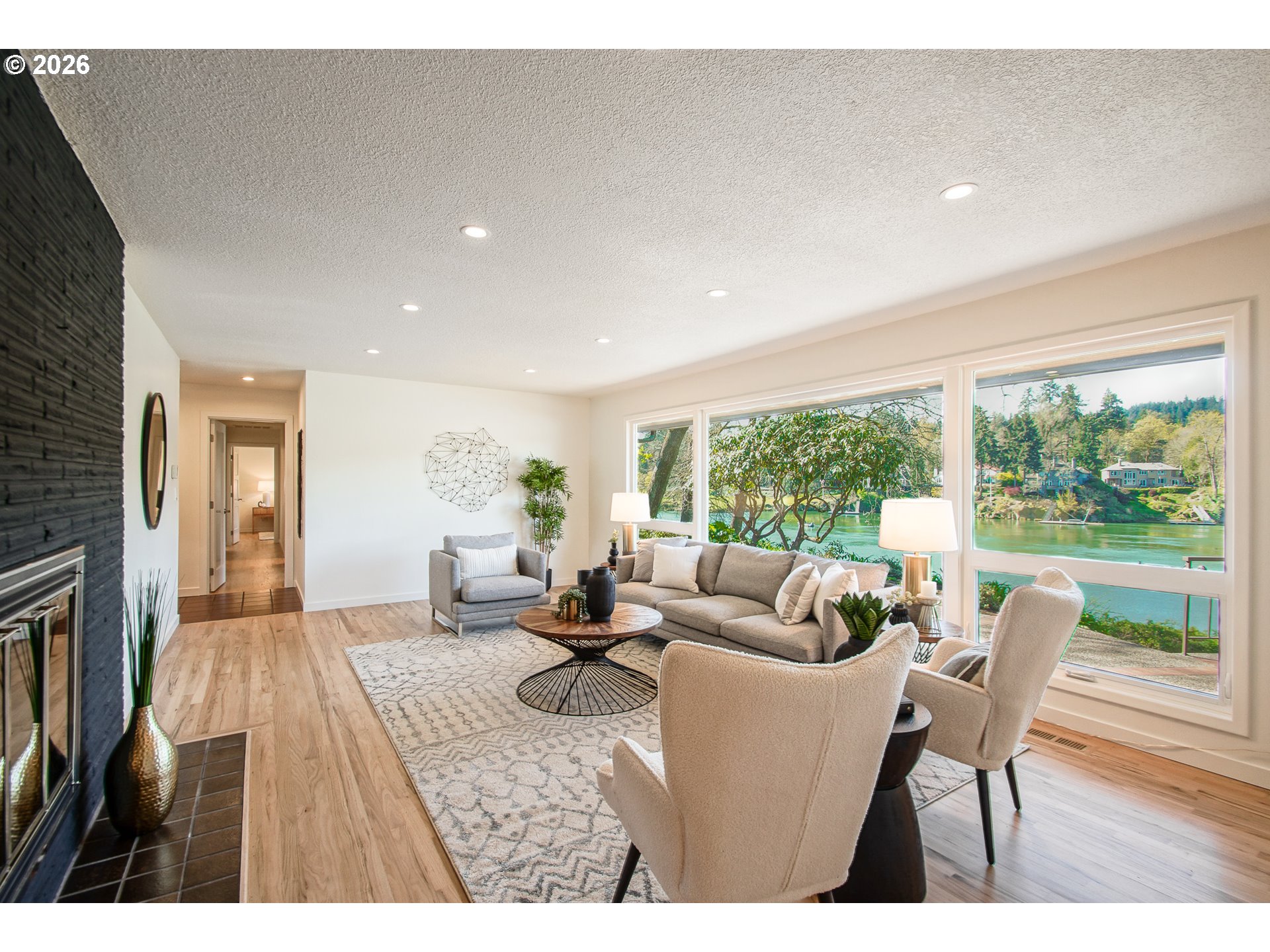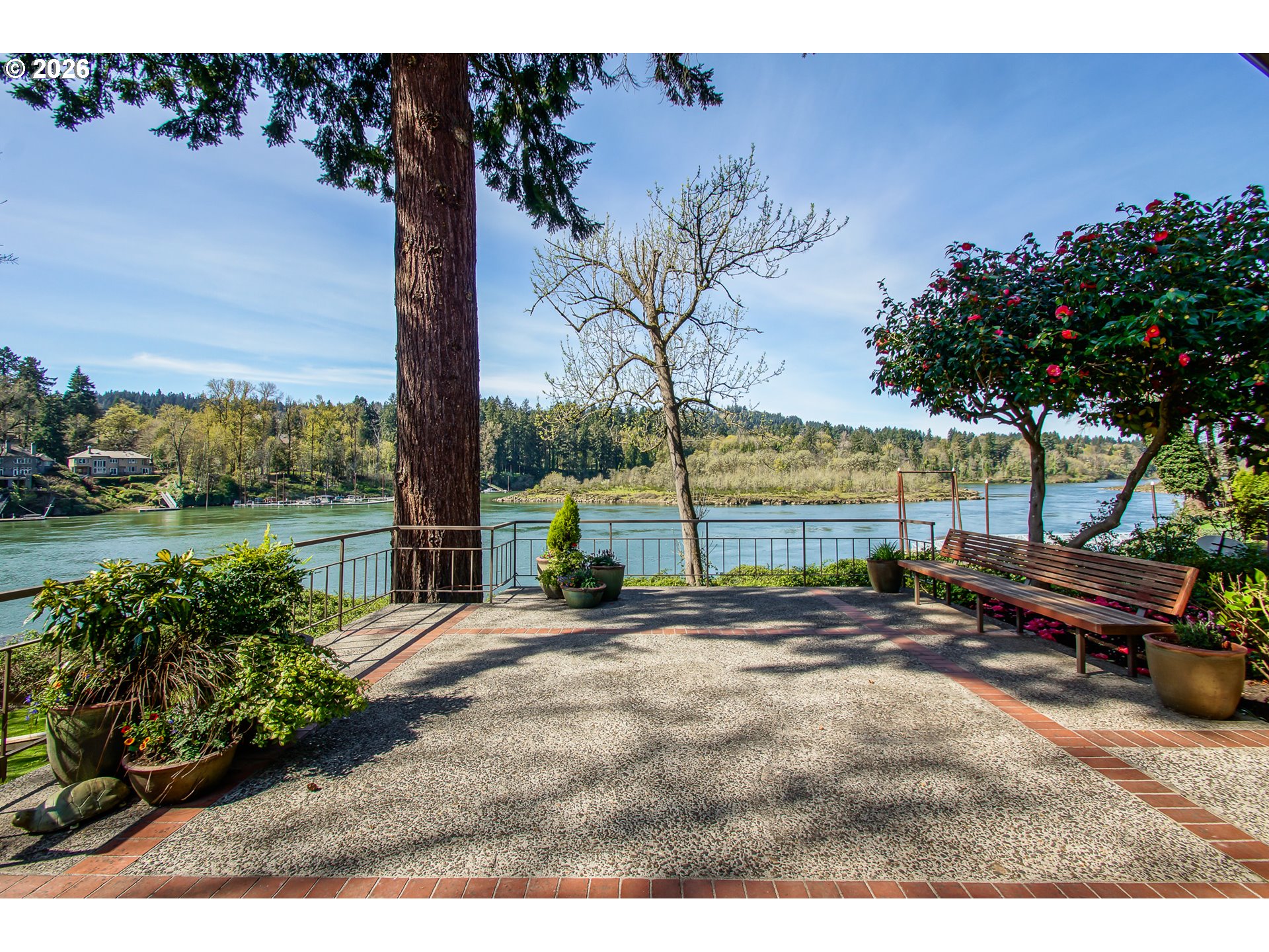 As you enter the courtyard, you know you’ve arrived somewhere special. Set in Riveroaks—one of Milwaukie’s most inviting riverfront neighborhoods—this 1961 MCM delivers easy one-level living with sweeping Willamette River views and a floorplan built for both entertaining and everyday comfort. Walls of windows keep the riverfront setting front and center. Watch osprey and bald eagles, rowers, fishermen and boats drift by. The living and dining rooms connect to a bright sunroom with sliders to a generous terrace, while a dramatic three-sided glass fireplace anchors the main spaces. The kitchen nods to its vintage roots with a built-in double oven set into the hearth, and the large family room offers exceptional storage plus convenient access to the front courtyard for effortless indoor-outdoor living. Four bedrooms are tucked into a private wing with large closets and hardwood floors. The primary suite features an updated, spa-inspired bath with a zero-entry shower; a second updated bath offers a long soaking tub and crisp white tile. Outside, enjoy the NW landscape icon Barbara Fealey–designed landscaping, a custom carved door from another NW icon artist Leroy Setziol’s studio, and a quiet neighborhood park next door. Enjoy easy access to the river for your canoe, kayak or paddleboard. THIS is like being on vacation, but at home. Come see it and you'll get it. Open Sat 12-3 pm and Sun 1-3 pm!