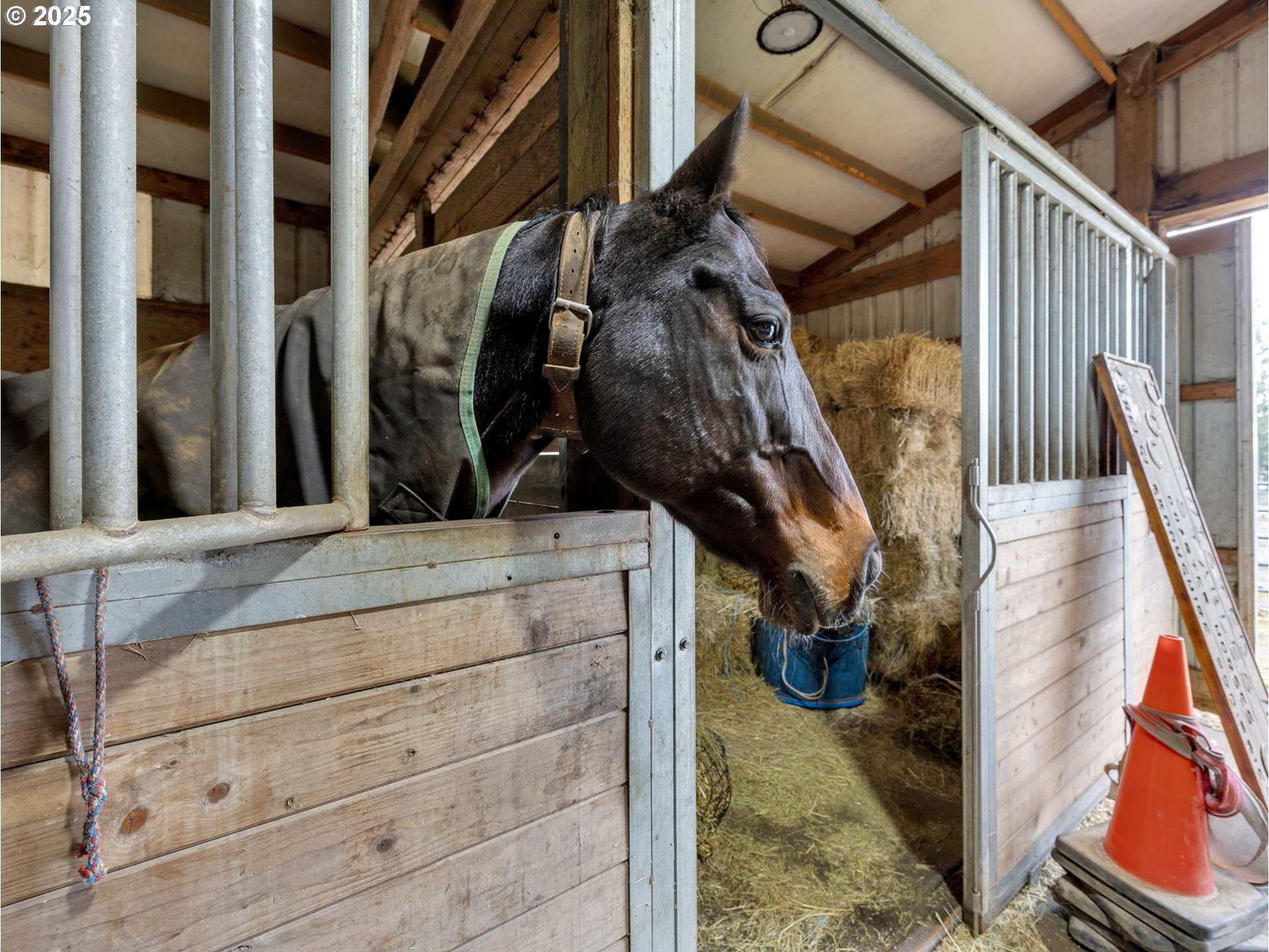 Discover rural living in this 1.5-acre property in Estacada with views over the neighboring pasture. This charming 2-bedroom, 2-bathroom home offers 1,250 square feet of comfortable living space and maximizes use of the size. The heart of the home features a welcoming living room with a cozy pellet stove, ideal for those crisp Oregon evenings. The functional kitchen boasts a convenient peninsula design, flowing seamlessly into the dining area where sliding doors open to a rear deck – perfect for morning coffee or evening barbecues. Laminate flooring throughout the main living areas ensures easy maintenance, while the mud/laundry room (with access to the bathroom and exterior) provides ample storage for all your necessities. The primary bedroom features a private bathroom with separate tub and shower as well as a walk-in closet. A detached 2-car garage includes additional storage space and parking, while the gravel road will lead you down past the barn to the substantial 40-foot by 36-foot shop featuring 14-foot doors, clearance inside allowing plenty of room to add a loft space inside, concrete pad, power, and water connection – ideal for projects, hobbies, or equipment storage. Abundant parking for equipment, trailers, trucks, etc. Horse lovers will appreciate the well-designed barn with two stalls, each featuring private runs, plus a tack room and storage area plus a "hot" fenced, dedicated pasture. The round pen provides excellent space for training or exercise. Located conveniently off Highway 211, this property offers the perfect balance of rural tranquility and accessibility. Nearby amenities include local trails, rivers, schools, restaurants and shopping, ensuring you have everything needed for comfortable country living while maintaining easy access to necessary conveniences.