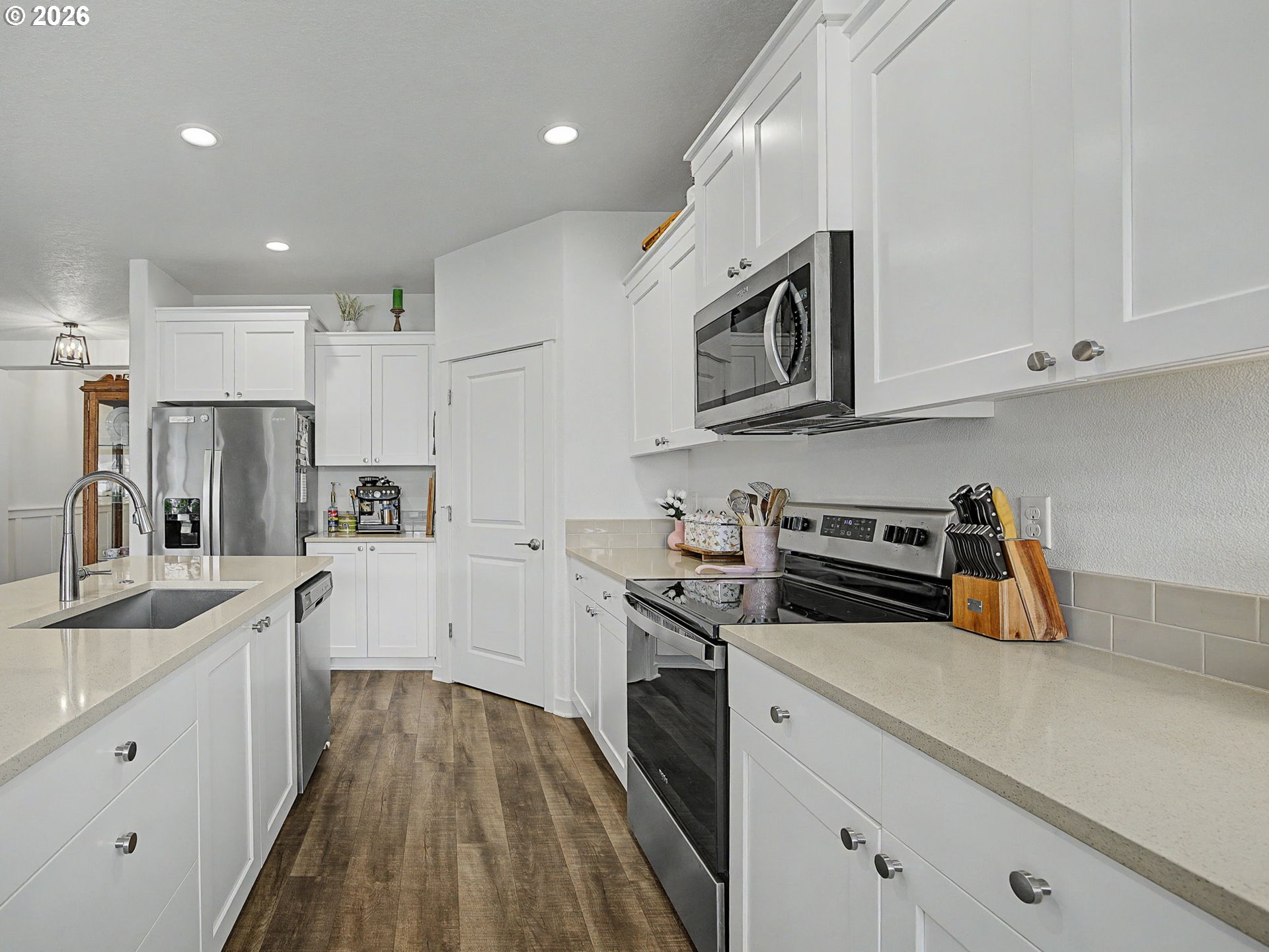 (503) 893-8874Welcome to this beautifully maintained single-level home in the highly desirable Campanella Estates neighborhood. Offering 4 bedrooms and 2 full bathrooms, the flexible fourth bedroom is perfect for a home office or additional living space. Inside you’ll find luxury vinyl plank flooring, high ceilings throughout with tray ceilings in the living room and primary suite for an open, inviting feel. The kitchen features quartz countertops, an island, and a pantry—ideal for everyday living and entertaining. The primary suite includes a walk-in closet and dual vanity, while an upgraded electronic air filtration system provides year-round comfort. Enjoy the covered patio and professionally landscaped backyard with a sprinkler system, backing to a peaceful greenspace with no rear neighbors. With wide streets and great curb appeal, this turn-key home is ready to move in and enjoy.