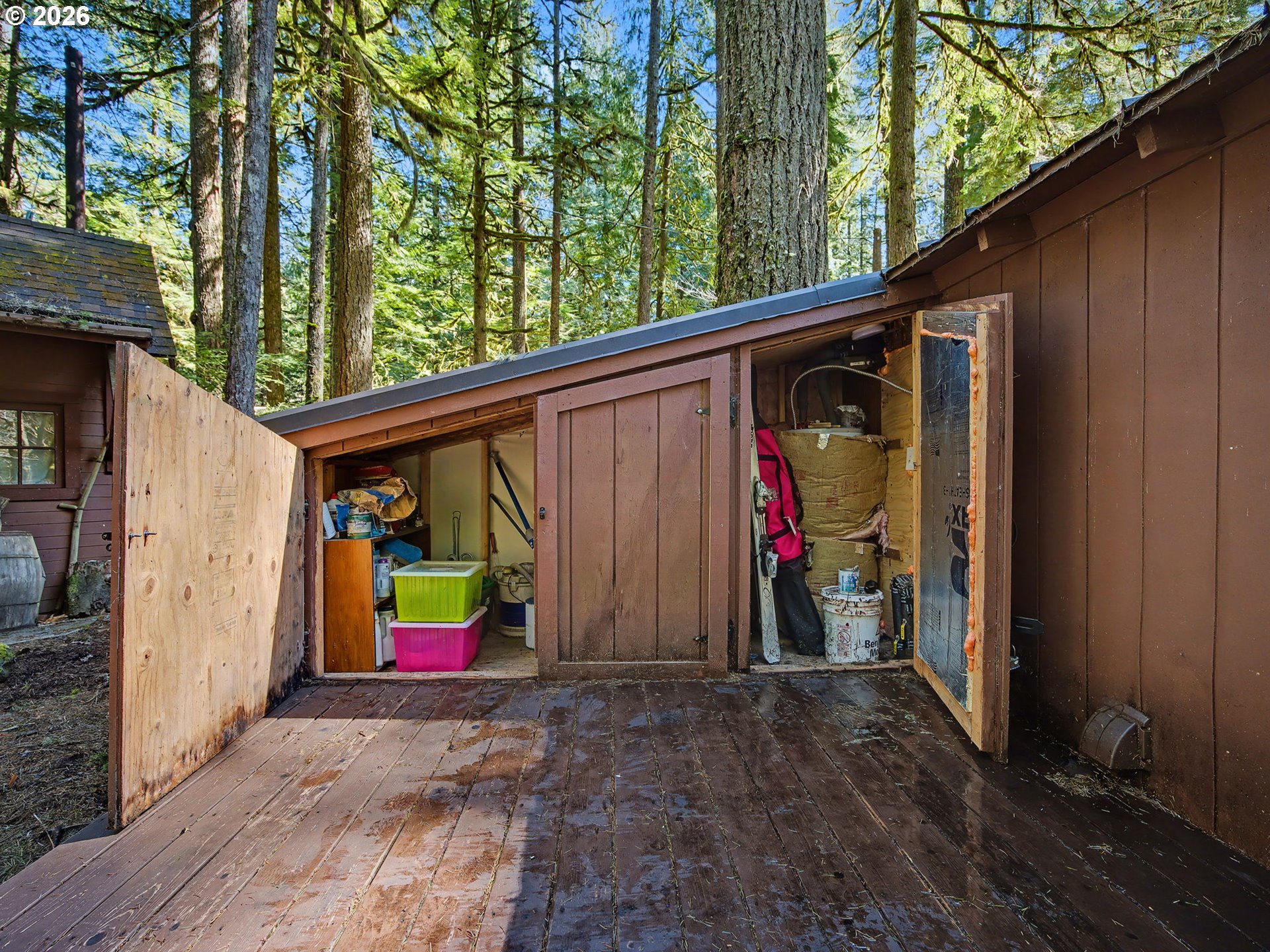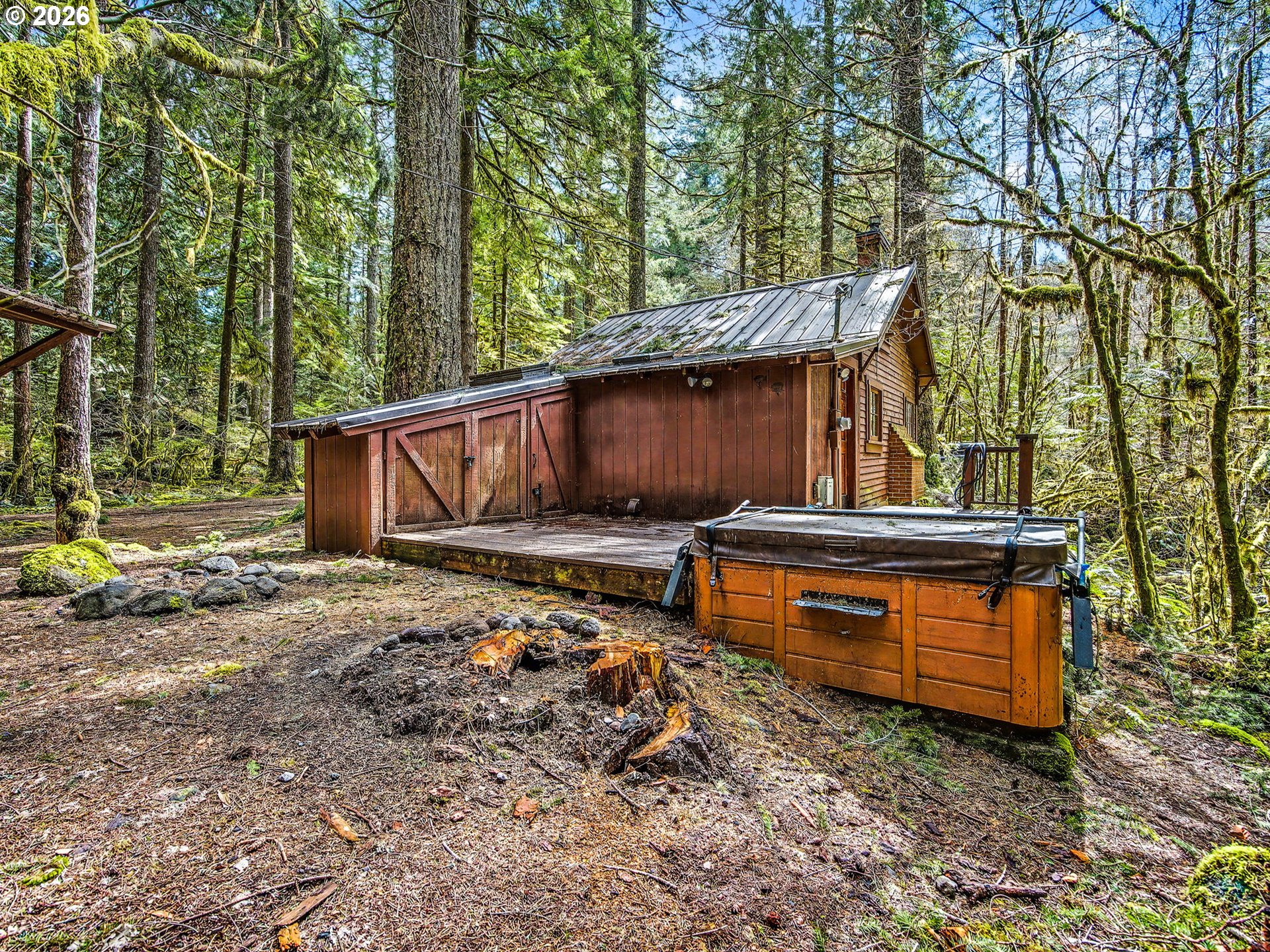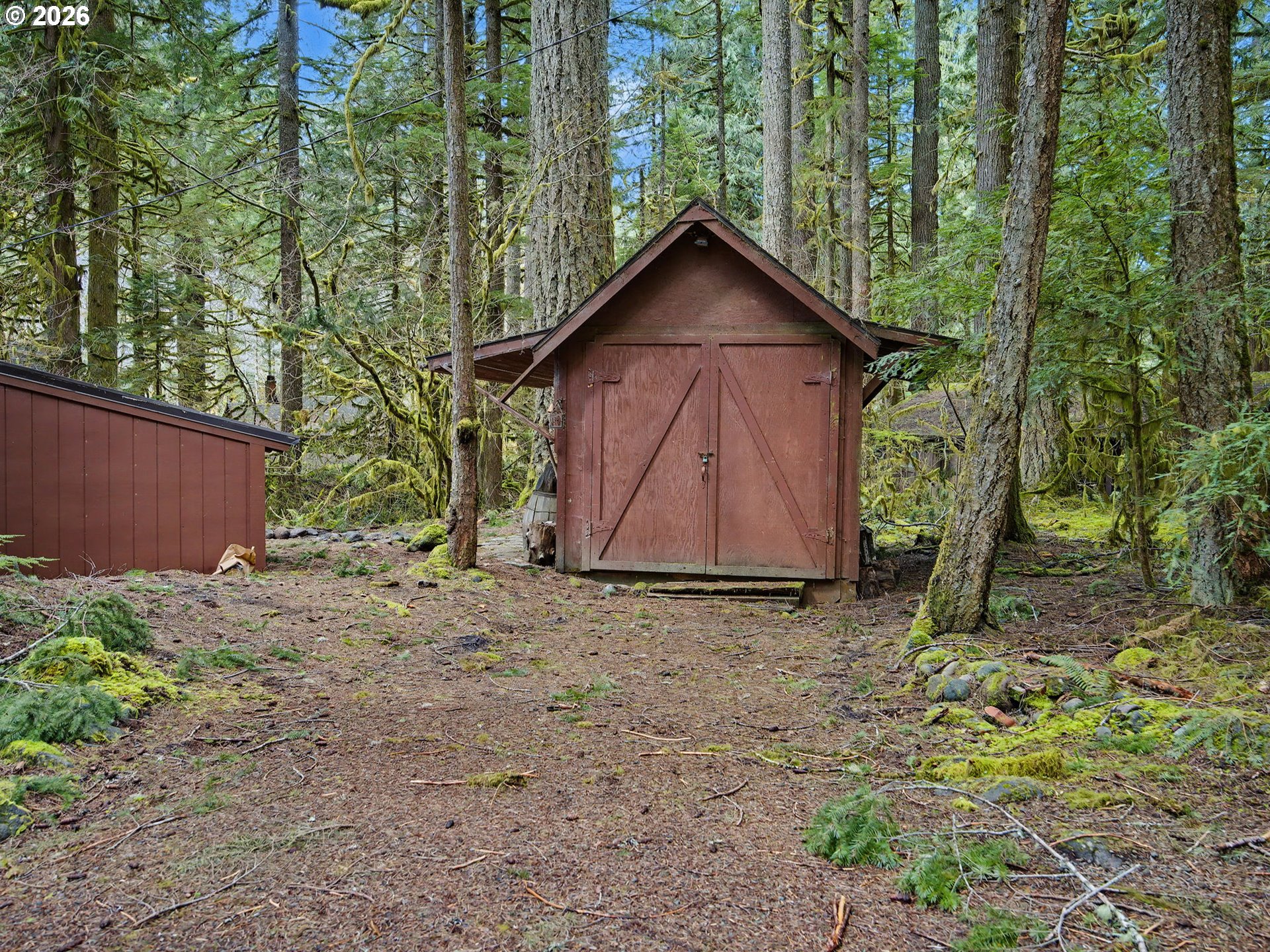 Escape to a world of moss-draped hemlocks and tranquil solitude in this quintessential Mt. Hood forest cabin. This charming sanctuary offers the rare combination of deep-woods privacy and incredible convenience, located just a short, scenic walk away from the heart of Rhododendron. Step inside to find an inviting interior defined by rich hardwood floors and classic tongue-and-groove walls that evoke a timeless cottage feel. The heart of the home is the cozy living and dining area anchored by a massive red brick fireplace with a wood-burning stove, creating the ultimate centerpiece for snowy winter nights. The kitchen balances rustic soul with modern flair, featuring a signature bright red Smeg refrigerator, butcher block countertops, and open shelving that makes the space feel both functional and whimsical. To keep the mountain gear organized, the cabin includes a dedicated mudroom featuring custom built-in storage. The primary bedroom offers a built-in nook bed with views of the forest, while the bathroom has been fully remodeled into a spa-like retreat with heated flooring for those crisp winter mornings. This property is exceptionally well-suited for hosting, as the thoughtful layout allows the cabin to sleep a max of 10 guests between the primary bedroom, the cozy loft beds, a pullout couch in the living area, and the additional heated bunk room located in the matching outdoor shed. The magic continues outdoors on the expansive private deck where you can soak your worries away in the hot tub while relaxing in the forest. Because this home is being sold mostly furnished, it serves as a truly turnkey opportunity to own a piece of Pacific Northwest history. With its classic cedar siding and storybook charm, this cabin is the perfect ready-to-use basecamp for all your mountain adventures.