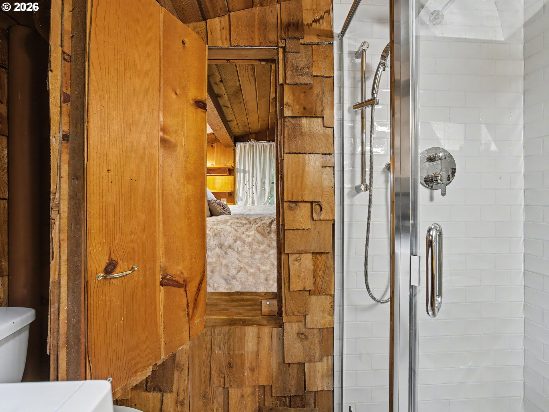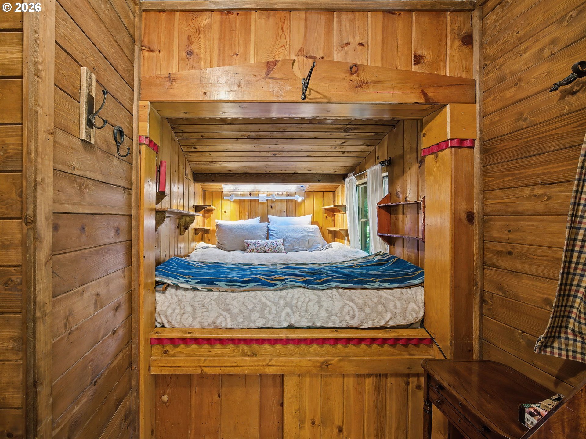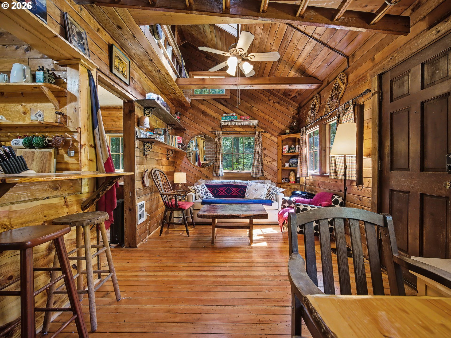 Escape to a world of moss-draped hemlocks and tranquil solitude in this quintessential Mt. Hood forest cabin. This charming sanctuary offers the rare combination of deep-woods privacy and incredible convenience, located just a short, scenic walk away from the heart of Rhododendron. Step inside to find an inviting interior defined by rich hardwood floors and classic tongue-and-groove walls that evoke a timeless cottage feel. The heart of the home is the cozy living and dining area anchored by a massive red brick fireplace with a wood-burning stove, creating the ultimate centerpiece for snowy winter nights. The kitchen balances rustic soul with modern flair, featuring a signature bright red Smeg refrigerator, butcher block countertops, and open shelving that makes the space feel both functional and whimsical. To keep the mountain gear organized, the cabin includes a dedicated mudroom featuring custom built-in storage. The primary bedroom offers a built-in nook bed with views of the forest, while the bathroom has been fully remodeled into a spa-like retreat with heated flooring for those crisp winter mornings. This property is exceptionally well-suited for hosting, as the thoughtful layout allows the cabin to sleep a max of 10 guests between the primary bedroom, the cozy loft beds, a pullout couch in the living area, and the additional heated bunk room located in the matching outdoor shed. The magic continues outdoors on the expansive private deck where you can soak your worries away in the hot tub while relaxing in the forest. Because this home is being sold mostly furnished, it serves as a truly turnkey opportunity to own a piece of Pacific Northwest history. With its classic cedar siding and storybook charm, this cabin is the perfect ready-to-use basecamp for all your mountain adventures.