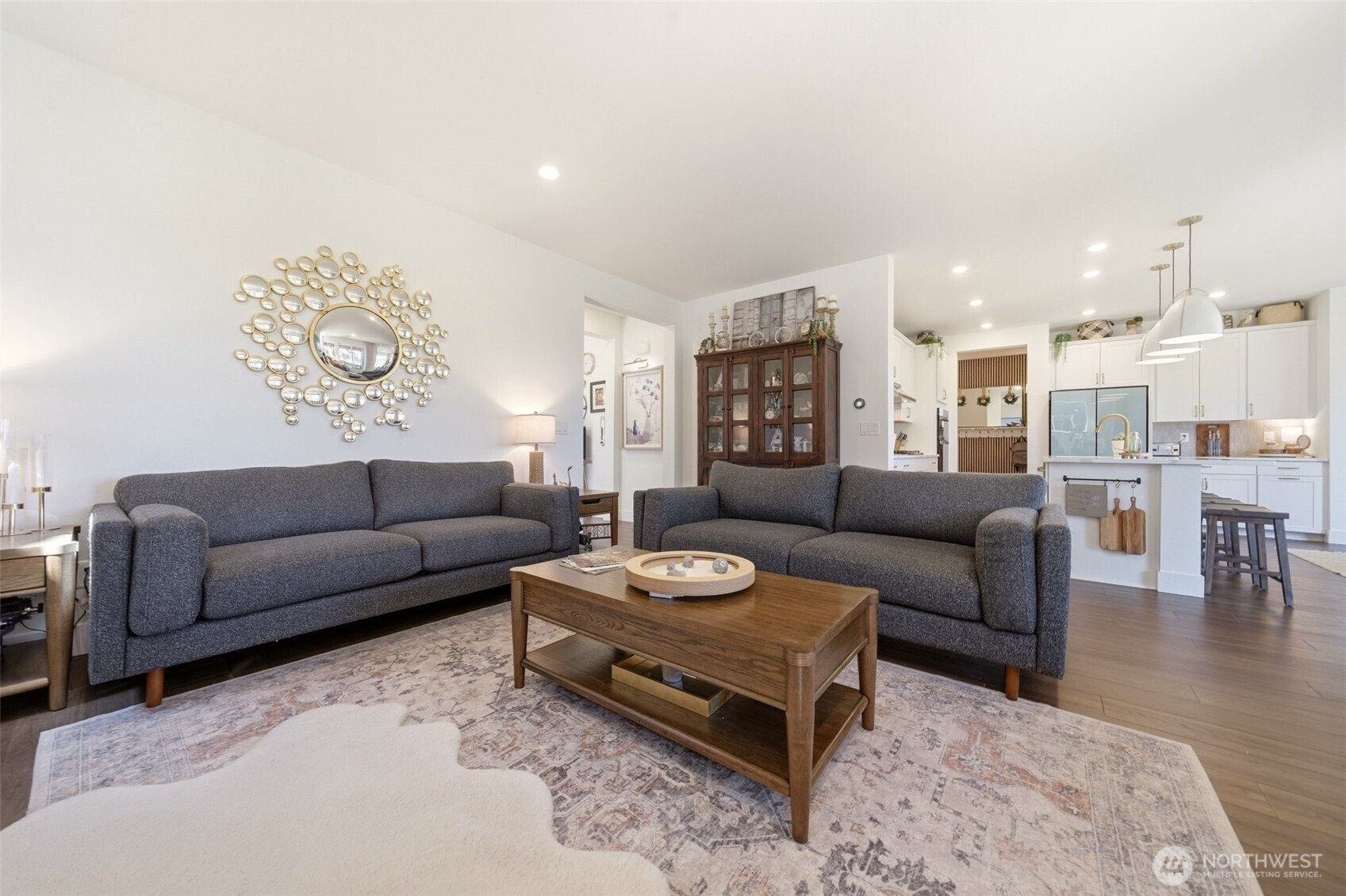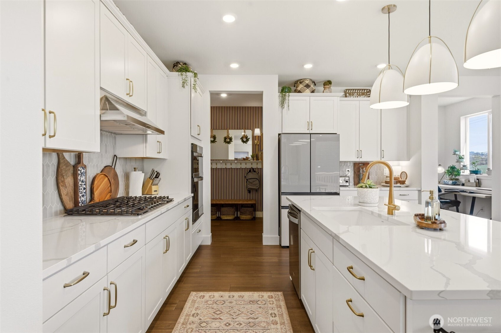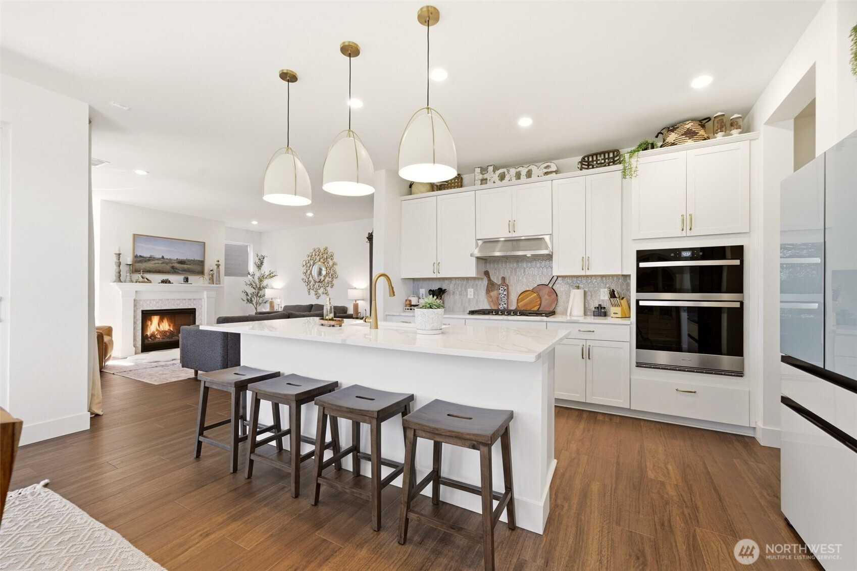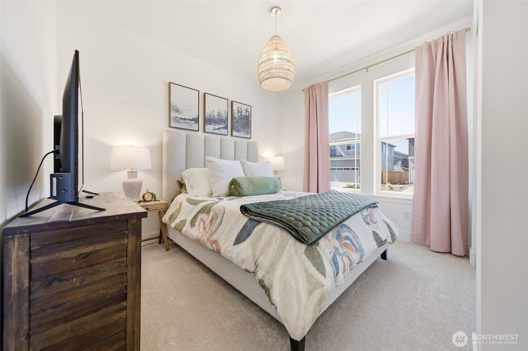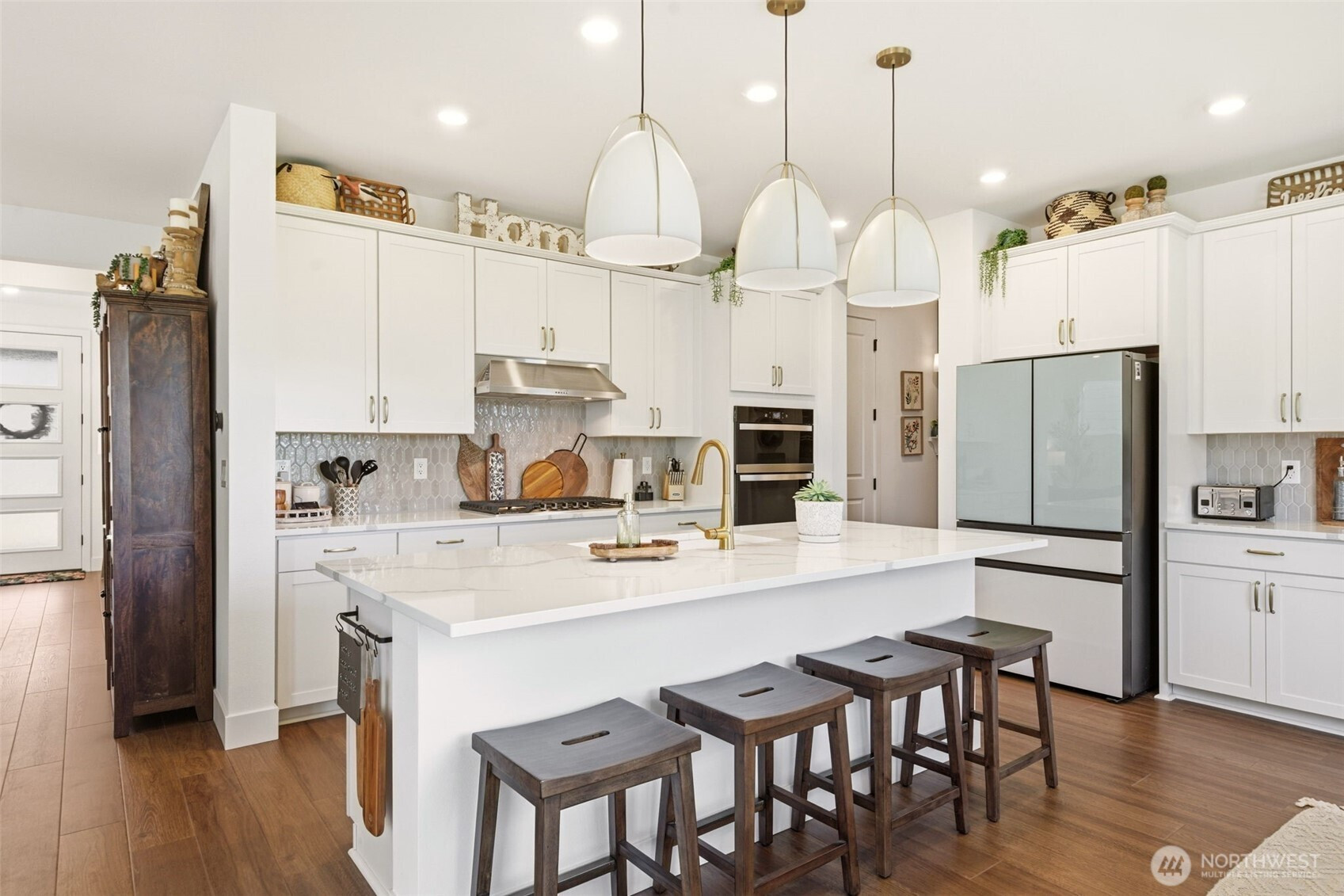 This upgraded Quincy floorplan, built by Pulte Homes, offers a fantastic design with 5 bedrooms, an office and bonus/media room, as well as 3 full baths and approx. 2,842 sqft. of living space. A spacious entry opens to a Greatroom living area that is perfect for entertaining while being connected to the dining area and kitchen. The kitchen has beautiful quartz countertops, stainless steel appliances, a large island, and an expanded walk-in pantry for added storage; the main level includes a full bedroom and full bath with a tiled shower, providing flexible living options for guests or multi-generational needs, while upstairs you’ll find a private owner’s suite with soaking tub, walk-in closet, and custom tile work, along with three additional bedrooms—each with walk-in closets—a versatile media/game room, and a convenient laundry room; interior finishes include luxury vinyl plank flooring, 5" baseboards, soft-close dovetailed construction cabinets and drawers, high 9'ceilings on the main, and designer details throughout, plus power blinds and curtains included; exterior features include a covered deck, fenced yard, fully landscaped yard with front and back outdoor sprinkler systems, with a 2-car attached garage enhanced by a durable epoxy floor; built in 2025 with modern systems such as central air, high-efficiency forced air heating, and tankless hot water, this home also includes a transferable builder warranty and is located in the desirable Frog Pond Crossing community.