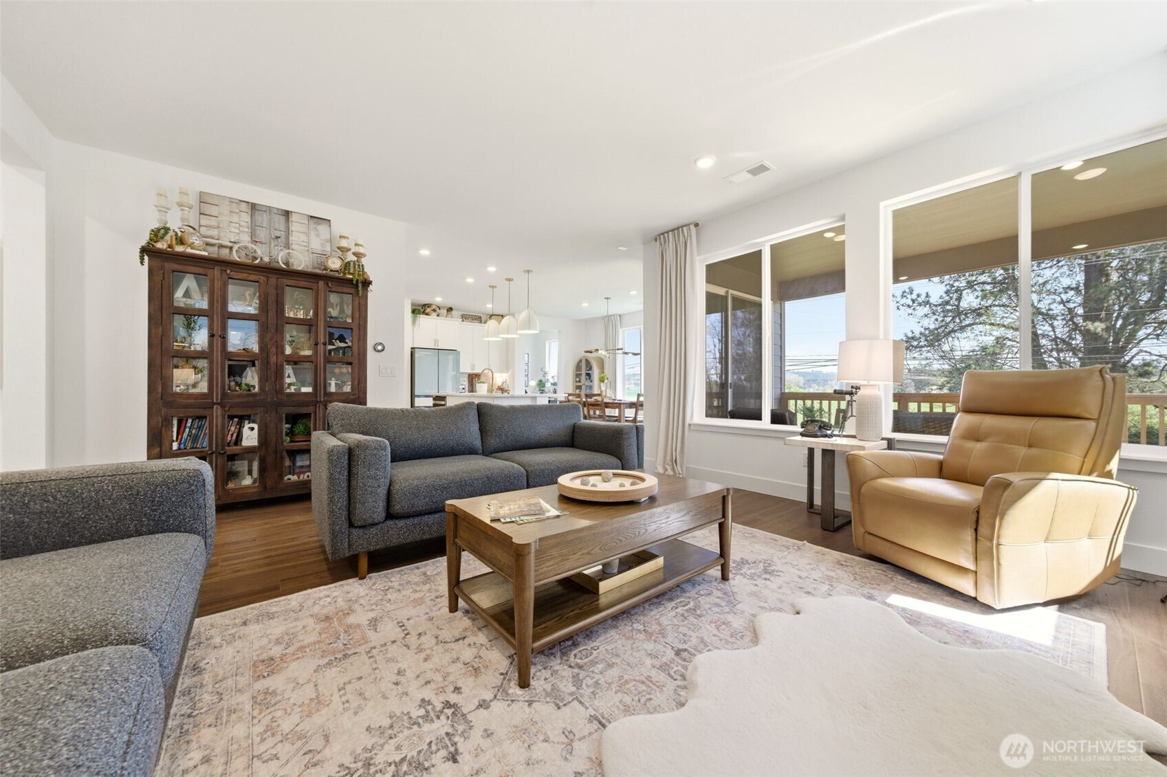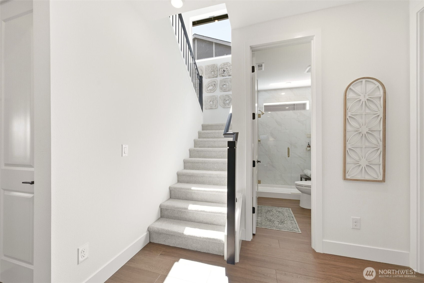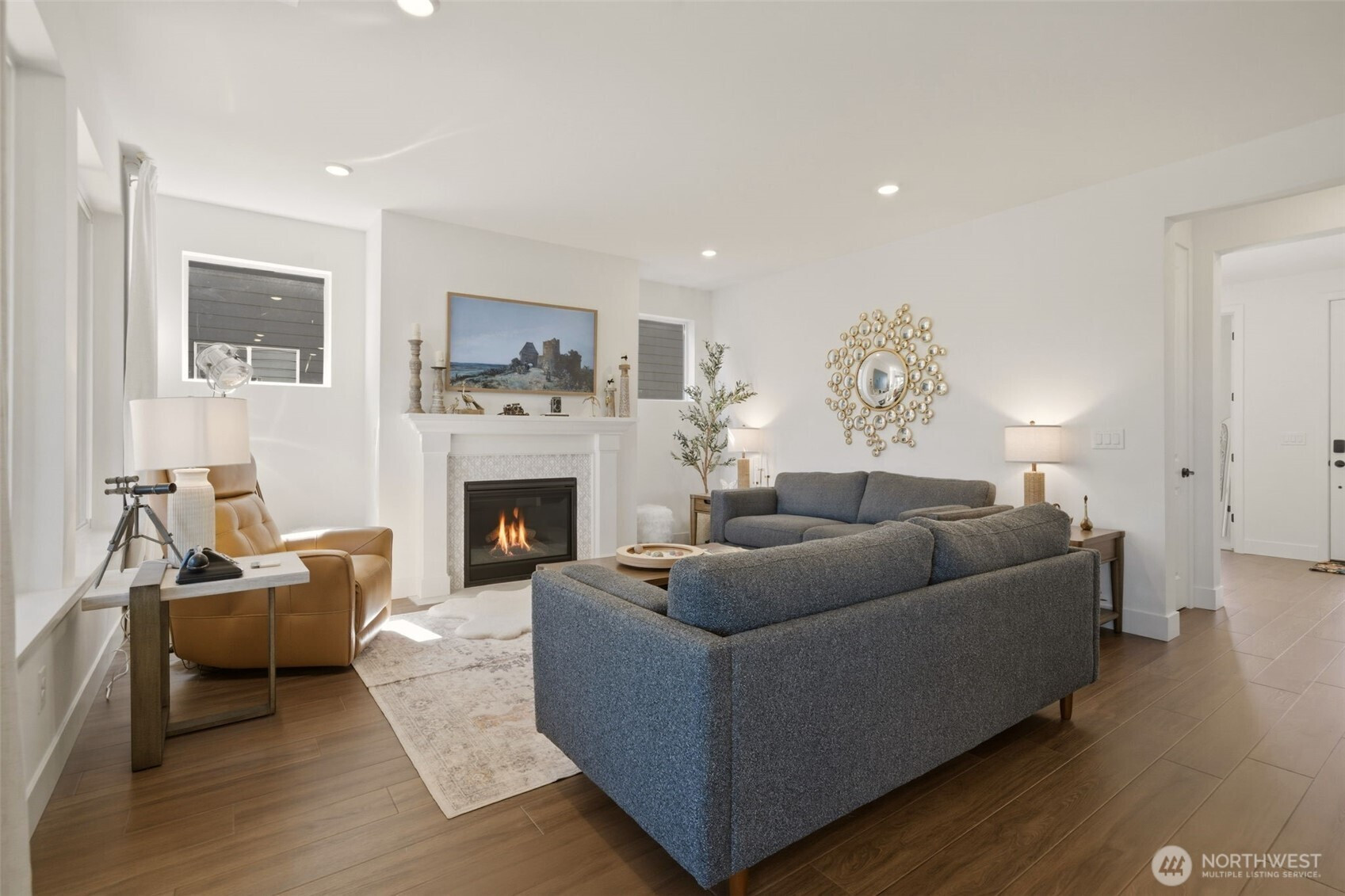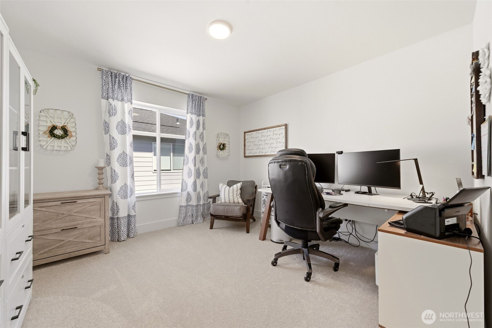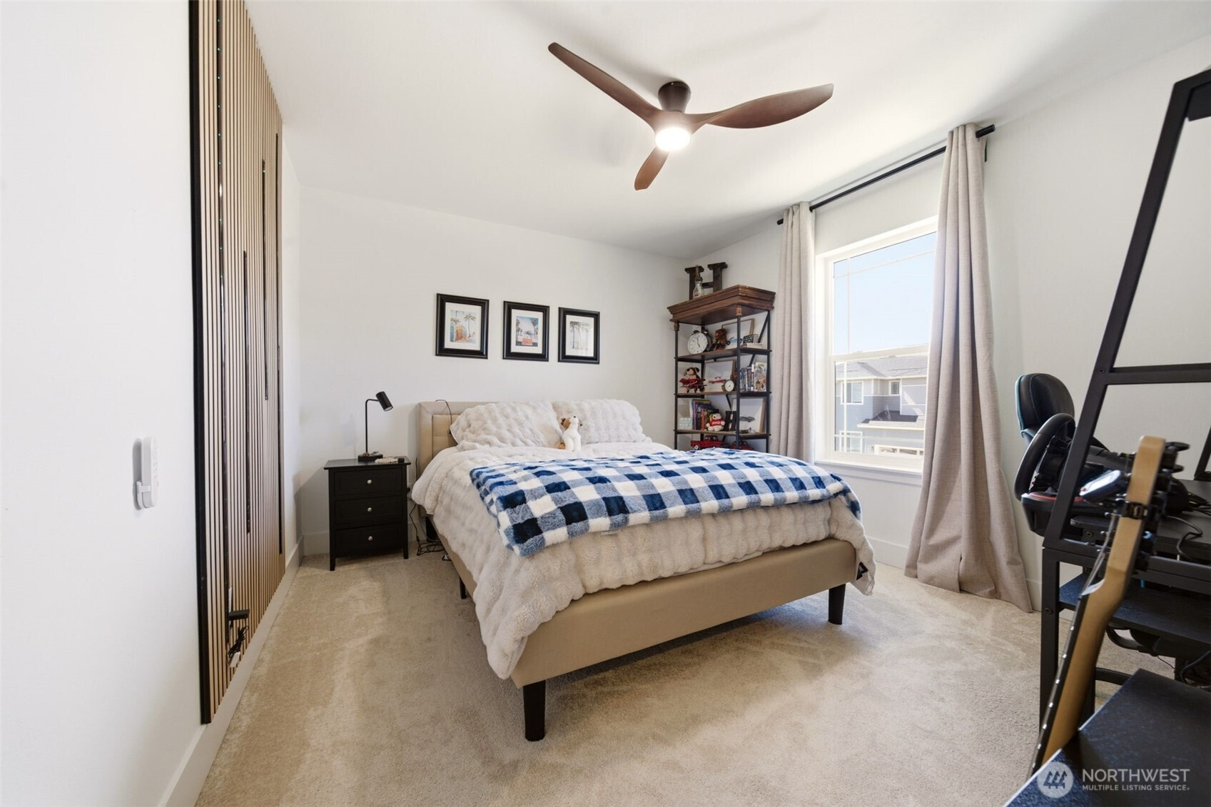This upgraded Quincy floorplan, built by Pulte Homes, offers a fantastic design with 5 bedrooms, an office and bonus/media room, as well as 3 full baths and approx. 2,842 sqft. of living space. A spacious entry opens to a Greatroom living area that is perfect for entertaining while being connected to the dining area and kitchen. The kitchen has beautiful quartz countertops, stainless steel appliances, a large island, and an expanded walk-in pantry for added storage; the main level includes a full bedroom and full bath with a tiled shower, providing flexible living options for guests or multi-generational needs, while upstairs you’ll find a private owner’s suite with soaking tub, walk-in closet, and custom tile work, along with three additional bedrooms—each with walk-in closets—a versatile media/game room, and a convenient laundry room; interior finishes include luxury vinyl plank flooring, 5" baseboards, soft-close dovetailed construction cabinets and drawers, high 9'ceilings on the main, and designer details throughout, plus power blinds and curtains included; exterior features include a covered deck, fenced yard, fully landscaped yard with front and back outdoor sprinkler systems, with a 2-car attached garage enhanced by a durable epoxy floor; built in 2025 with modern systems such as central air, high-efficiency forced air heating, and tankless hot water, this home also includes a transferable builder warranty and is located in the desirable Frog Pond Crossing community.