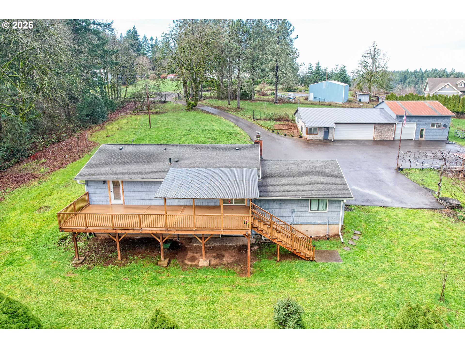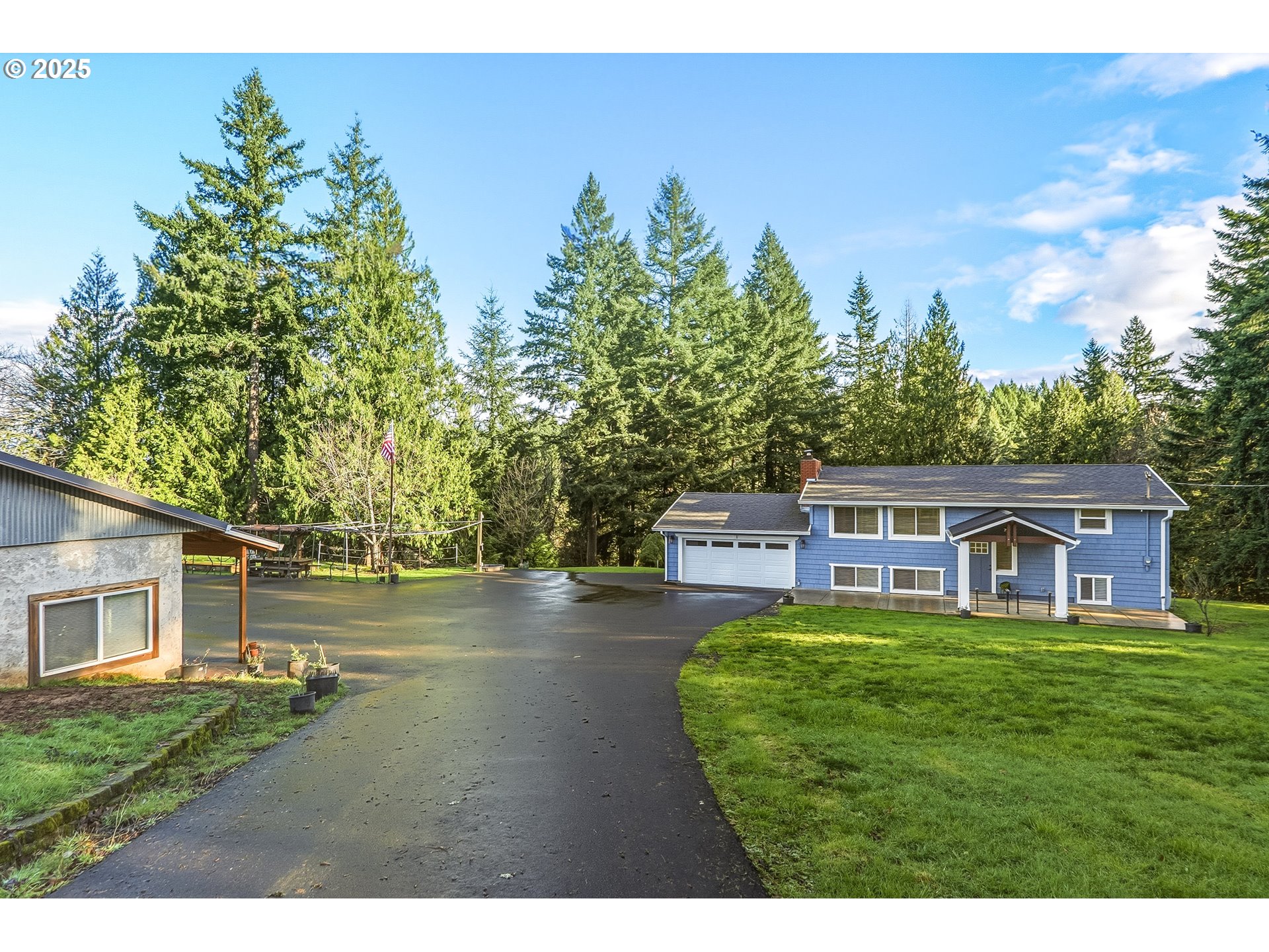 Stunning 2,000 sq ft remodeled home on 7.4 private, wooded acres in highly desirable Boring, OR, with breathtaking Mt. Hood views! This home perfectly blends mid-century modern and contemporary style, featuring an open-concept kitchen with vaulted ceilings, a huge quartz island, mosaic backsplash, and abundant natural light, ideal for entertaining or gathering with family. The lower level boasts a cozy living room with a stone fireplace and wood-burning stove, three bedrooms and a bathroom with a walk-in shower and double vanity. The spacious primary suite offers two closets and private deck access with expansive deck views over serene natural surroundings. Enjoy the peace and privacy of country living while remaining conveniently close to schools, grocery stores, gas stations, and other essentials. This incredible property also includes guest quarters attached to the shop (studio with kitchen and full bath), 3-bay shop, manufactured home, barn, and two sheds, offering endless possibilities for hobbies, storage, or multi-use living. Don’t miss this one-of-a-kind opportunity to have the best of both worlds—country tranquility with everyday convenience nearby!