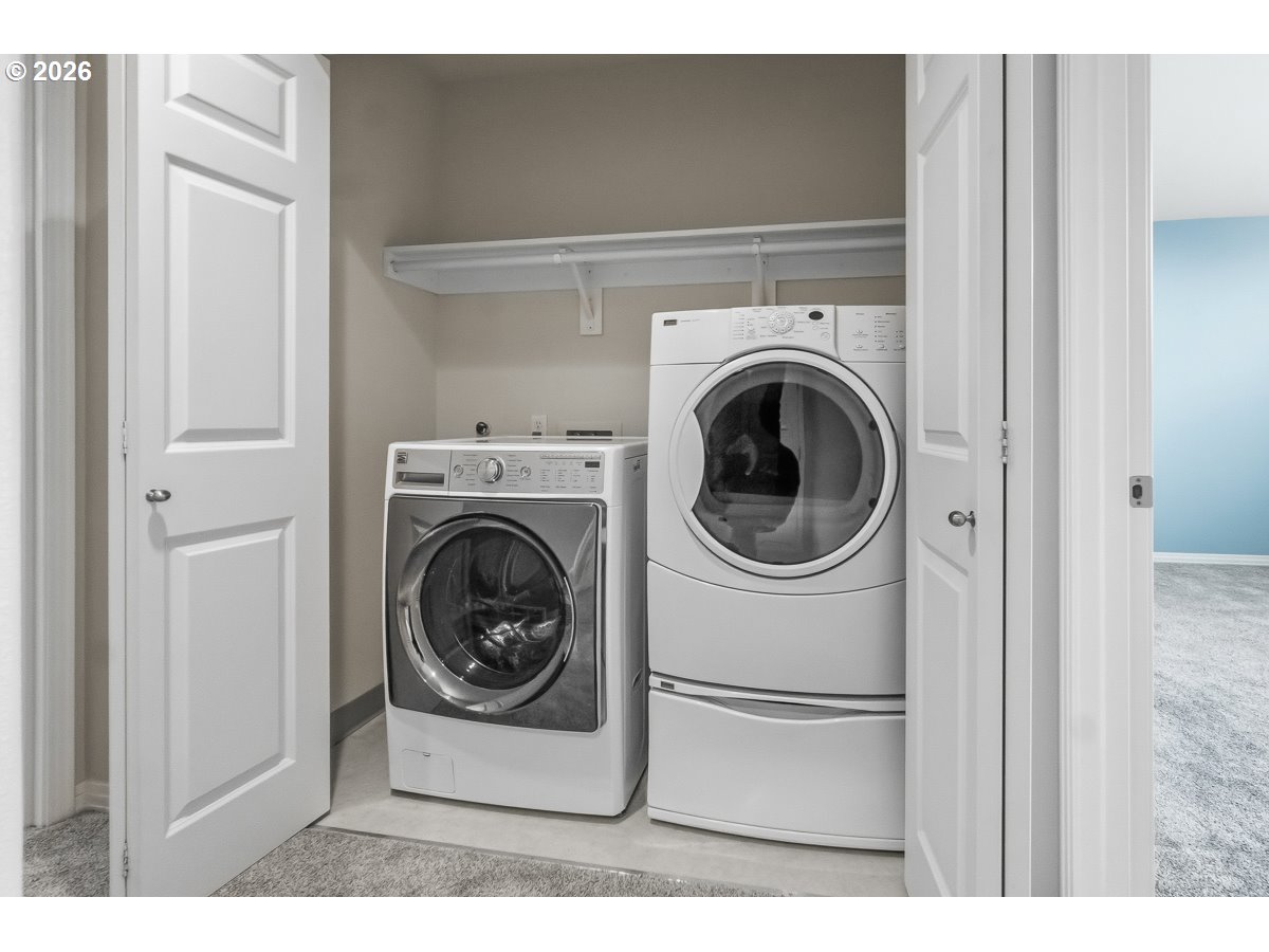 Beautifully maintained townhouse featuring an updated kitchen with tile backsplash and solid surface countertop. High ceilings and spacious rooms. The inviting living area includes a fireplace with built-in shelving on both sides and wired for surround sound. Vaulted primary bedroom, bathroom with walk in shower, private water closet, vanity, plenty of storage and double closets. 2nd bedroom also has an attached bathroom. Closet organizers in both bedrooms. Enjoy a private, low-maintenance backyard ideal for year-round enjoyment. 18x12 deck in back and 16x6 balcony in front. Great storage throughout including under stairs storage and additional storage in garage/mechanical room. Wine cellar shelving can be removed prior to closing. Additional highlights include central vacuum and Seller is offering a one-year home warranty for added peace of mind. All appliances included.