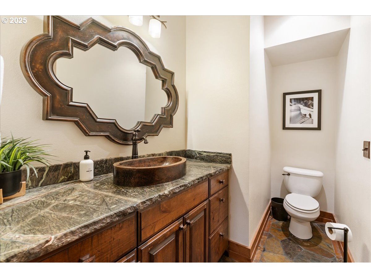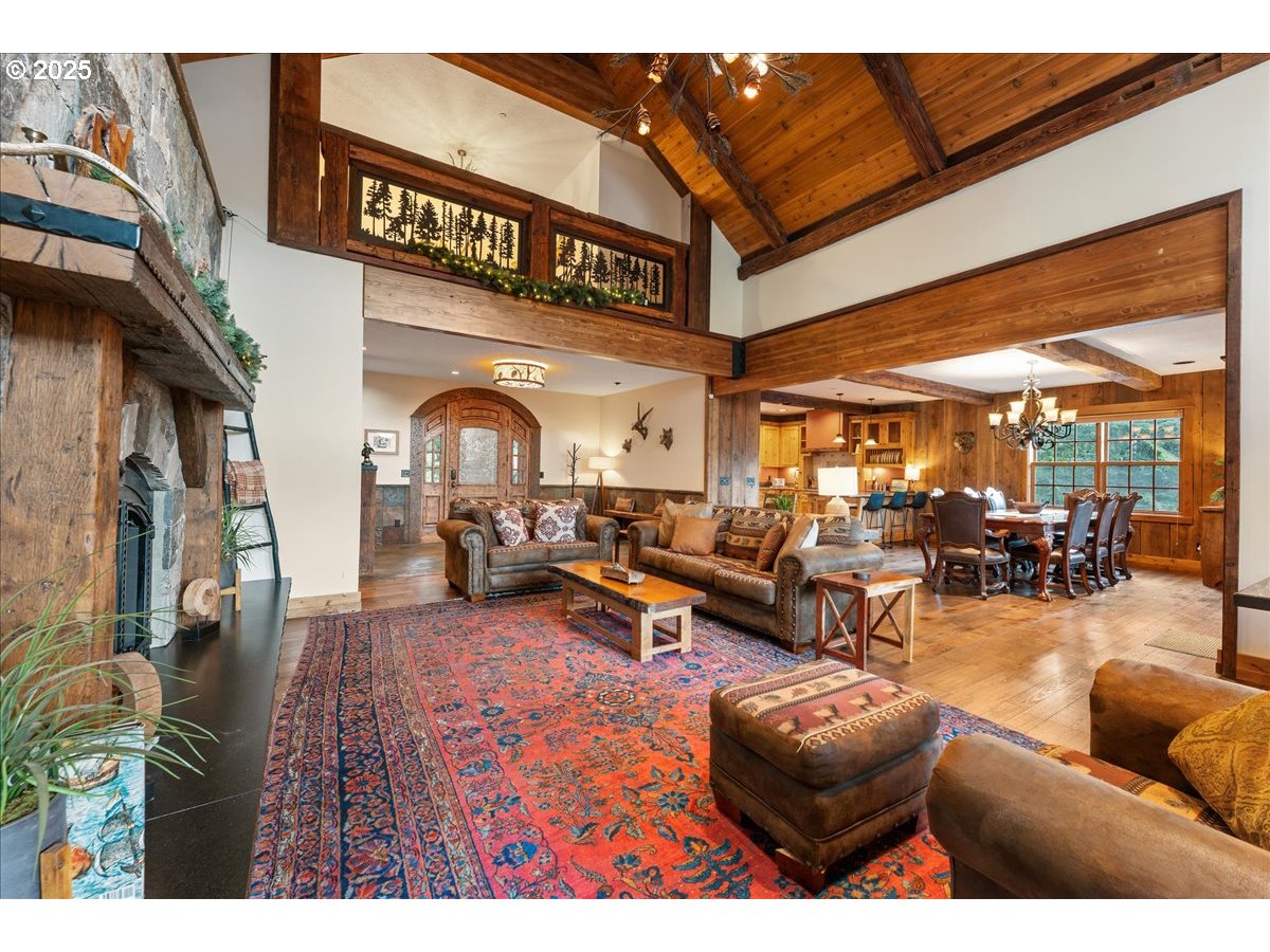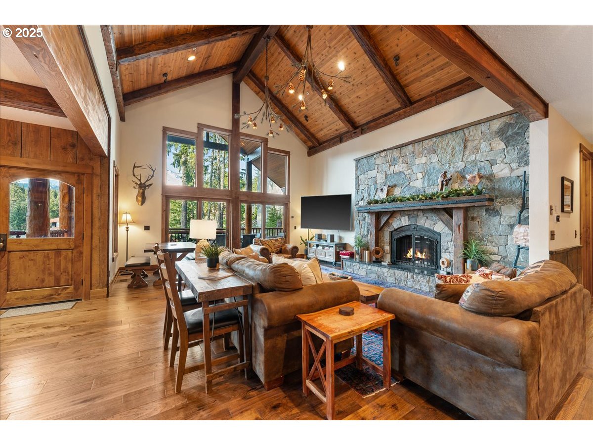 This breathtaking Mount Hood lodge is a custom-built, three-level retreat offering an optional but compelling investment property for short term rentals, especially destination wedding parties booking at the adjacent Skibowl, as well as Timberline and the growing number of other recreational resorts and year-round amenities around the mountain. Elaborate artistry is evident from the moment you enter, with its captivating metalcraft front door engraving, intricate woodwork, and its showcasing of craftsmanship that complements the natural surroundings. The vaulted great living room is breathtaking in its rustic, exposed timbered glory; in fact, the builder incorporated reclaimed framing from the original Jim Bean Whiskey factory in Kentucky! This leads directly out to the covered front deck with its glorious and stunning Mt. Hood view. Spacious accommodations are spread over three levels, featuring four bedrooms (including three private king suites, all with heated floors!) and a large lower level bunk room with four fabulous log-hewn, built-in beds and bath. The chef-inspired expansive gourmet kitchen is equipped with high-end appliances and ample space, perfect for preparing meals to enjoy with family and large gatherings. Visitors experience the beauty of the outdoors from the front deck - so ideal for al fresco dining or a cozy fire. The newer, private hot tub on the lower level offers private relaxation after a long day of exercise, celebrations, or sightseeing - from skiing to hiking or simply taking in the fresh mountain air and impressive Mt Hood views. And as a pièce-de-résistance, the property also comes fully furnished, and with all appliances. This is an artisan-designed, singular property in a truly spectacular location!