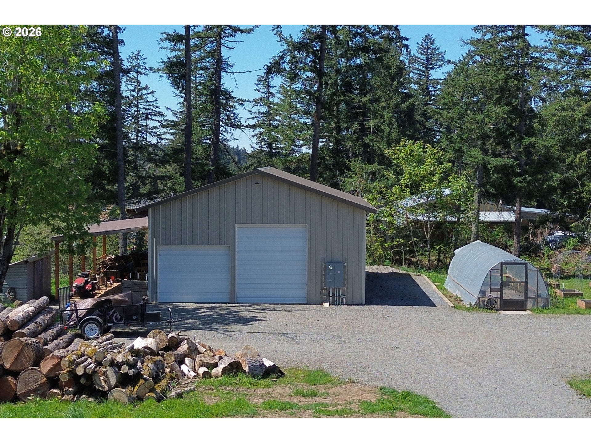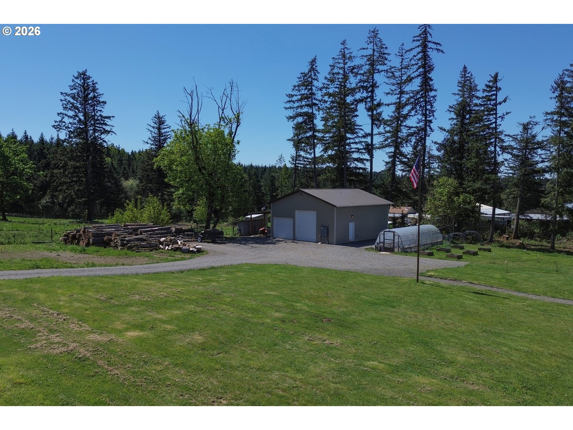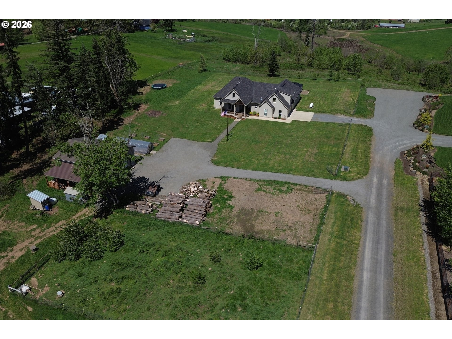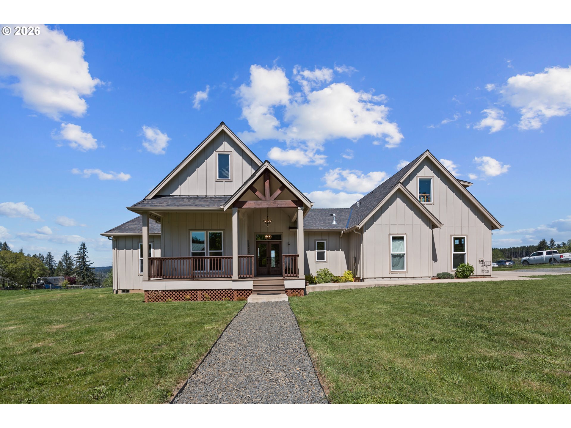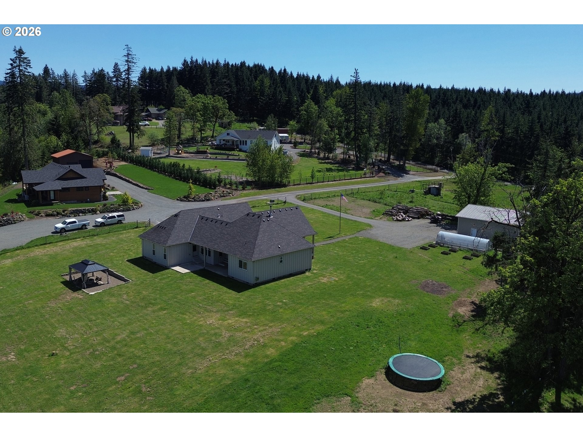 Set on 3 private, usable acres just minutes from Molalla, this newer 2021-built home offers a seamless blend of modern comfort and functional rural living. With 4 bedrooms and 2.5 baths on the main level—including a spacious primary suite—plus an additional bedroom and full bath upstairs, the layout works well for multi-generational living, guests, or a dedicated work-from-home setup. The kitchen is both stylish and practical, featuring a large quartz island with seating, rich dark cabinetry, stainless steel appliances, and a butler’s pantry. Just beyond, the living and dining areas are filled with natural light, where large picture windows frame sweeping views of the surrounding hills—creating an inviting space to gather or unwind. The primary suite offers a beautifully finished bath featuring double vanities with quartz counters, a walk-in shower, a generous walk-in closet, and a built-in seating area. Outside, the property is fully fenced and cross-fenced with space for animals, gardening, or simply enjoying the setting. A greenhouse supports year-round growing, while the impressive 30x40 shop—with concrete floor, power, and water—adds flexibility for projects, storage, or business use. Ideal location, close to town and about 40 minutes drive from Portland International Airport. An exceptional property and opportunity!