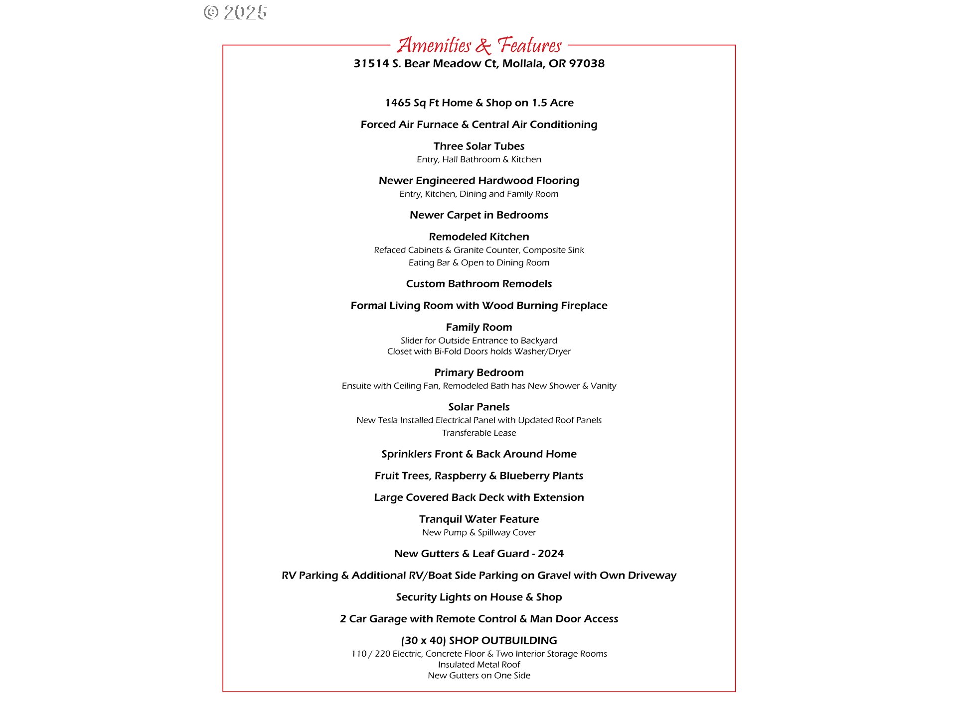 (503) 893-8874Welcome home to a warm and inviting retreat!! Enjoy beautiful scenic views, including Mt Hood, nature and a tranquil water featureLarge shop with concrete floors, two storage rooms and 110/220 electric. Immaculate, tastefully updated home shows like new! Within the 1465 sq ft of living space, find everything you could want with 3 bedrooms, a family room that could be a 4th bedroom and 2 full baths. New engineered flooring in main living areas with newer carpet in the bedrooms. Efficient kitchen space has refaced cabinets with granite counters, casual eating bar and opens to dining room. Both bathrooms have had a complete remodel with custom touches. Convenient interior laundry access, within family room that has slider out to the backyard. Covered patio is ideal for outdoor dining and a relaxing lifestyle. Spacious 1.5 acre has room for pets & gardening, with fruit trees, raspberries & blueberries. Sprinklers front and back make watering landscaping easy. Plenty of room for RV parking/boat storage. Solar panels bring energy efficiency and reduced utility costs. AC will keep you cool if needed! Overall a serene country setting, but close to town, highway and amenities.