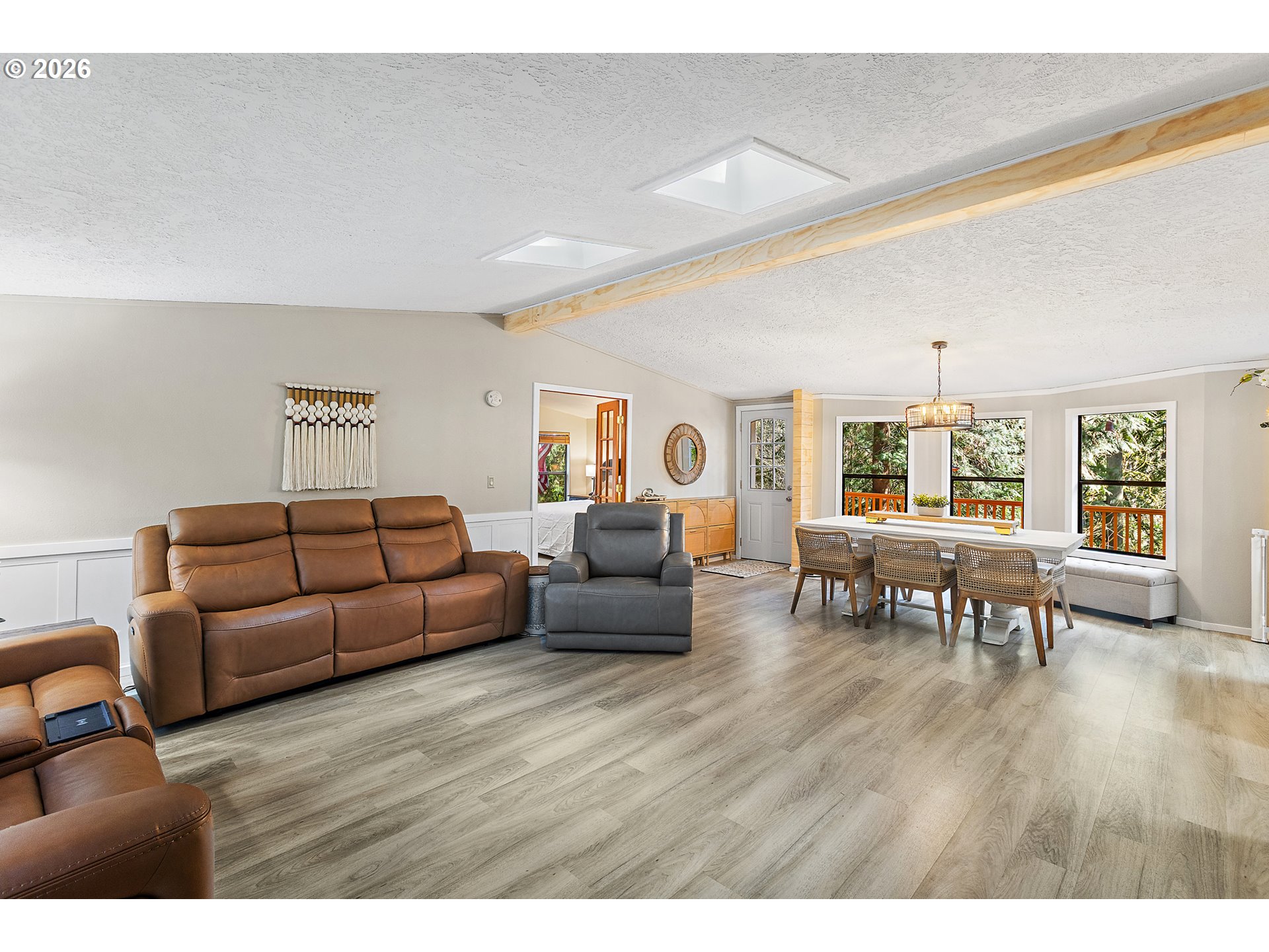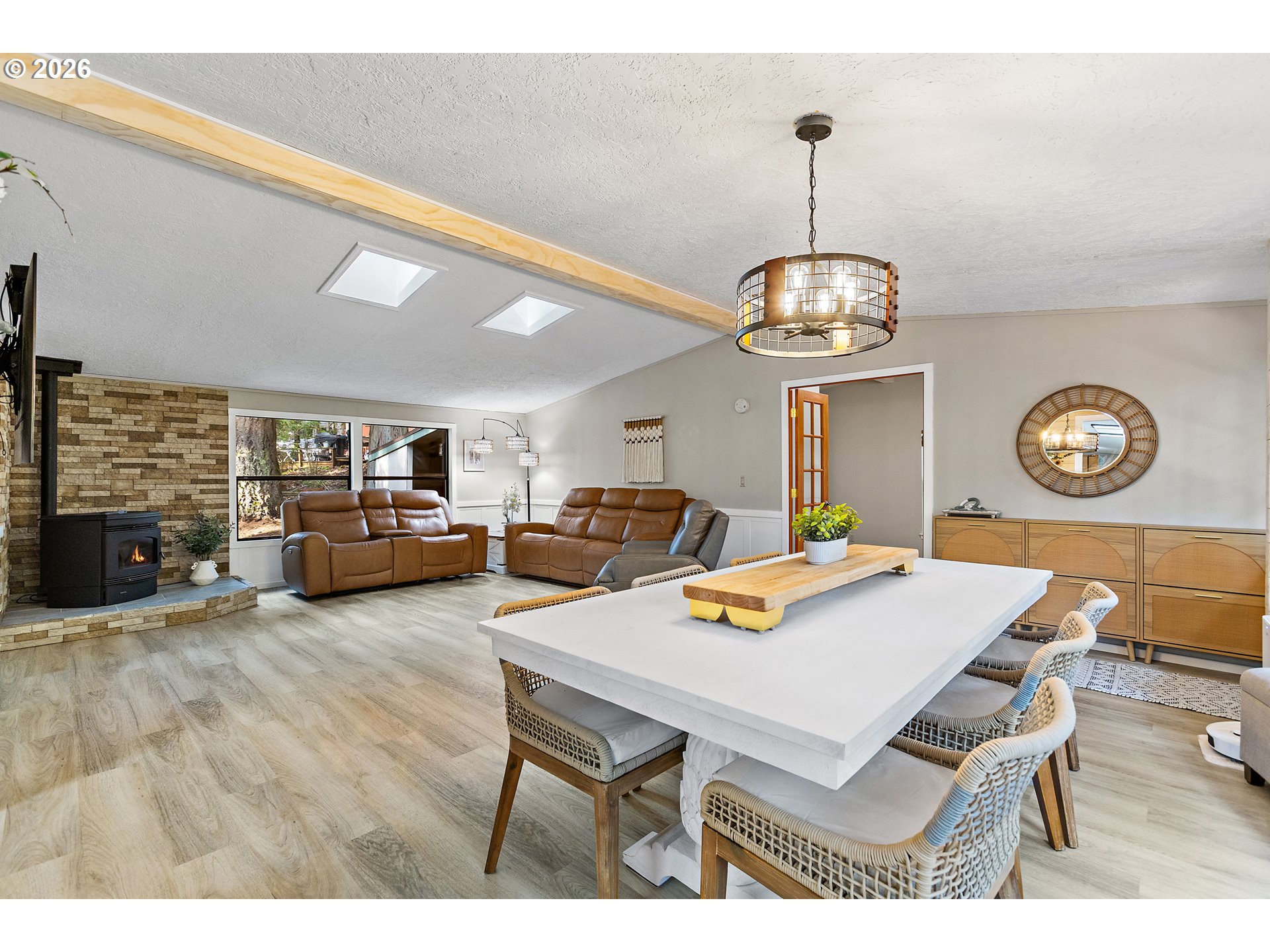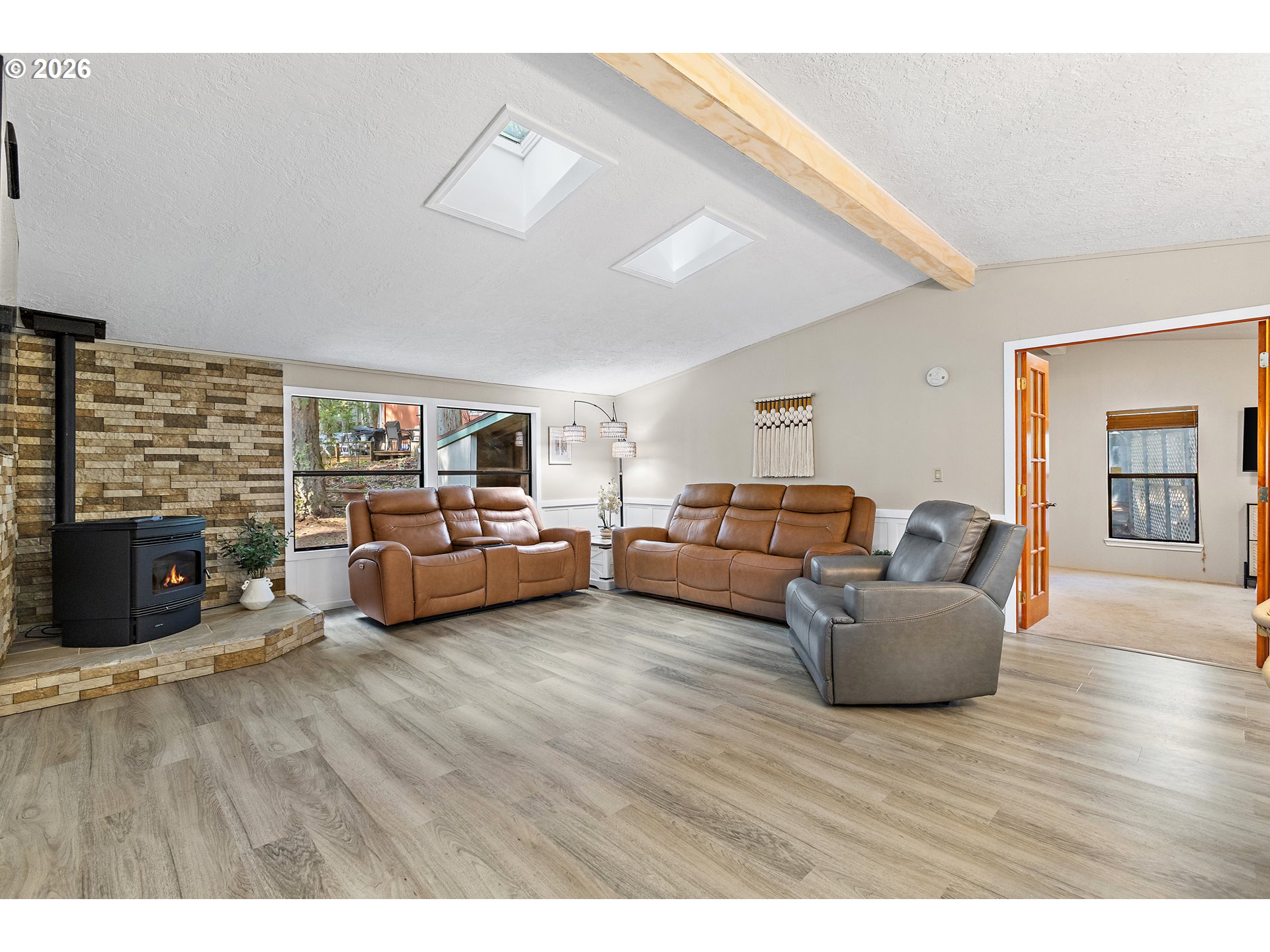 Updated, move-in ready, and surrounded by nature—this Big Valley Woods home lives larger than expected. Inside, vaulted ceilings and large windows create a bright, open feel throughout. The spacious newly updated kitchen, with all new Bespoke appliances provides ample counter space and storage, flowing seamlessly into both the living and dining areas for easy everyday living.This flexible floor plan with two separate living spaces is ideal for spreading out, working from home, or entertaining. The family room opens directly to a covered and screened deck, creating the perfect indoor/outdoor living space and a great spot to enjoy the surrounding greenery year-round. The primary suite offers a comfortable retreat with a walk-in closet and walk-in shower, 3 additional rooms provide versatility for whatever you need. Large laundry/mud room, with pantry and extra storage, new Samsung washer & dryer included. Keep cozy and warm with the two pellet stoves. Extensive system updates include: New heat pump (2025) Updated PEX plumbing (2020) Home re-leveled (2023) New water heater (2023) Covered parking/Paved driveway & walkway (2018) 30-year roof (2010)wired in generator supporting ~75% of the home. New hard surface flooring, updated light fixtures, wainscoting, ship lap wall accents, natural wood trim, and fresh paint, leaves nothing left to do but bring your things and settle in.