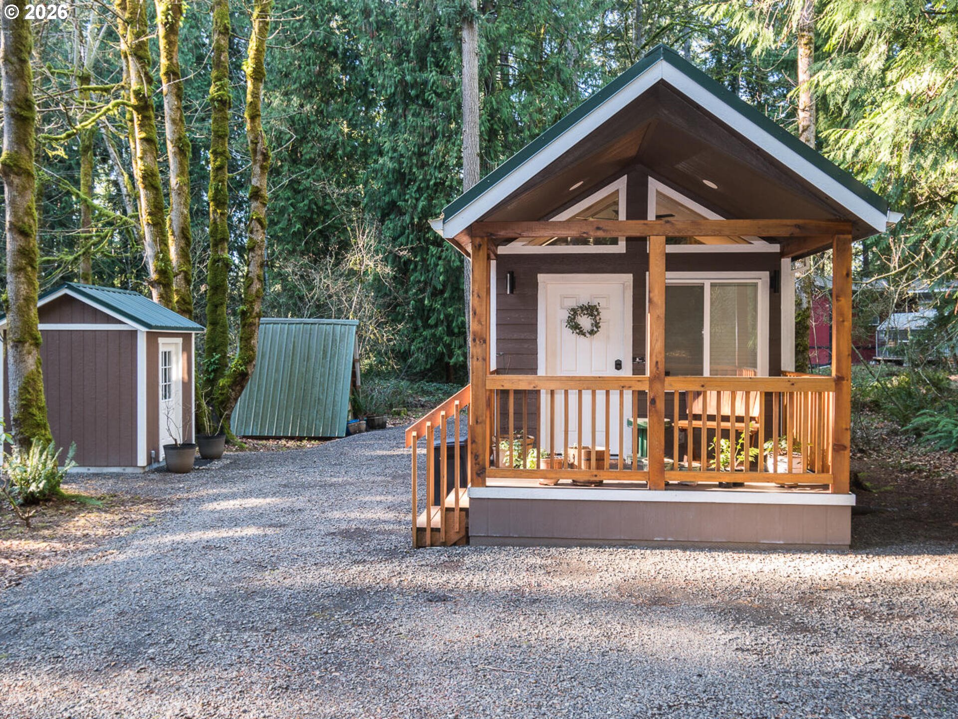 (503) 893-8874Built in 2022, this custom park model home offers thoughtful upgrades and a warm, cabin-style feel in a serene, forest-like setting—close to the city, yet far enough away to enjoy true tranquility. Natural pine interior walls create an inviting atmosphere to match the forrest view when you look out the windows. The full kitchen features all full-size stainless steel GE appliances, including a gas range, large refrigerator with ice and water, dishwasher, island, and a stainless steel apron sink. Separate living and dining areas provide comfortable and functional spaces, with ample storage thoughtfully integrated throughout the home. A spacious loft offers flexible use as an additional sleeping area or bonus space and is not included in the listed square footage. Additional features include a mini-split heating and cooling system, rain gutters with gutter guards, and 50-amp electrical service. Step outside onto the large front deck, take a seat, relax, and enjoy the great outdoors surrounded by lush greenery. The home sits on a generously sized lot and includes a 2024-built 8x8 Tuff Shed, fully insulated with a 30 amp electrical providing power, featuring white shiplap interior—perfect for storage, a workshop, or a private office away from the main home. This property delivers comfort, efficiency, and charm. From the moment you walk in, you’ll feel the warmth and coziness of a true cabin in the woods.