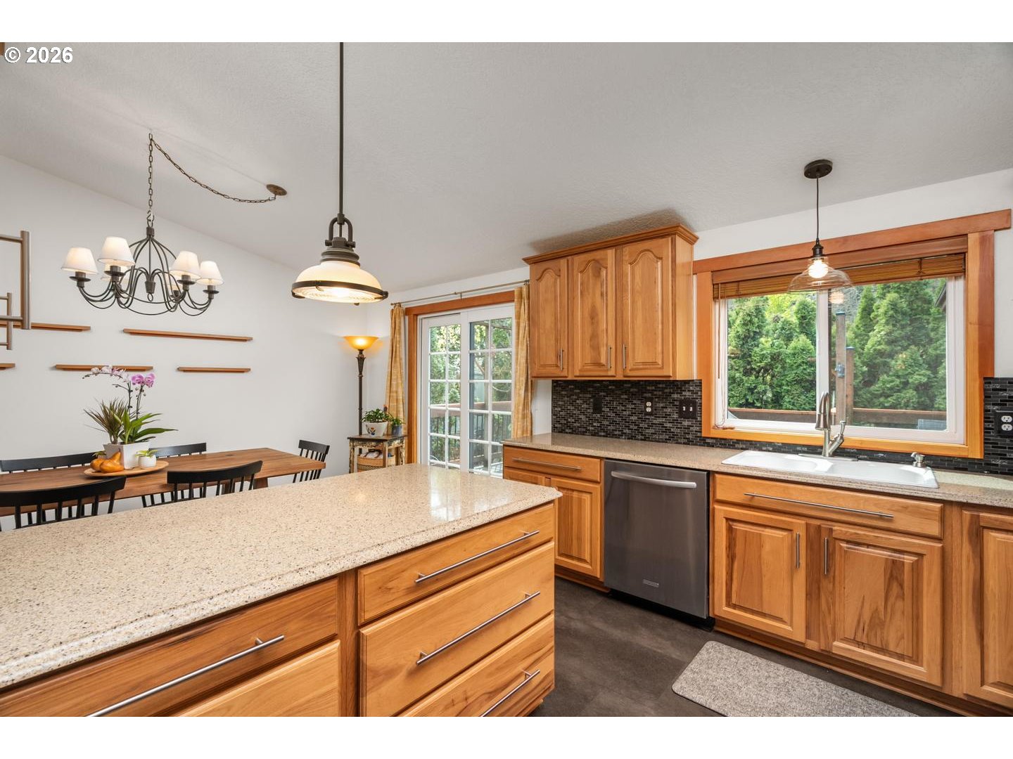 Marvelous Milwaukie split level home, move in ready. This inviting 3 bedroom residence features a bright main level living area with vaulted ceilings and a cozy fireplace, creating a warm and welcoming atmosphere.The beautifully updated kitchen showcases granite countertops, a stylish glass tile backsplash, stainless steel appliances and a gas range , perfect for everyday living and entertaining. Step outside from the dining area onto a spacious deck, ideal for outdoor gatherings or relaxing evenings.Downstairs, the versatile lower level offers a comfortable family room with durable tile flooring and added built-in shelving, ideal for a media space, playroom or home office. A well appointed laundry area with convenient half bath enhances everyday functionality.Additional highlights include a garage with a dedicated workbench and pantry space, plus an extra storage shed for your tools and gear. Major systems have been updated, including the gas furnace and AC as well as the windows, siding and the addition of some pex plumbing. A wonderful opportunity to own a lovingly maintained home with both style and function.