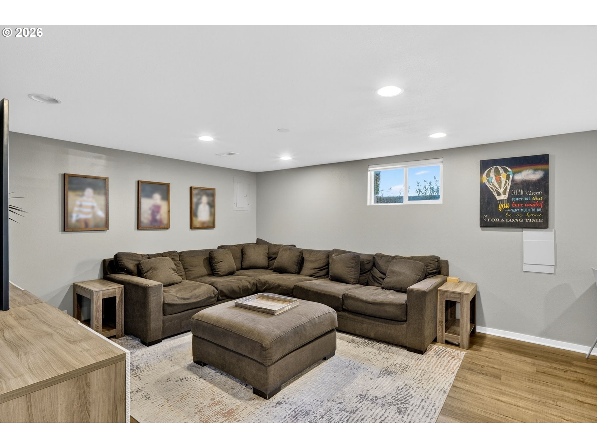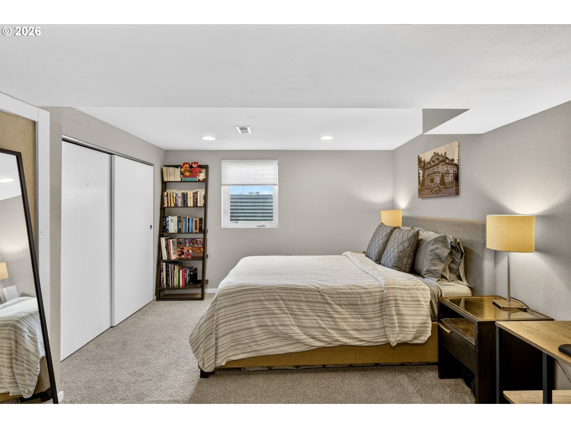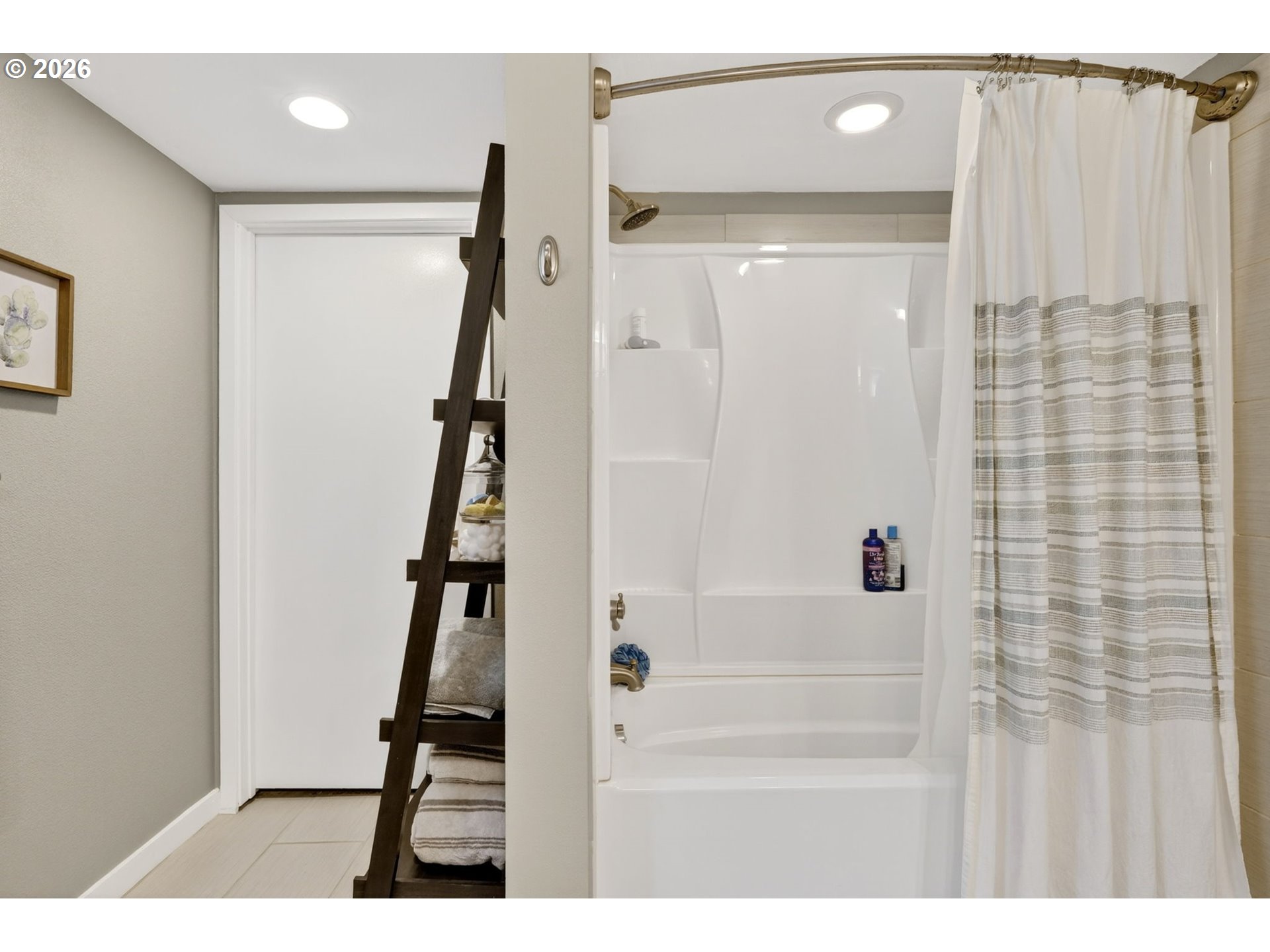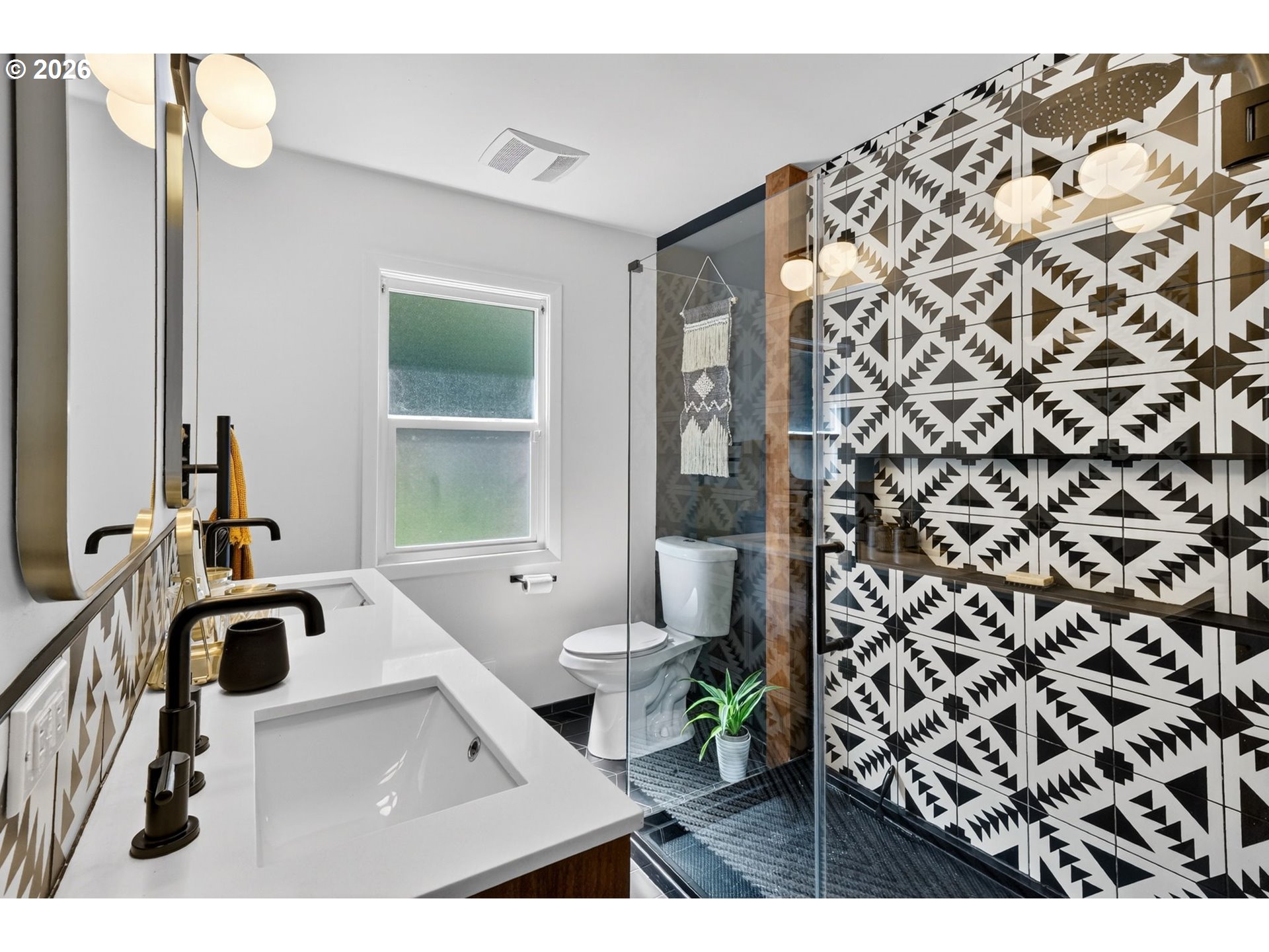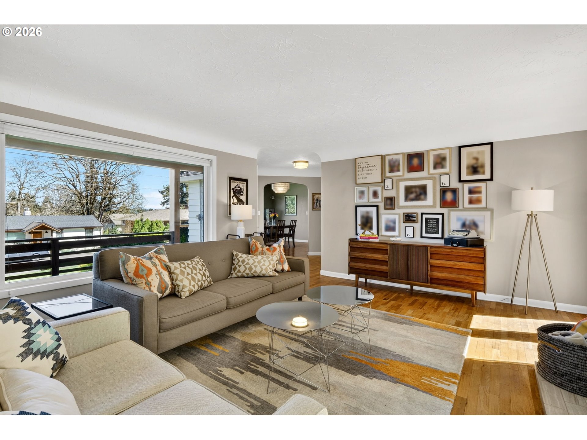 Welcome to this beautifully updated mid-century ranch set on a stunning .34-acre park-like lot blending timeless charm with modern upgrades. Surrounded by nature, enjoy peaceful views, wildlife, and space to relax or entertain. Inside, natural light fills the home through large picture windows. Features include original hardwood floors upstairs, newer EVP flooring and carpet downstairs with stylish updated lighting throughout. A 2023 remodel adds a luxurious primary suite with a custom bathroom, high-end tile and fixtures, custom vanity, and a spacious closet with built-in storage. An additional full bath includes a soaking tub, custom cabinetry, and designer cement tile. The kitchen offers cork flooring, stainless steel appliances, and an eat-in area with views of Mt. Hood and Mt. Adams, plus a butler’s pantry and mudroom with ample storage. Downstairs, an expansive family room with built-ins provides a perfect second living space. Outside, enjoy a private backyard retreat with a large deck with privacy wall, firepit, updated landscaping, fencing, walkways, and storage sheds. Major upgrades include air conditioning, a newer garage door with opener, garage storage racks, and a waterproofing system with transferable lifetime warranty. Conveniently located near parks, trails, the Willamette River, shopping, and dining—this home offers the ideal balance of nature and everyday living in one exceptional package!