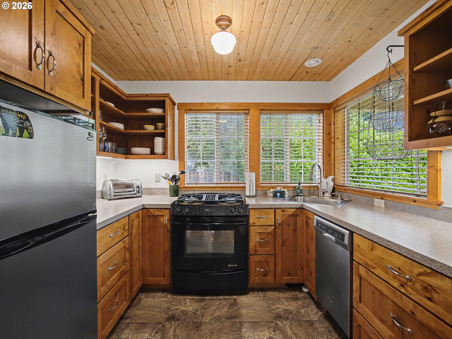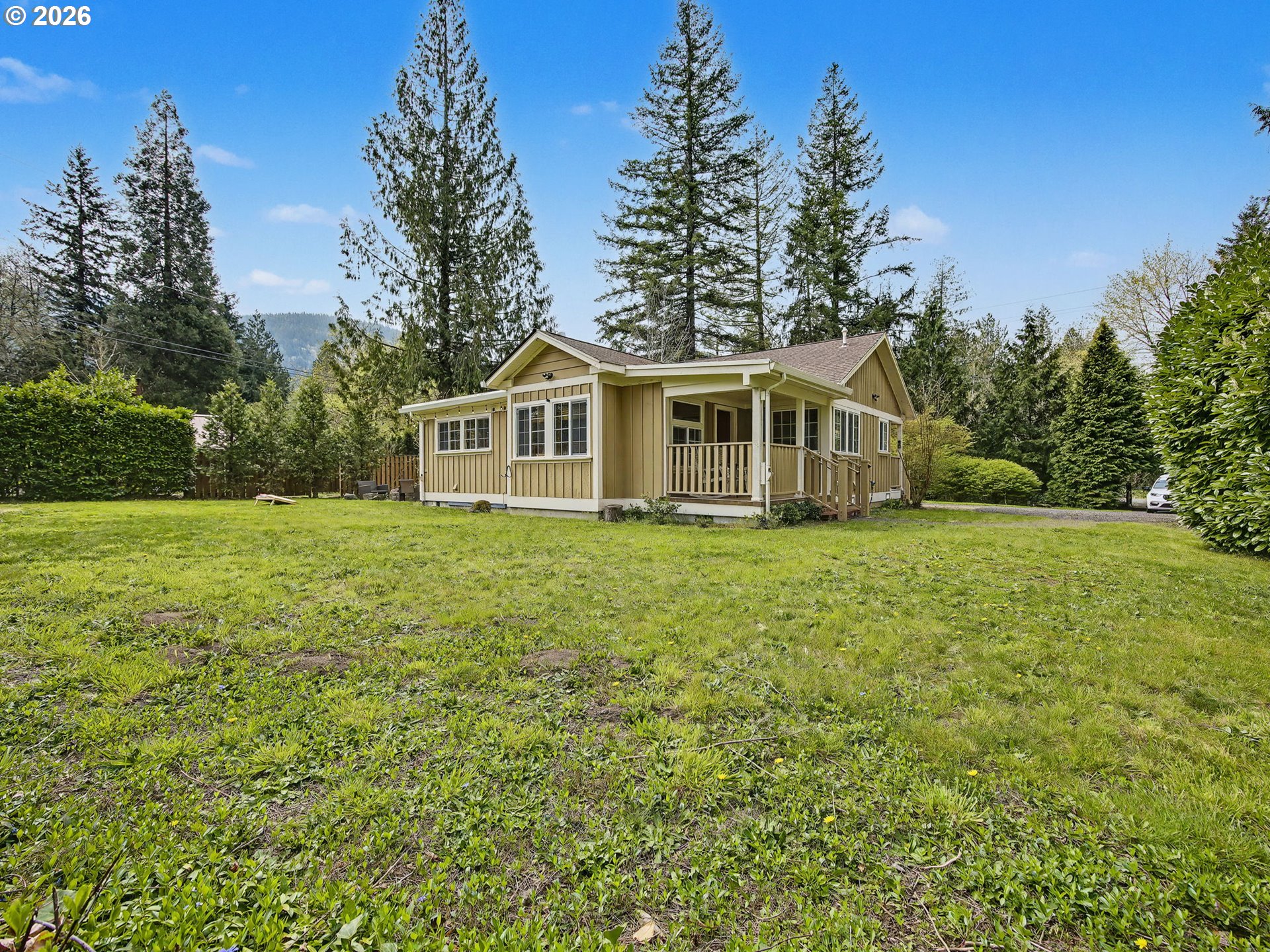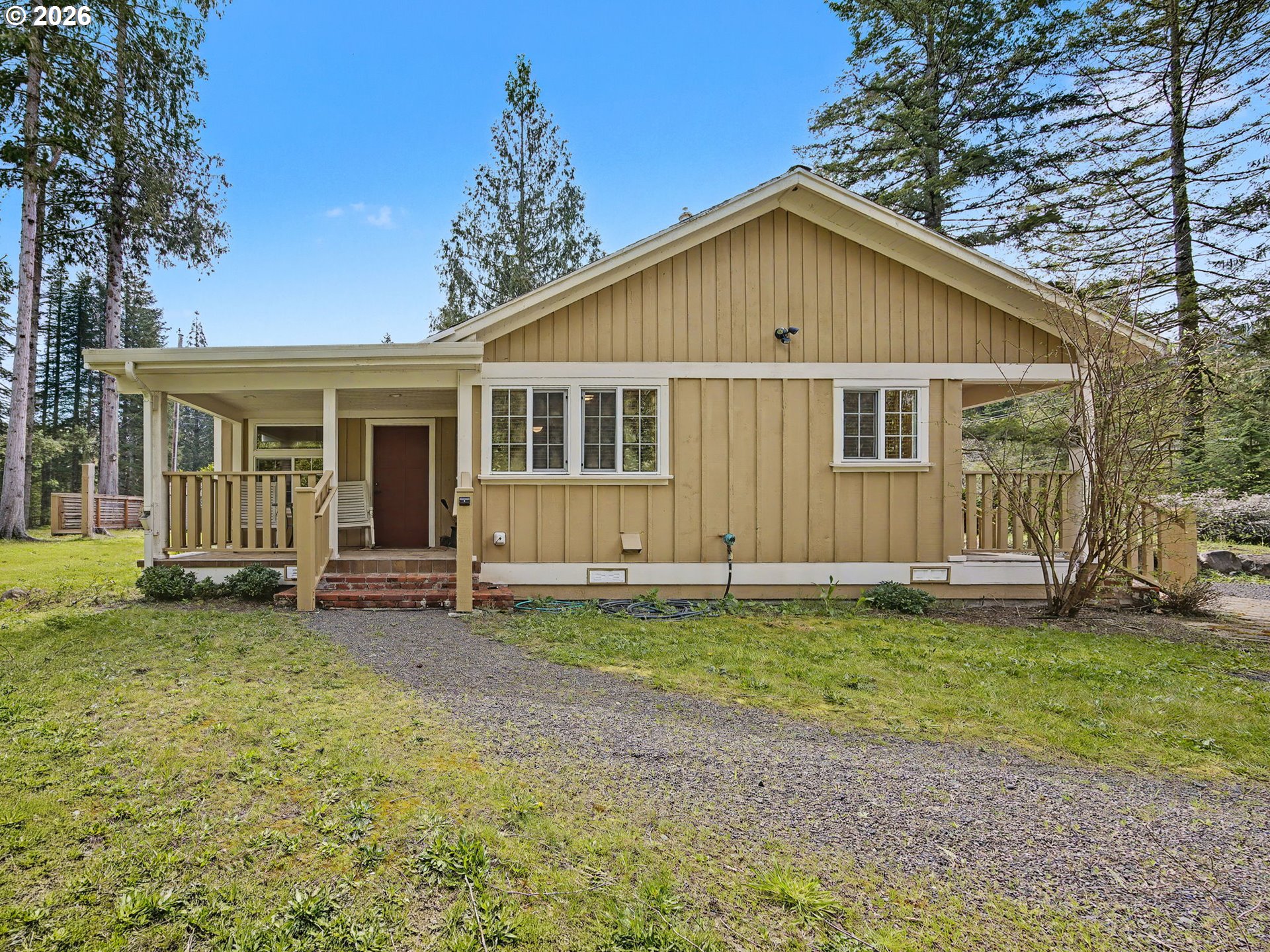 If you’re looking for a private retreat near the Sandy River on nearly a half acre, this updated 1925 Craftsman delivers Mt. Hood charm with modern comfort. Thoughtfully restored by a local craftsman, this 2 bedroom, 1 bath cabin is ideal as a full-time residence, second home, or investment property. Step inside to an impressive great room featuring a stone fireplace, soaring vaulted wood ceilings with exposed beams, and restored paned windows that fill the space with natural light. The open living and dining area flows easily into the kitchen, complete with stainless steel appliances and a gas range. Wood floors run throughout the home.The spacious bathroom offers a tiled walk-in shower and integrated laundry area. The primary bedroom opens to a private deck, while the second bedroom, just off the living room, features barn doors and bunk beds for guests.Previously used as a short-term rental, the home is being sold furnished. Shared well and a newer septic system (installed approximately 5 years ago). Bonus outbuilding/shed for storage. Outdoor living shines with multiple gathering spaces, including two stone patios and a large fire ring—perfect for summer evenings. The backyard offers room for games and relaxation, with views toward Devil’s Backbone Ridge along the historic Barlow Trail. Enjoy the sound of the Sandy River just a short distance away.For outdoor enthusiasts, the Sandy Ridge Trail System with 17 miles of biking trails is just minutes away. Convenient access to Highway 26 puts you on the slopes in about 20 minutes, with hiking, rivers, and Mt. Hood National Forest all nearby. Groceries and restaurants are approximately 5 minutes away, and PDX is under an hour—making this an ideal mountain escape. Open this Sunday 11:30-1:30