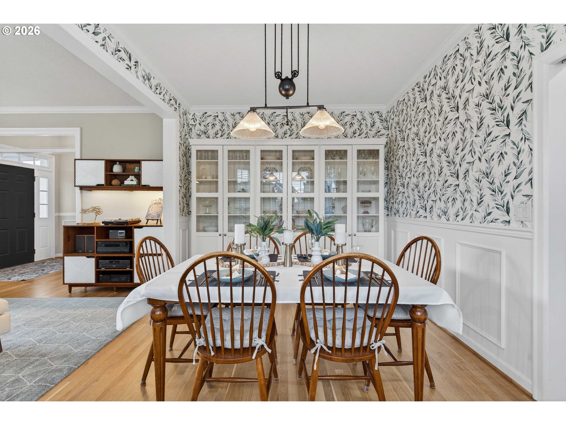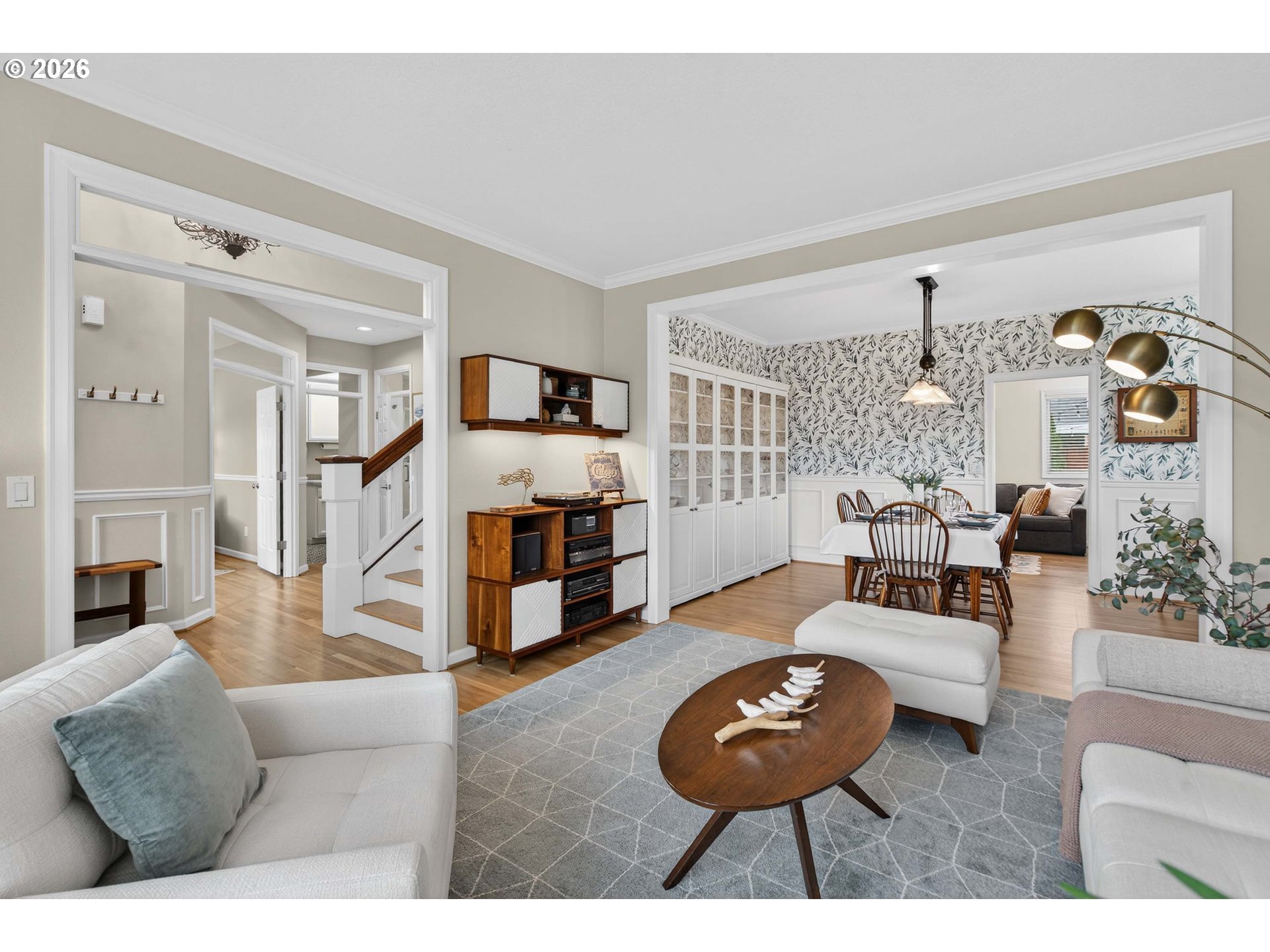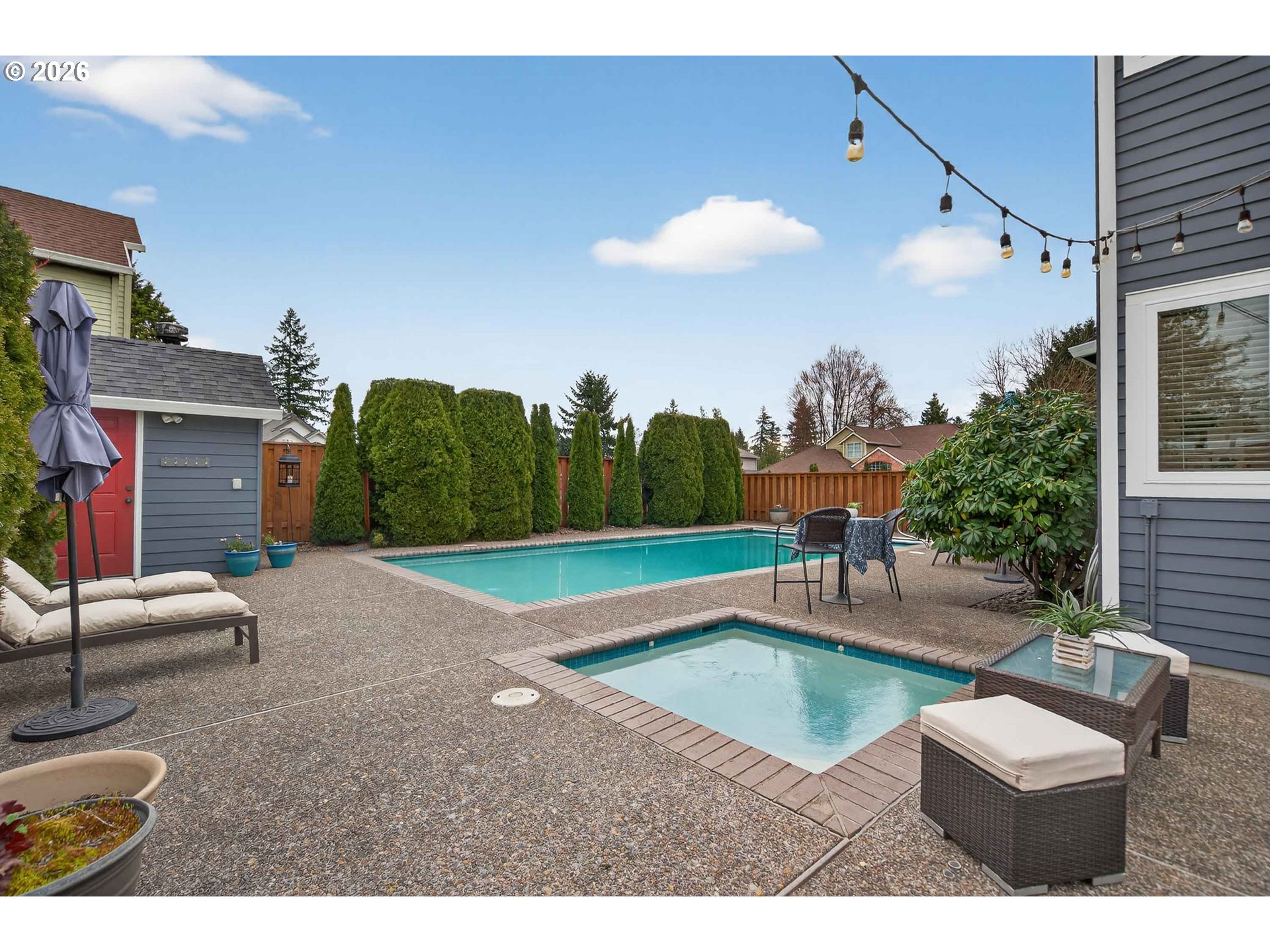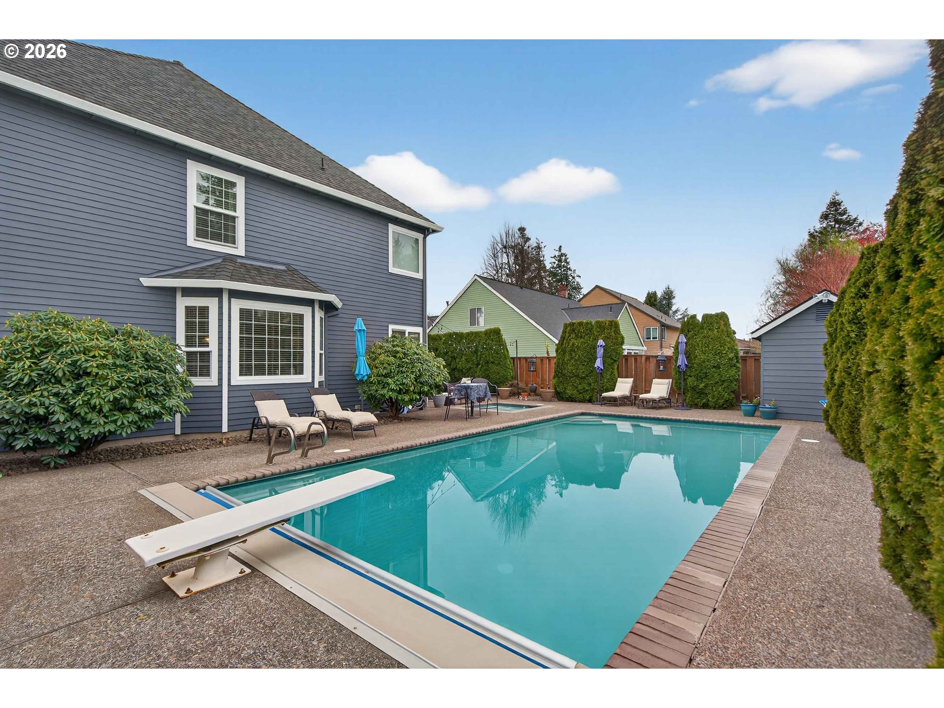This colonial traditional in Milwaukie sits on a quiet cul-de-sac corner lot with a heated pool, diving board, hot tub, and covered patio. Heated pools are not common in the Portland metro. This one gets used.The 2024 kitchen renovation touched everything: floor-to-ceiling walnut-toned cabinetry with pull-out drawers, quartz countertops, a GE Cafe 6-burner professional range with wok burner, beverage and wine cooler, pop-up mixer cabinet, island, and a 40x57 atrium window that lifts open to the covered patio. Main floor oak hardwoods were refinished the same year with millwork added throughout. The family room anchors the back of the main floor with a gas fireplace and stone surround.The layout works for different households. A main floor flex room with closet sits next to a full bathroom, practical as an office, guest room, or multi-generational setup. Upstairs the primary suite is 13'4 x 19'1 with a walk-in closet and ensuite with jacuzzi tub, walk-in shower, double sinks, and granite countertops. Two additional bedrooms share a full hall bath. A fourth room at 21x22 with angled ceilings works as a bedroom, studio, or bonus space.The three-car garage is finished with LVP flooring, built-in cabinetry with butcher block counters, stacked laundry, and natural light. Additional updates include Milgard double pane vinyl windows and exterior paint last year, and two-zone high efficiency heating and cooling. No HOA.
