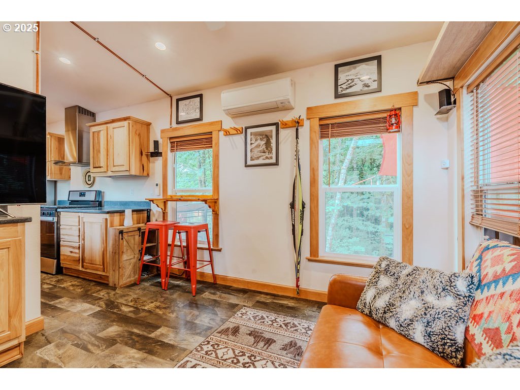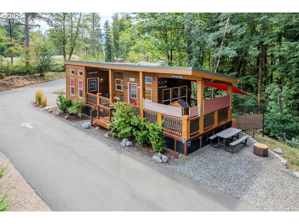 Charming cabin nestled in the trees located in the highly desirable Mt Hood Village with all of the fantastic amenities. One level living featuring bright, open living spaces with large windows and high ceilings throughout. This beautiful high-quality build is clean, fresh and move in ready. The kitchen offers new stainless-steel appliances, gas stove and oversized farm sink. The generous outdoor area is equipped with a utility shed and private deck facing lush green trees at your back door. This private, scenic community provides access to swimming pool, sauna, hot tub, game room, community center and just minutes to stunning Mt Hood for all of your adventures, providing the perfect blend of nature, relaxation and low-maintenance living- ideal for year-round living or weekend getaways.