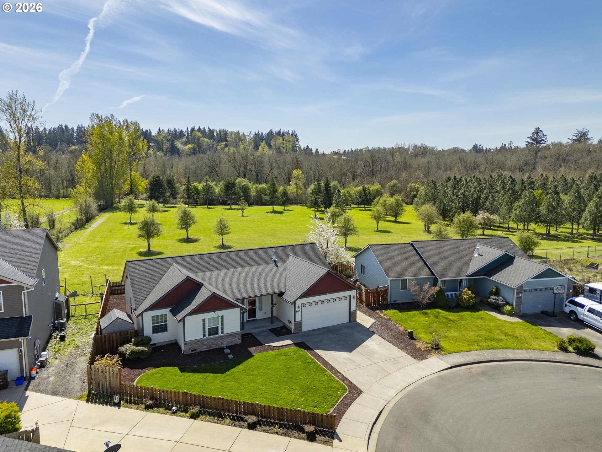 Open House 4/11 & 12 from 12-2. Desirable single-level home with 1,513 sq ft, situated on a quiet cul-de-sac and backing to scenic greenspace with views toward Davies Nature Park. Vaulted ceilings in the living room and primary suite enhance the open layout and natural light throughout. The great room design offers seamless flow between the living, dining, and kitchen areas, with sliding doors from both the dining room and primary bedroom leading to the patio — ideal for enjoying the peaceful backyard setting. Features include 3 bedrooms, 2 bathrooms, utility room, covered front porch, and attached 2-car garage. Conveniently located near parks, trails, and local amenities while offering privacy and a quiet neighborhood feel.