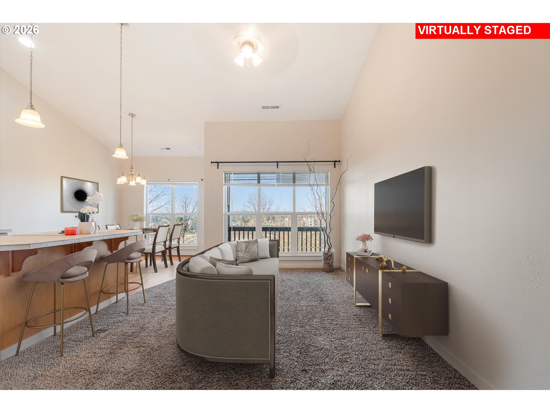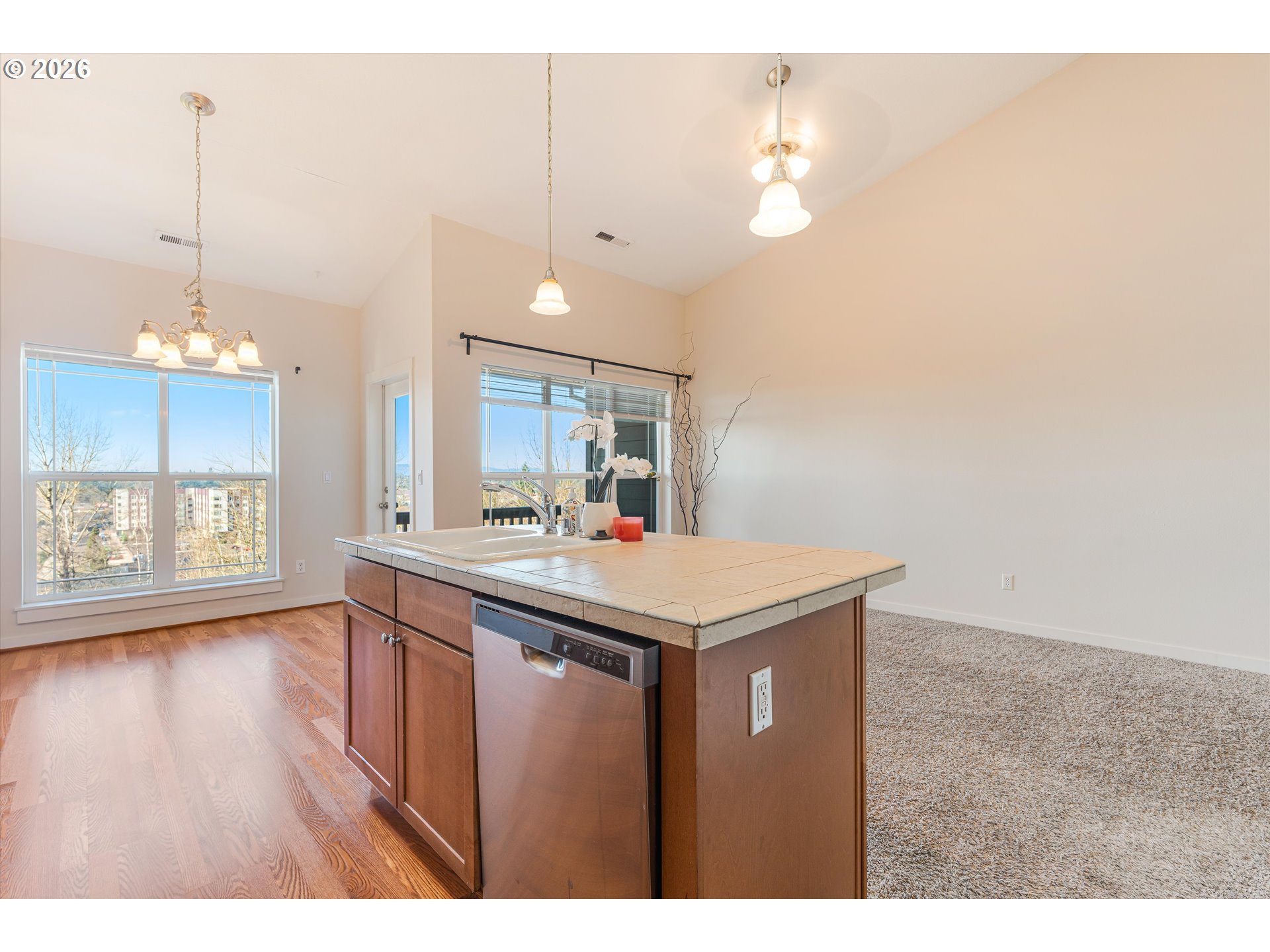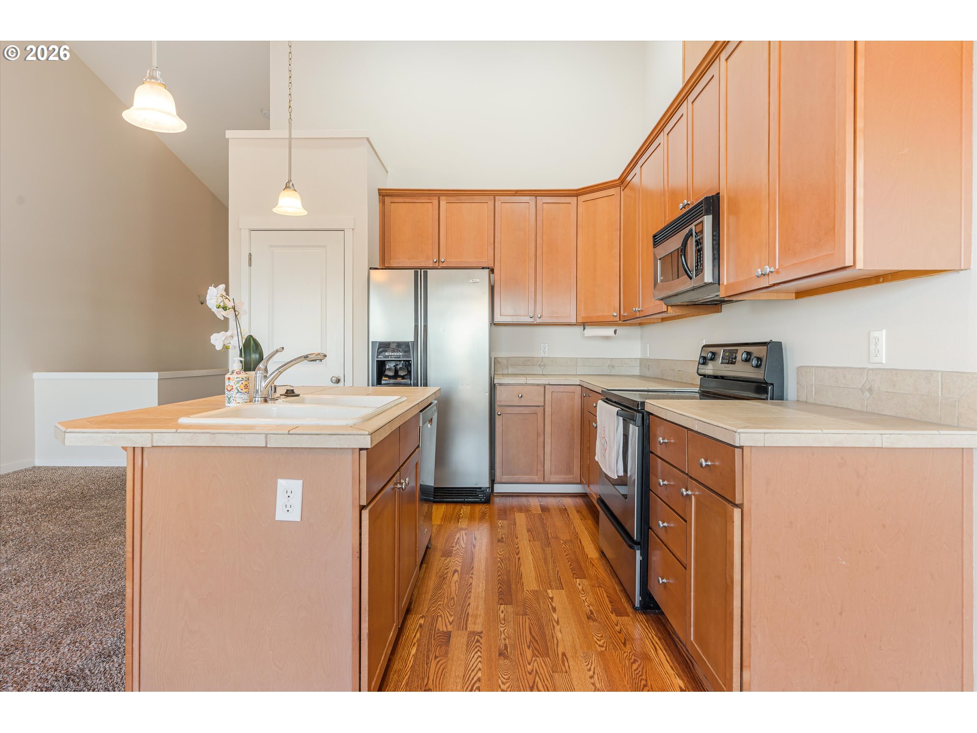 This home welcomes you with soaring vaulted ceilings a kitchen that includes stainless steel appliances, an island, and brand new laminate flooring.Freshly painted interior. Primary suite includes an attached full bathroom with a double vanity and walk-in closet. An additional half-bath is located upstairs. Large windows throughout contribute to an effortless flow of indoor brightness and allow for peaceful views. Downstairs, enjoy the extra family room along with two bedrooms, a full bath with walk-in shower, and a washer and dryer. Located minutes away from I205, MAX, Kaiser Sunnyside hospital, various shops, and restaurants. Call today to tour this coveted end unit townhouse with low HOA dues!