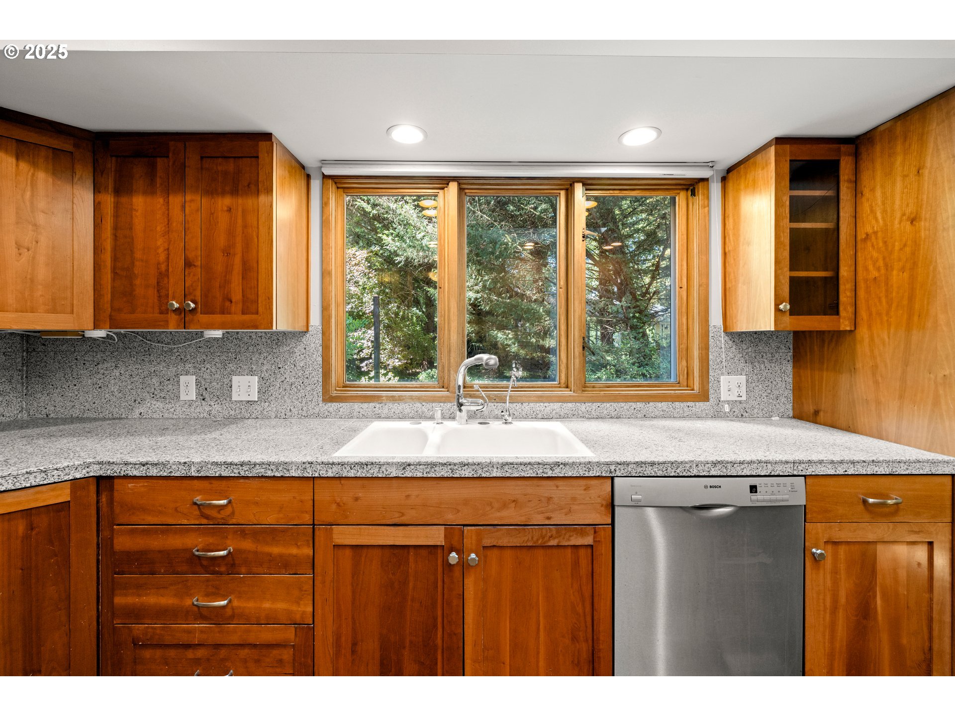 Close to First Addition and steps from Forest Hills Elementary on a quiet cul-de-sac , this mid-century modern home offers access to the private Forest Hills lake easement. The freshly painted main level features hardwood floors, built-ins, expansive windows, and a fireplace anchoring the open living/dining area. The kitchen offers granite tile counters, stainless appliances, a prep counter, and refinished hardwoods. Also on the main are three bedrooms including a primary suite with quartz vanity. Updated baths feature LVP flooring. The daylight lower level adds a family room with fireplace, new paint,new carpet, and a flexible fourth bedroom or office. Outdoors, enjoy a large deck and natural landscaping for privacy. With walkability to First Addition, Forest Hills Elementary, Tryon Creek, and downtown Lake Oswego, this home combines everyday convenience with exclusive lake easement access and a unique find. Roof was replaced September 2023, exterior paint 2020 Check out Lake Corp for Easement Information or see private remarks for link.