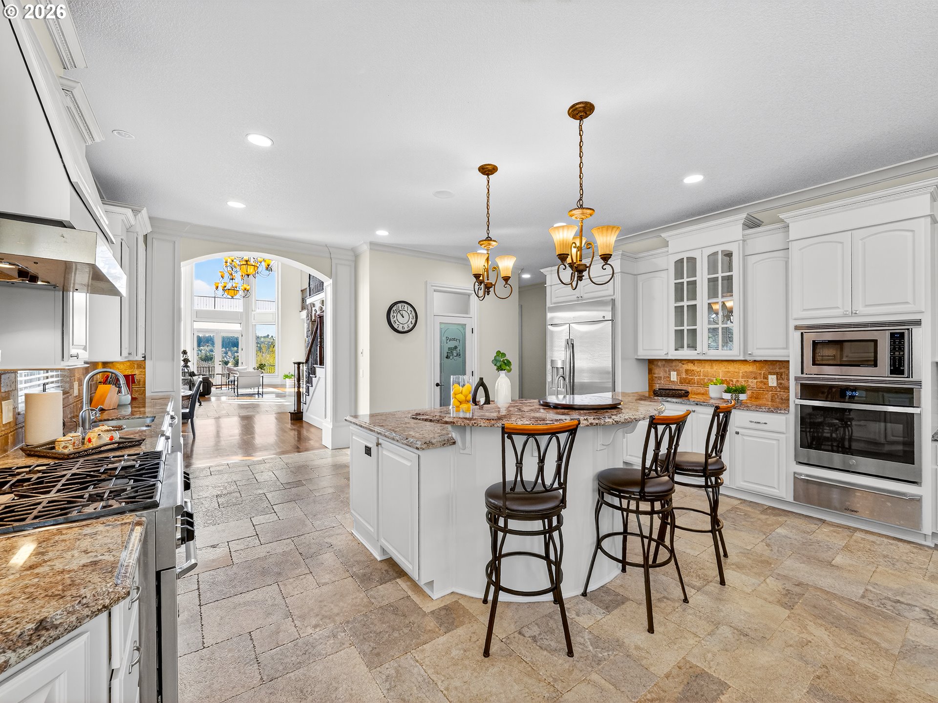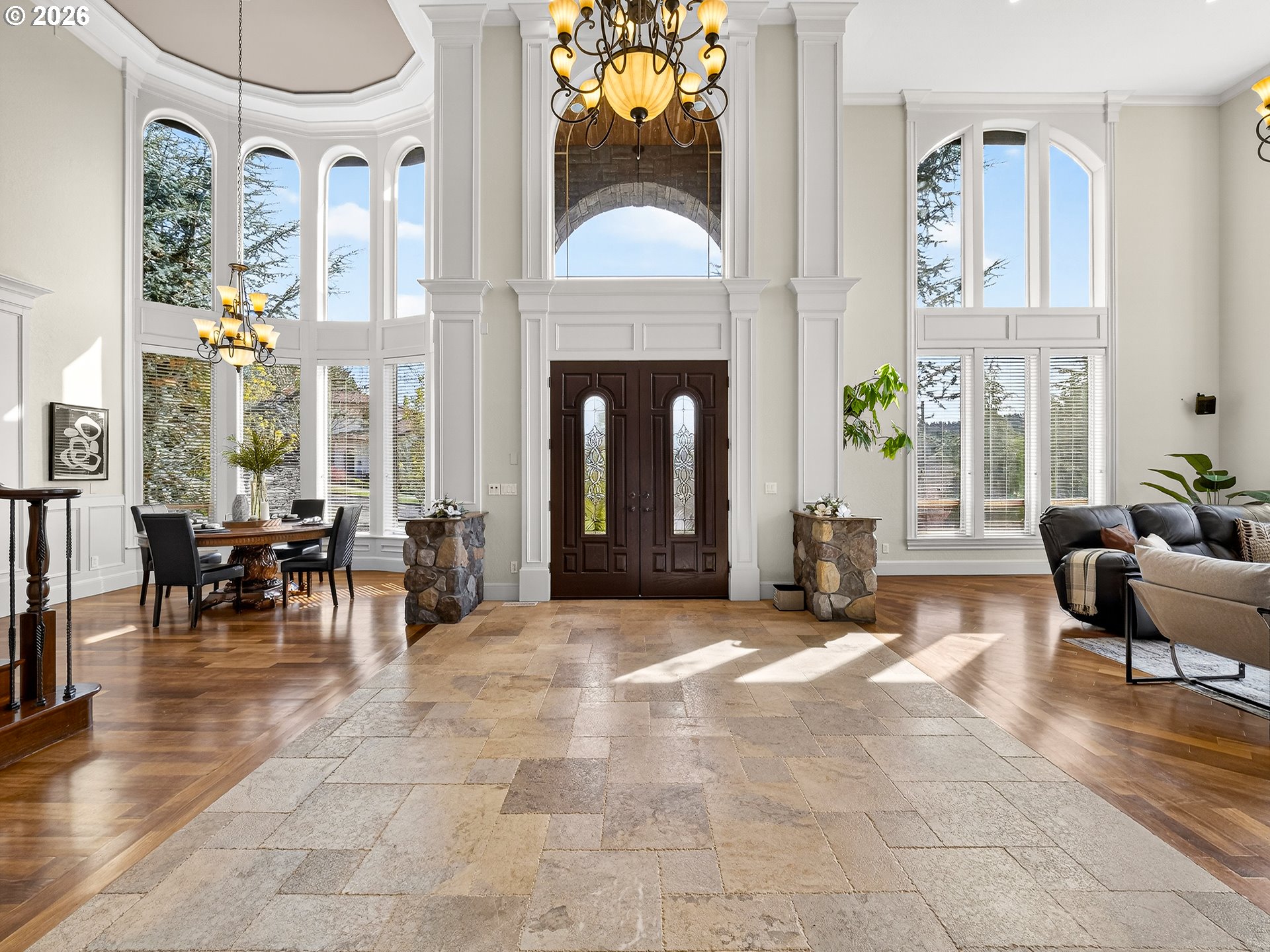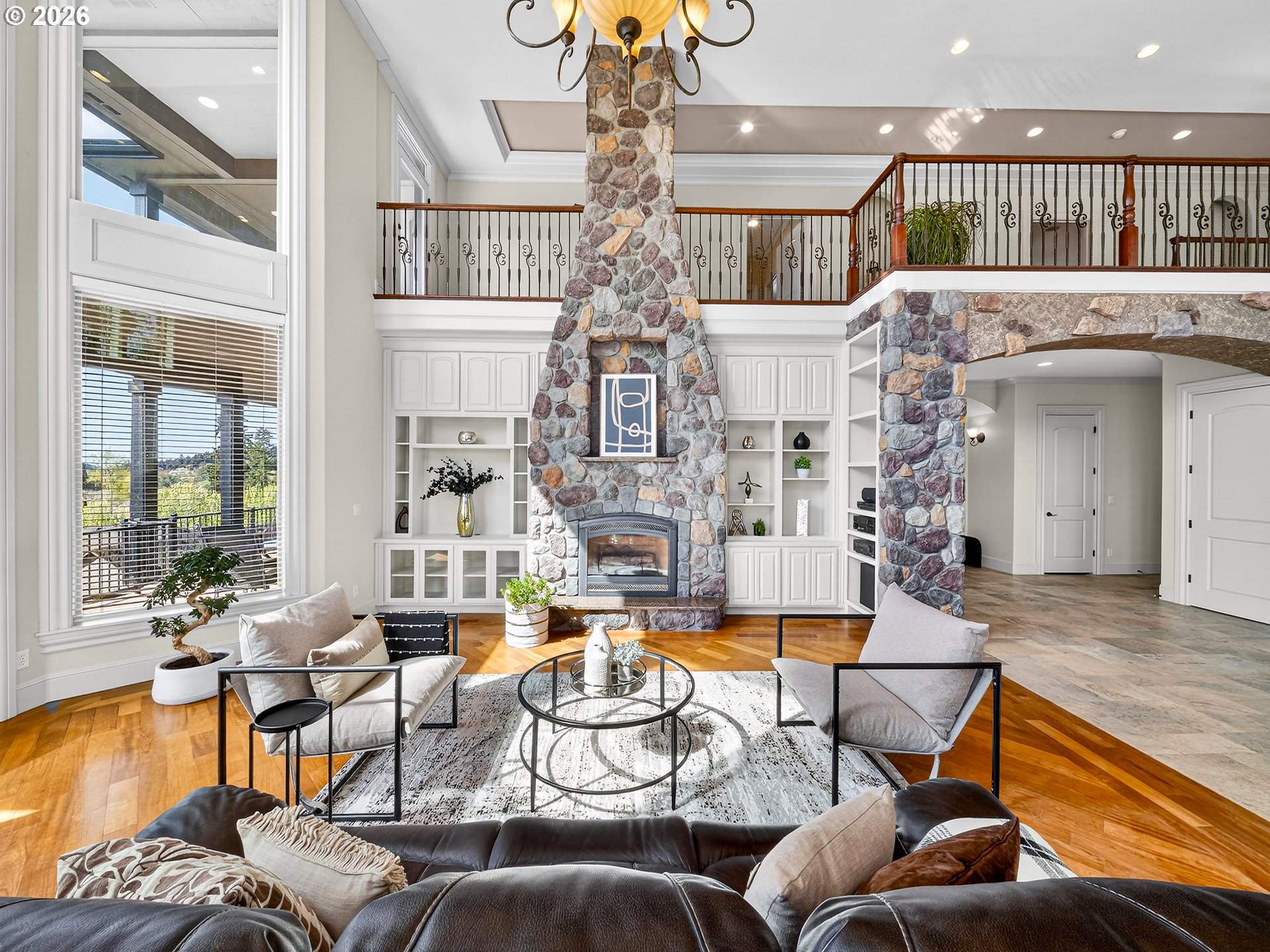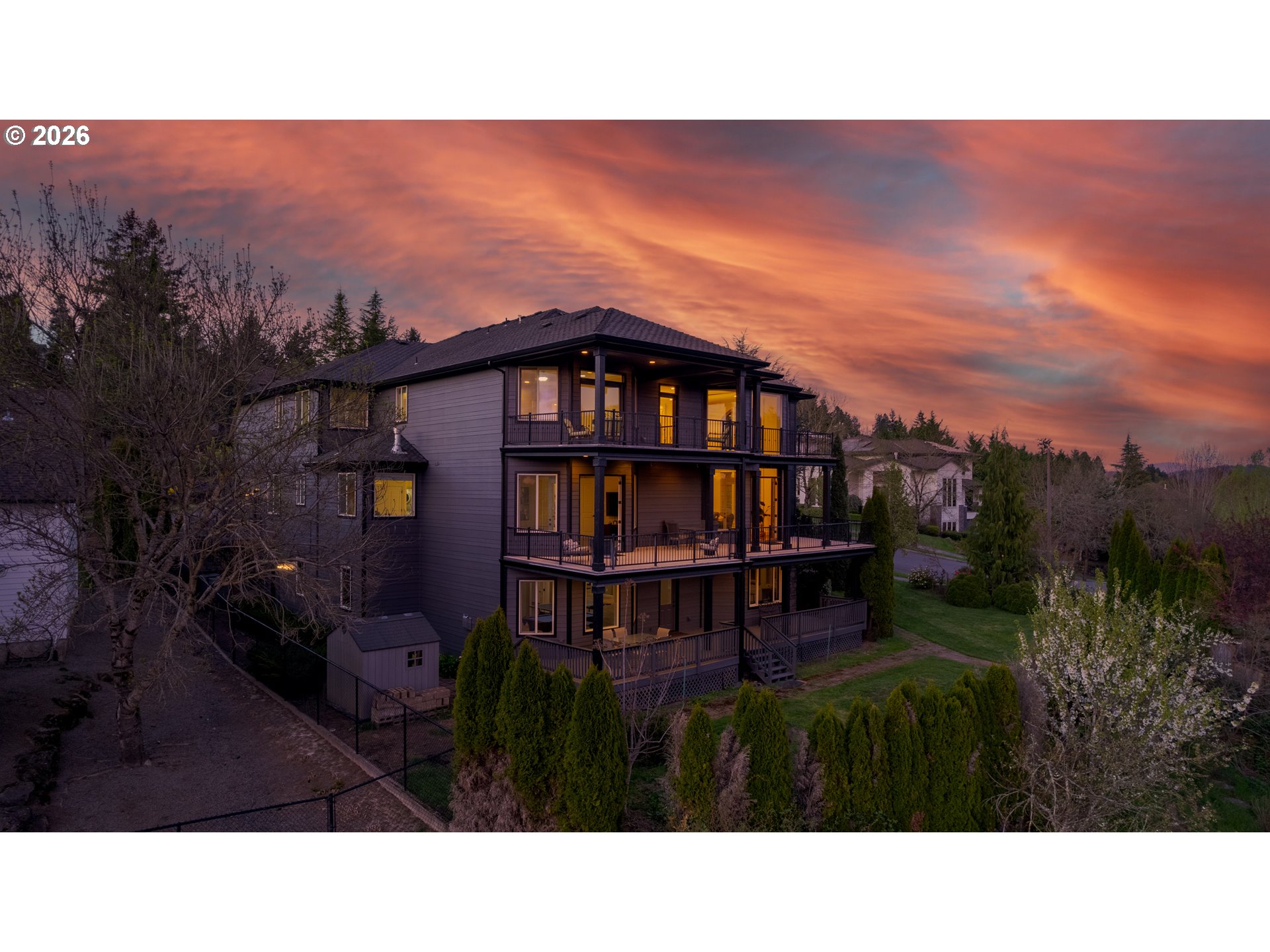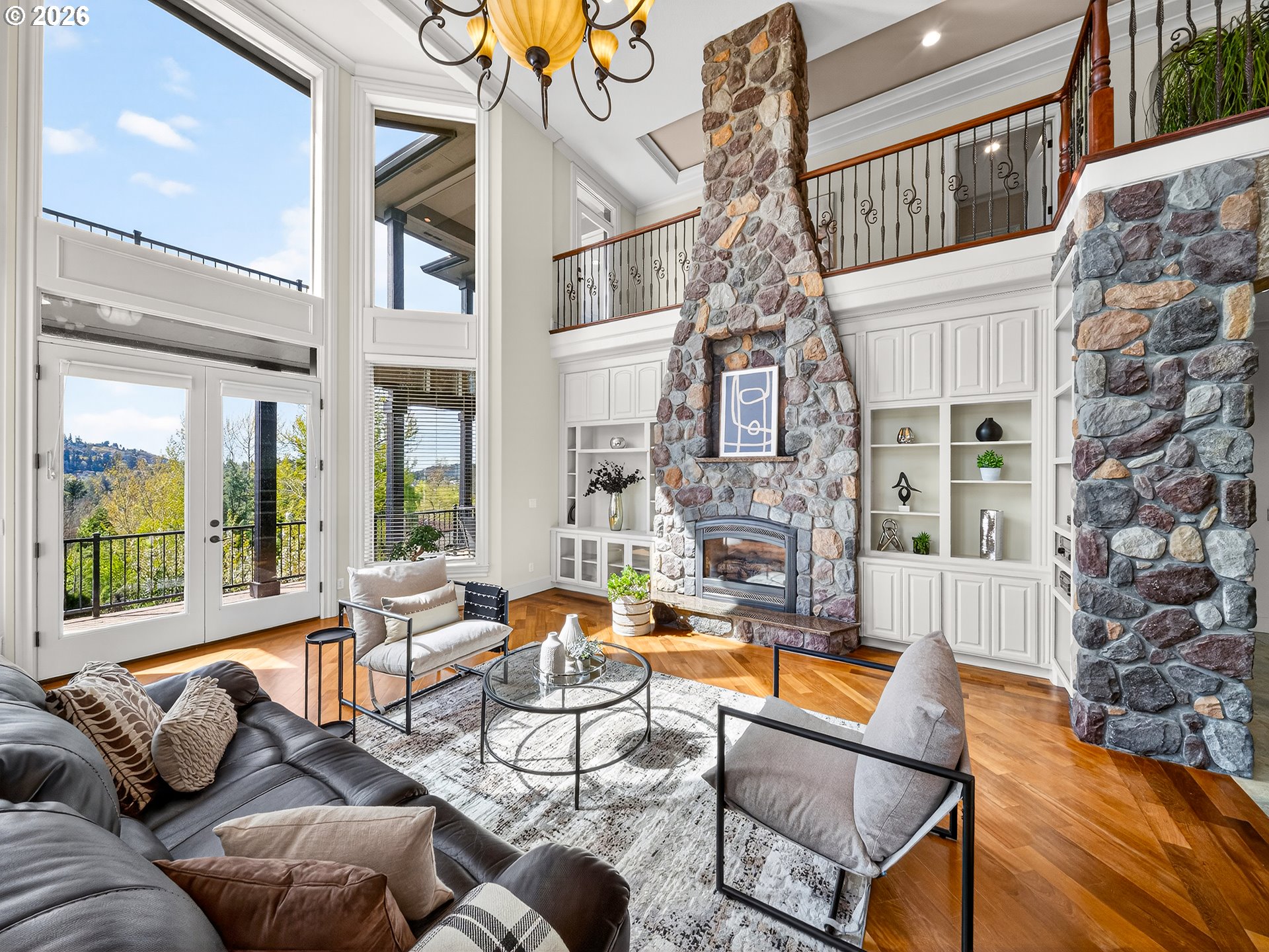 Spanning almost 8,500 square feet, this luxurious Happy Valley estate delivers a level of scale and custom finishing that is rarely available. The home boasts three expansive levels with a private deck on each floor to capture the sprawling views. The experience begins in the grand entryway, where towering windows and soaring ceilings create volume and natural light. In the formal living room, a floor to ceiling stone fireplace stands as a massive focal point, surrounded by custom built-in shelving. The gourmet kitchen features a built-in refrigerator, double ovens, stainless steel appliances, a cook island, and more. The primary suite has French doors opening directly to the expansive deck. The en-suite bathroom includes it’s own fireplace, a whirlpool jacuzzi, and a steam shower for a spa-like retreat. The lower level is a dedicated entertainment floor, featuring a movie theater, game room, wet bar, recreation room, and a home gym with a sauna. The large home office includes extensive built-in bookshelves to accommodate a professional library. Each floor has it’s own dedicated furnace and central vacuum system. Additional features include fresh interior & exterior paint, an indoor water fountain, surround sound system, two a/c units, crawlspace storage, a 3-car garage, and more. The residence is located in close proximity to Happy Valley Park, allowing for easy access to the various community events and outdoor activities held throughout the year.