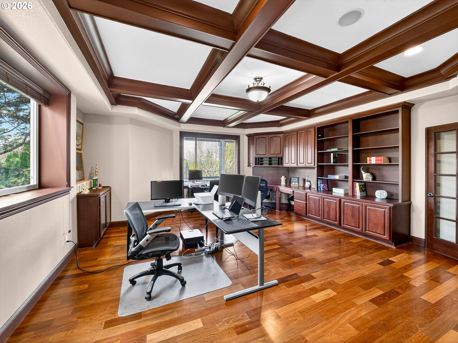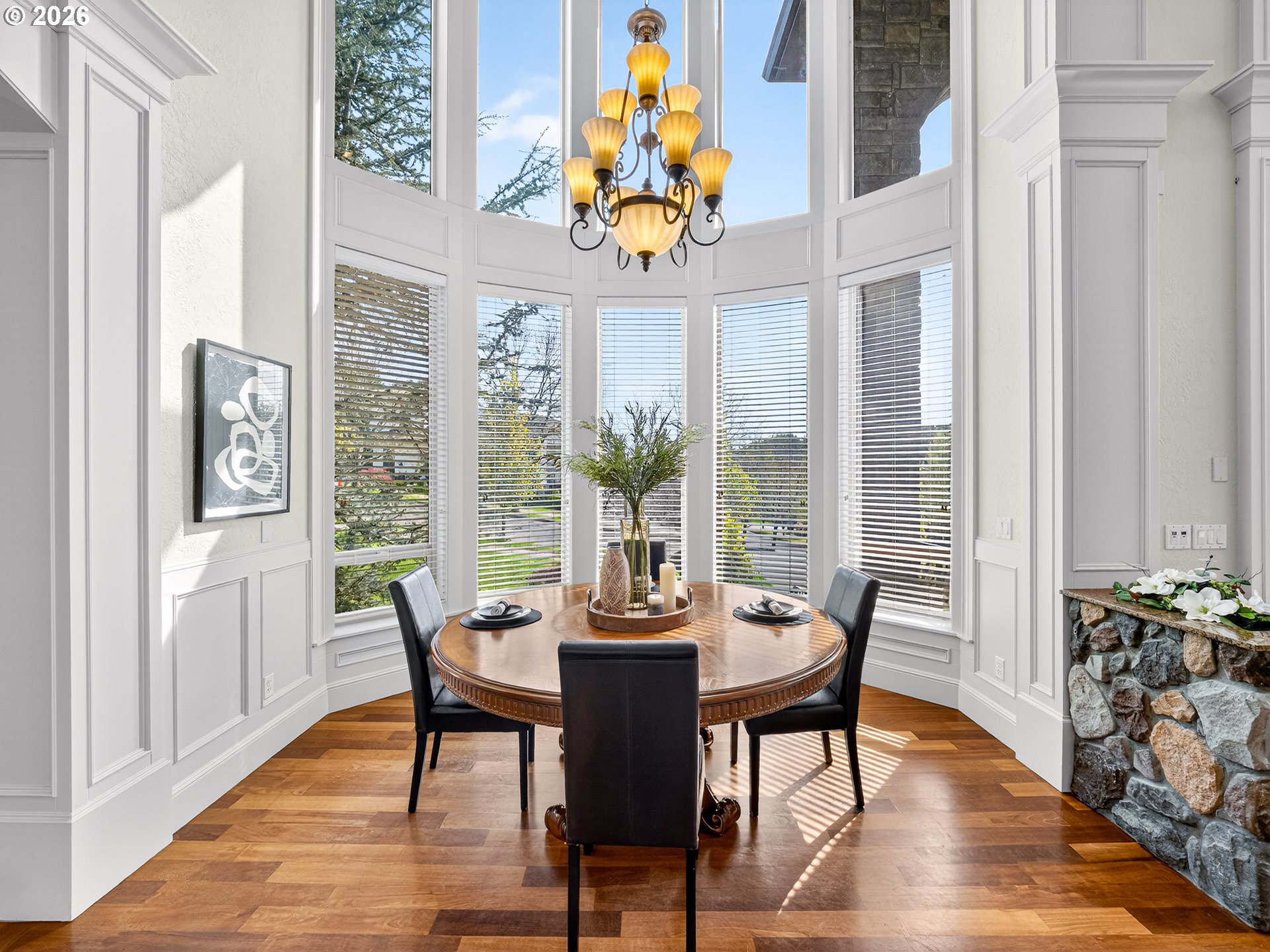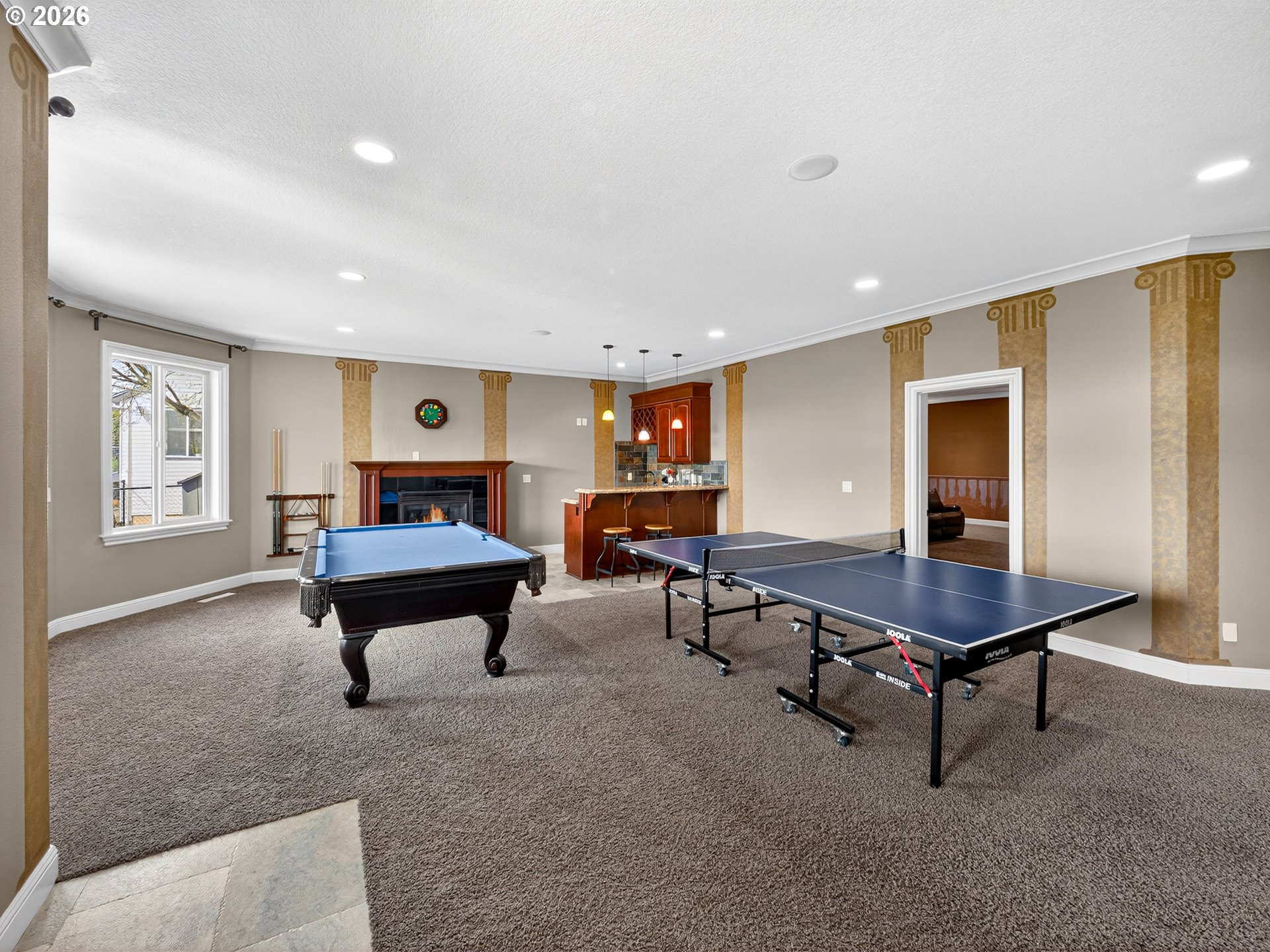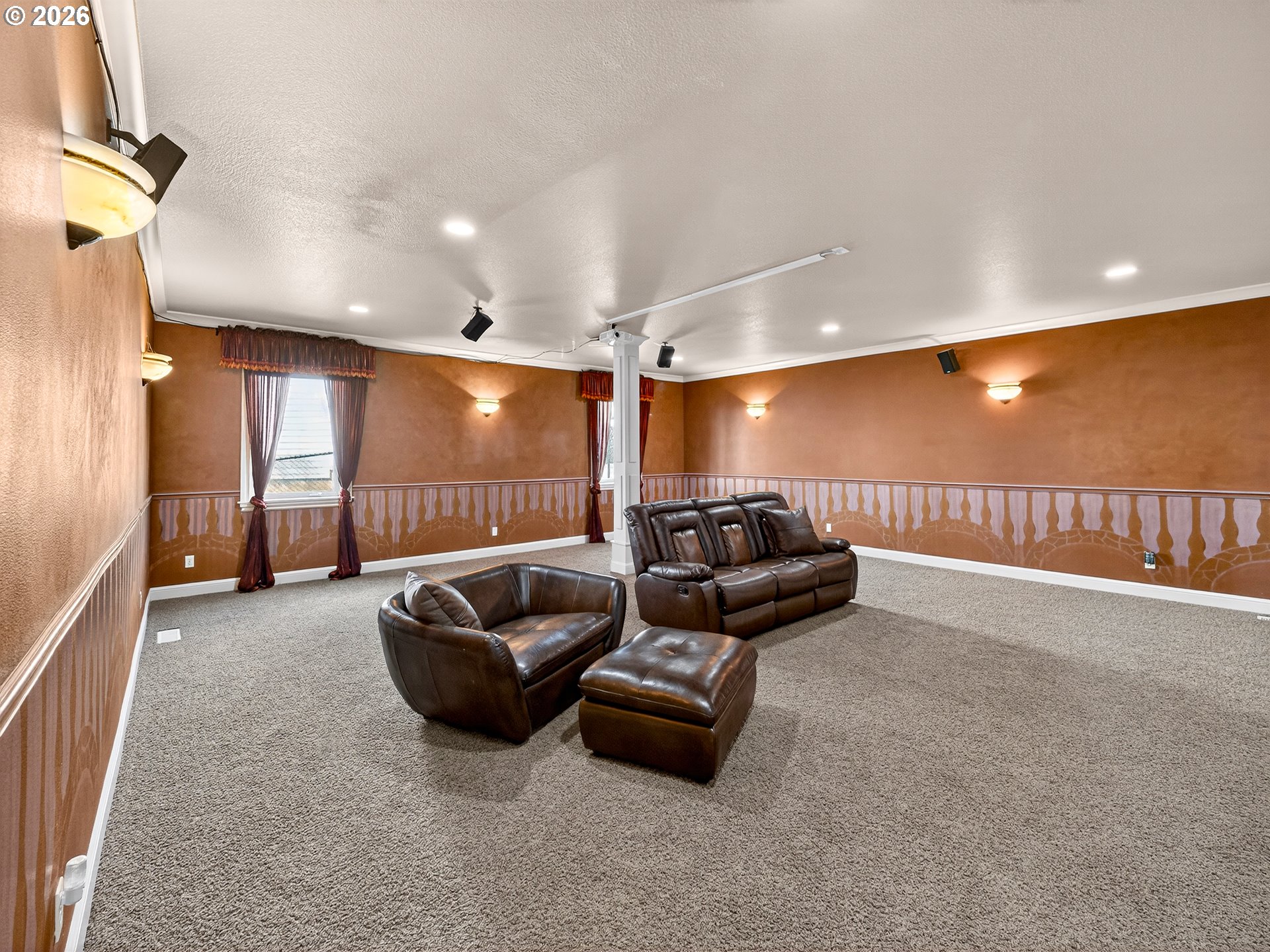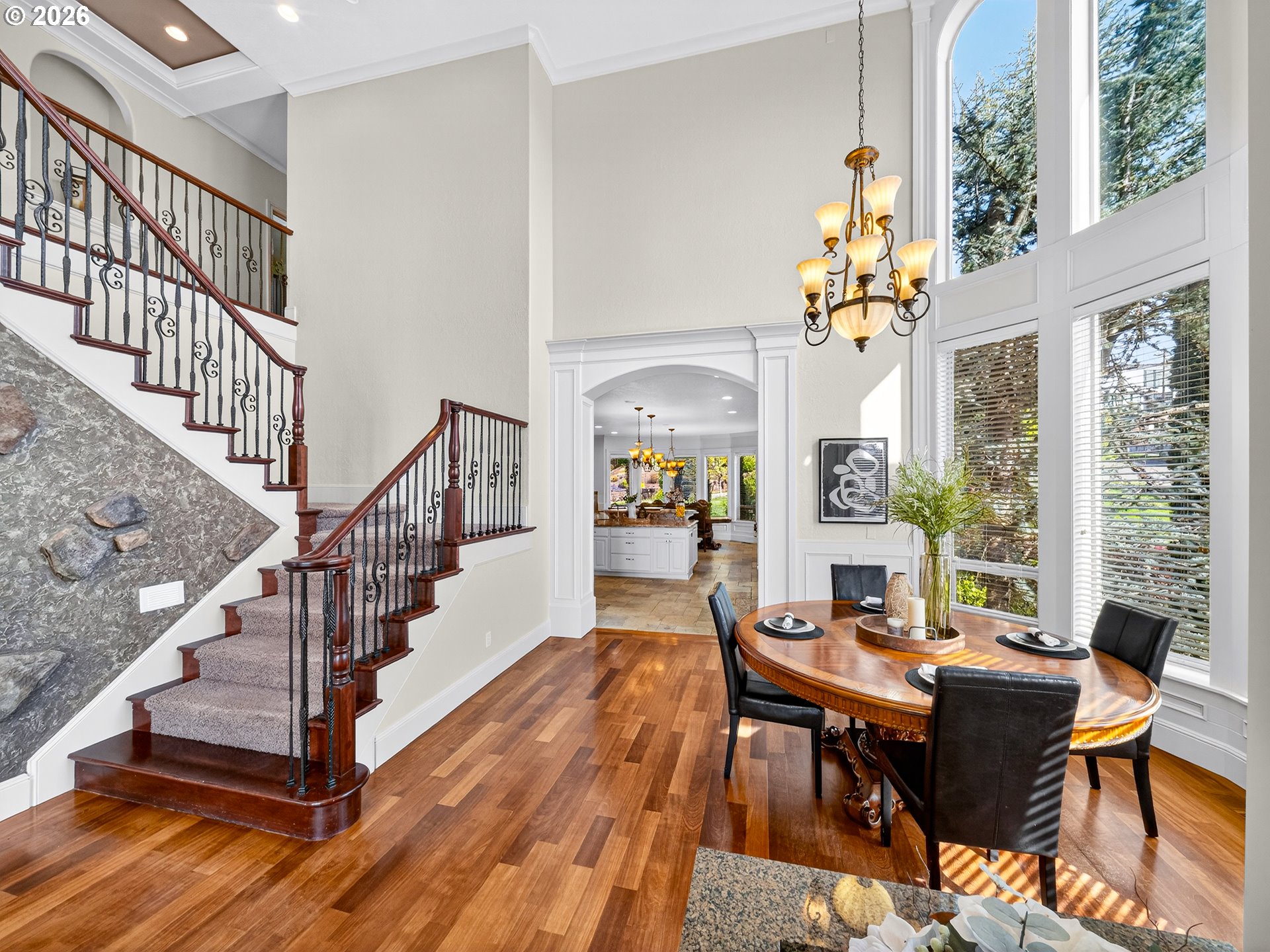 Spanning almost 8,500 square feet, this luxurious Happy Valley estate delivers a level of scale and custom finishing that is rarely available. The home boasts three expansive levels with a private deck on each floor to capture the sprawling views. The experience begins in the grand entryway, where towering windows and soaring ceilings create volume and natural light. In the formal living room, a floor to ceiling stone fireplace stands as a massive focal point, surrounded by custom built-in shelving. The gourmet kitchen features a built-in refrigerator, double ovens, stainless steel appliances, a cook island, and more. The primary suite has French doors opening directly to the expansive deck. The en-suite bathroom includes it’s own fireplace, a whirlpool jacuzzi, and a steam shower for a spa-like retreat. The lower level is a dedicated entertainment floor, featuring a movie theater, game room, wet bar, recreation room, and a home gym with a sauna. The large home office includes extensive built-in bookshelves to accommodate a professional library. Each floor has it’s own dedicated furnace and central vacuum system. Additional features include fresh interior & exterior paint, an indoor water fountain, surround sound system, two a/c units, crawlspace storage, a 3-car garage, and more. The residence is located in close proximity to Happy Valley Park, allowing for easy access to the various community events and outdoor activities held throughout the year.
