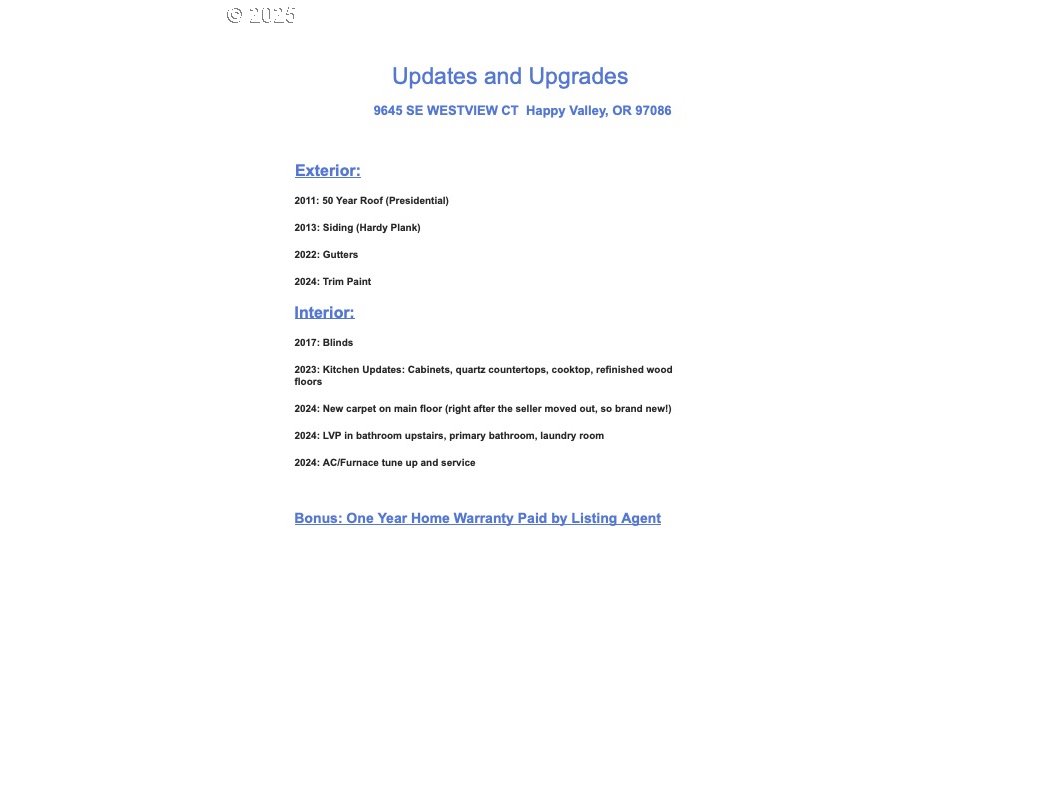 (503) 893-8874HUGE PRICE DROP! One Owner, Premium Upgrades, Home Warranty Included and all appliances to stay with home! This home is situated in a highly sought-after neighborhood and perfectly balances modern upgrades with timeless design. Nestled in the heart of Happy Valley, this stunning one-owner NW Contemporary home offers an exceptional blend of style, comfort, and thoughtful updates. Boasting a newer presidential roof and newer Hardie plank siding, this home is built for longevity and low maintenance. From the moment you step inside, you're welcomed by a grand marble entry, soaring ceilings, and a seamless flow of hardwood floors and brand-new plush carpeting. The recently renovated kitchen features gorgeous quartz countertops, new cabinetry, modern appliances, rich hardwood flooring, and a sliding door to the almost full wrap around back deck that creates an ideal space for cooking and gathering. On the main floor, you have an open floorpan from the two living spaces and dining area that are centered around beautiful landscapes and picture windows along side a sliding door to the deck, perfect for peaceful nights or lively hosting. The first floor bedroom, currently used as a den, could be used for main floor living or office/flex space boasts beautiful French doors, custom built-ins, new carpet, and elegant crown molding. The three-car garage alongside additional exterior parking provides ample room for storage, workspace, or perfect if you are a car lover! The secondary floor has three more bedrooms including a massive primary suite with jetted tub and walk in closet. The laundry room is situated perfectly in between all three room. Last but not least, don't miss the huge bonus space on the lower level! Complete with carpet and exterior access, this could be a great opportunity for an ADU, multigenerational living, or just a fun room for hobbies!