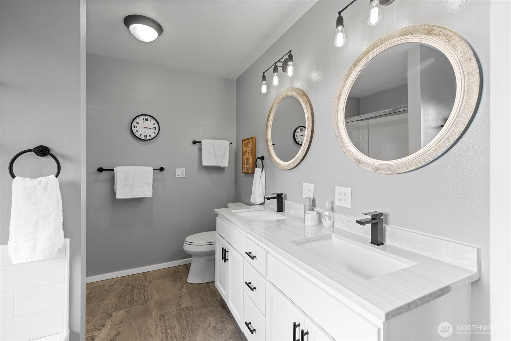 New year, new look--and better than ever! Immaculate 3BR+office+den+formal dining, 2.5BA home in a sought-after Mt. Angeles neighborhood in Port Angeles. Situated on 1.34 pristine acres, with views of the Straits, circular drive with modern lighting, curbing, natural landscaping, firepit, concrete RV pad with water, septic, and power, storage shop, composite decks (envision a hot tub--the wiring is there!), bold new garage door, covered porch leading into an updated comfortable living space you'll love; tall ceilings, striking hand railings, hardwood floors, wainscot, refreshed kitchen cabinets, quartz counters, stainless appliances, large living room windows to vaulted ceilings taking in the views, new floor-to-ceiling statement shiplap with electric fireplace, primary suite with walk-in closet and soaker tub with views to Canada, and a private office that could be used as a fourth bedroom. Oversized attached garage (nearly 1000SF!) with workshop, workout area, or open it up to one big space. Too many details to mention--must see in person!
