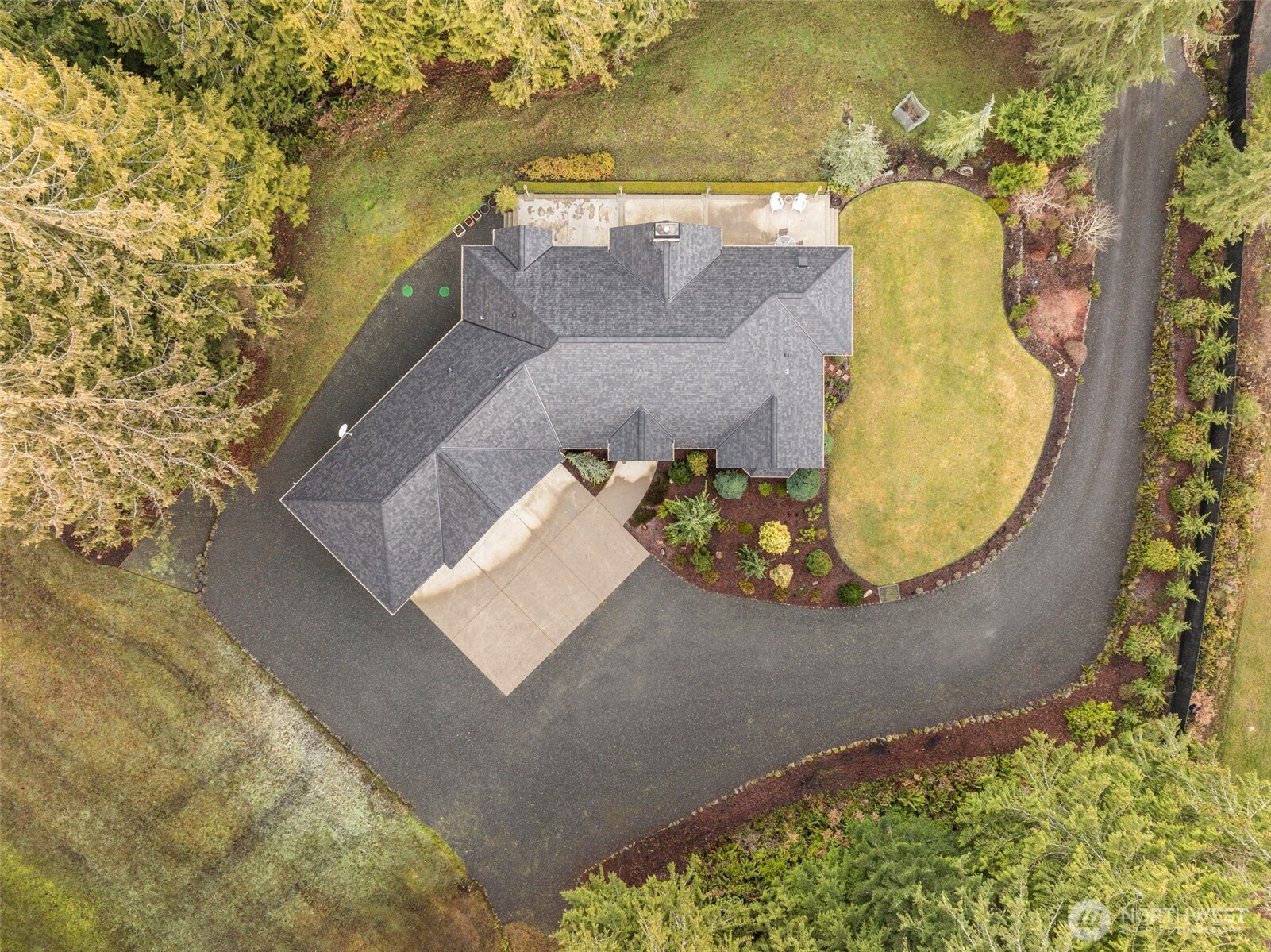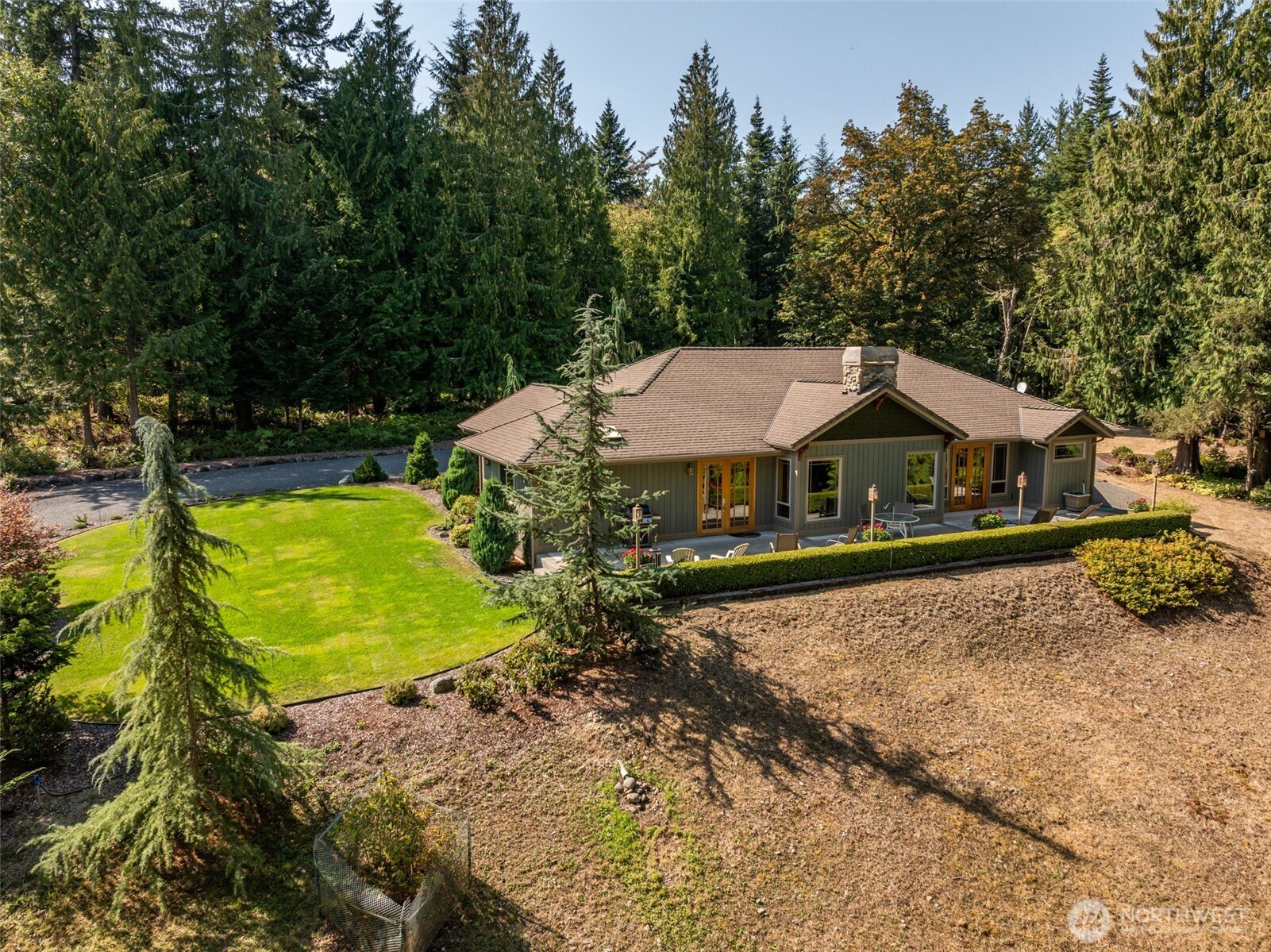 Exceptional Northwest living surrounded by nature on 10 tranquil acres comprised of two 5-acre parcels. A private, winding driveway through mature evergreens leads to a sun-drenched clearing showcasing this elegant 2005 custom home. Offering 2,378 SF of single-level living, this gem includes 3 bedrooms plus a den and 2.5 baths, all thoughtfully designed with timeless quality and craftsmanship. *** The open-concept layout boasts a grand great room with soaring vaulted T&G ceiling, exposed beams, and a striking stone-surround propane fireplace. The gathering kitchen is the heart of the home, featuring slab granite counters, a generous island, high-end appliances, and a walk-in pantry, seamlessly flowing into the dining area with built-ins and out to a 540 SF patio—perfect for indoor/outdoor living. *** Additional highlights include solid core doors, hardwood floors, built-in cherry cabinetry and speakers, central vacuum, NEW 40-year ROOF, full RV hookup, private trails, and an oversized 1,182 SF 3-car garage with workshop space. Meticulously maintained and truly move-in ready, this property blends a rare combination of privacy, comfort, and elevated Northwest appeal. *** Location: Situated on 10 wooded, park-like Acres outside southeast Port Angeles City in coveted Black Hawk Ridge, a quiet enclave of luxury homes, with loads of wildlife and supreme privacy. In close proximity to State lands for recreation. Only about 3 miles to shopping and dining.