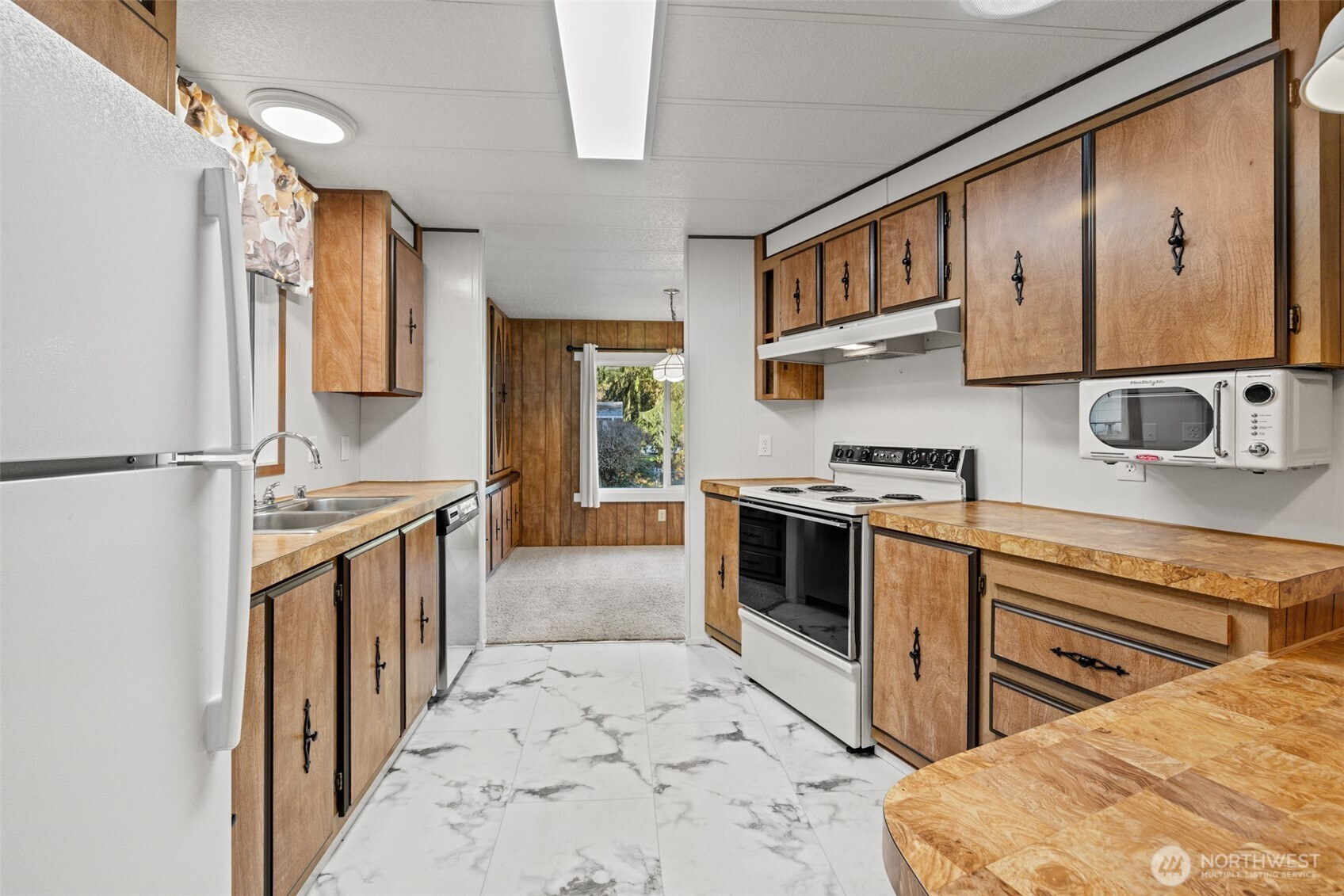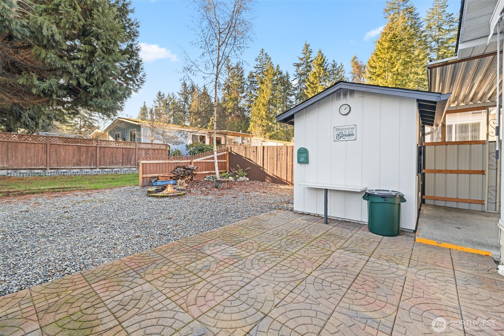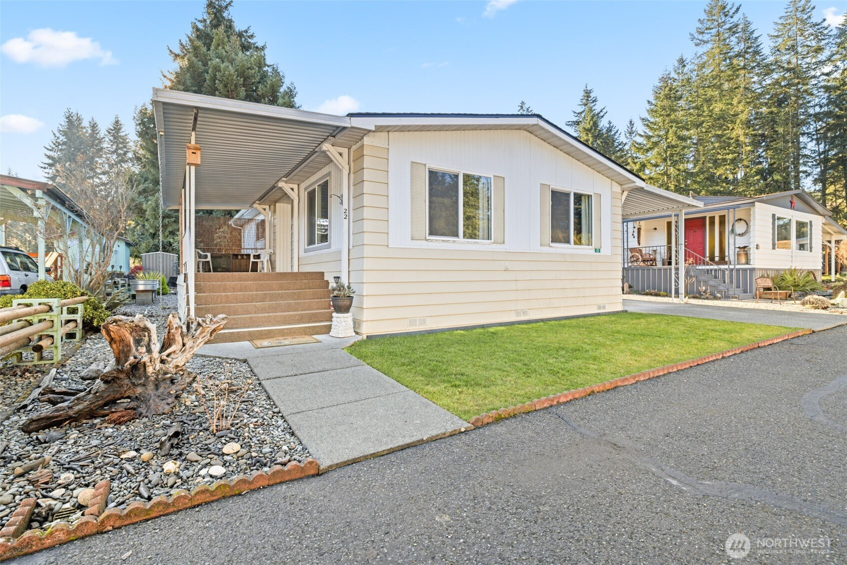 Your chance to own one of the best homes in Lazy Acres, conveniently located between Sequim and Port Angeles, across the street from Robin Hill Park and near the Olympic Discovery Trail! This 2BR 2BA home has been refreshed inside and out; new roof, vinyl windows, kitchen tile flooring, cabinet facing and fixtures, custom patio with retractable awning, fire pit, built-in outdoor BBQ counter, wine cooler, rock garden, potting bench and raised beds, strawberries, and lots of love and attention to detail. The huge carport is a great spot to park vehicles or use as an extra covered patio, and the front covered porch with electric fireplace is perfect for chilly or warm evenings. Three sheds are included for ample storage options, and the yard backs up to the park's green space, making this lot feel private and peaceful. Space rent is affordable and you can enjoy access to amenities and easy 55+ living. Move-in ready!