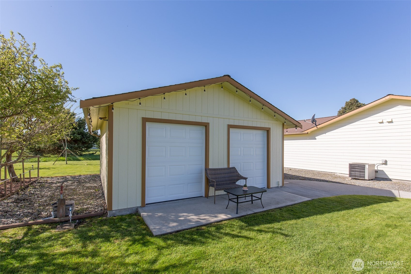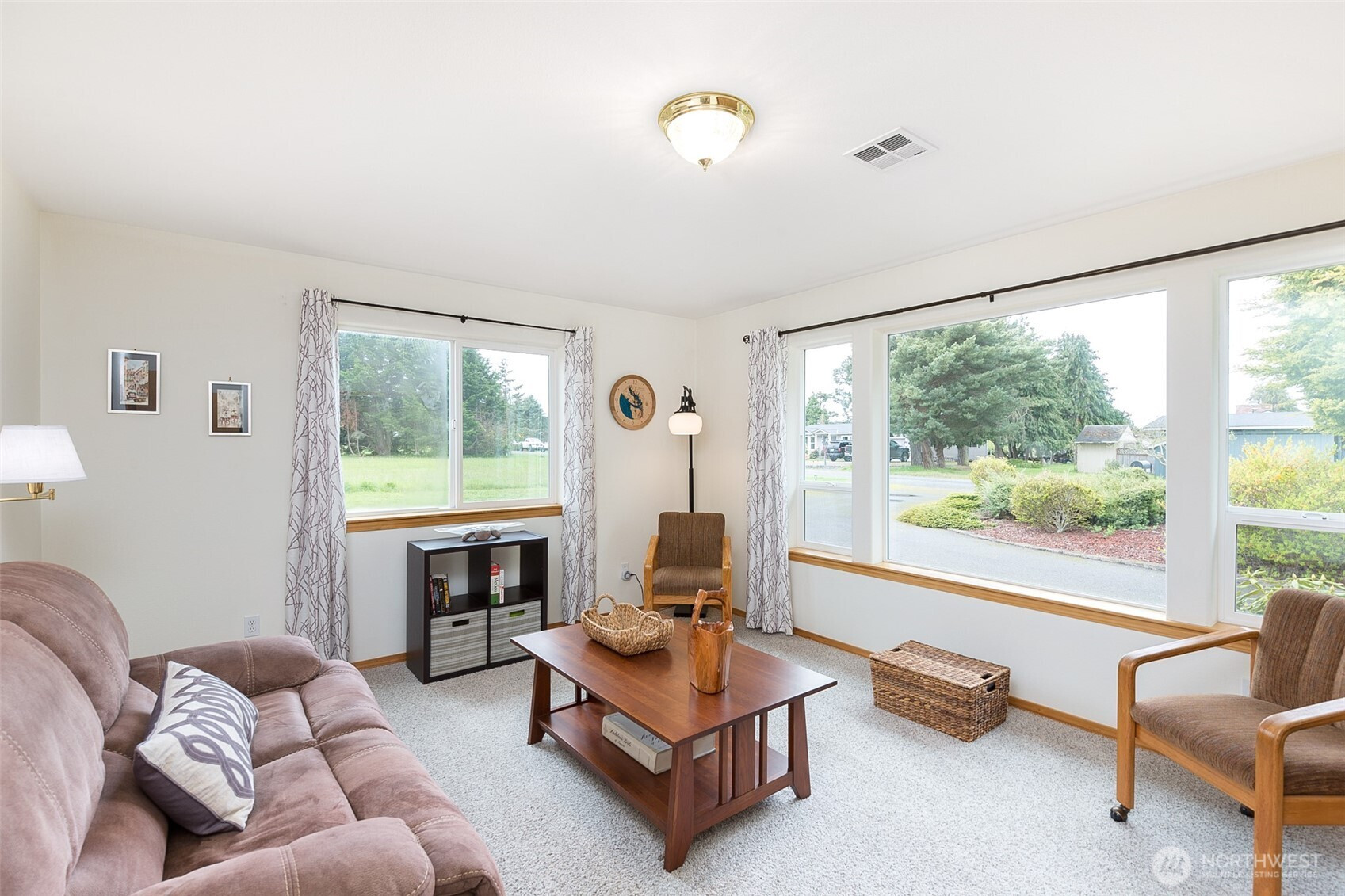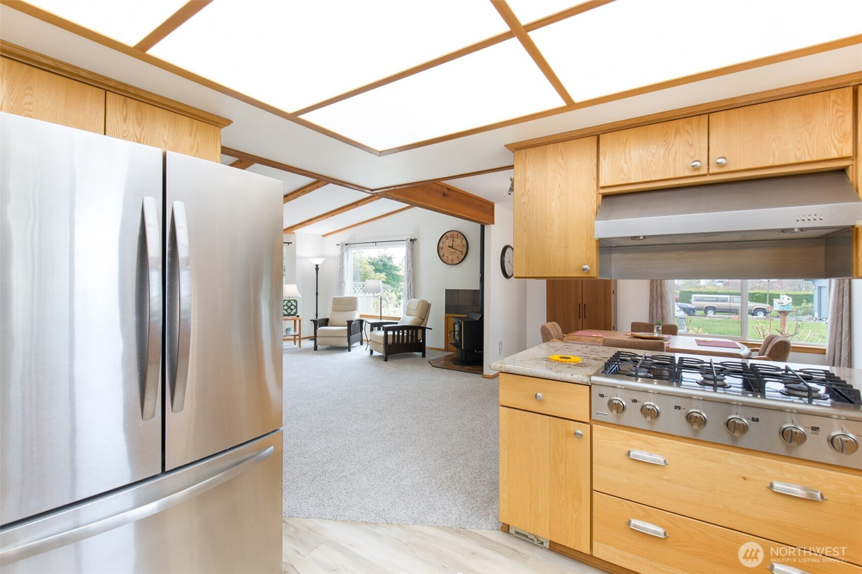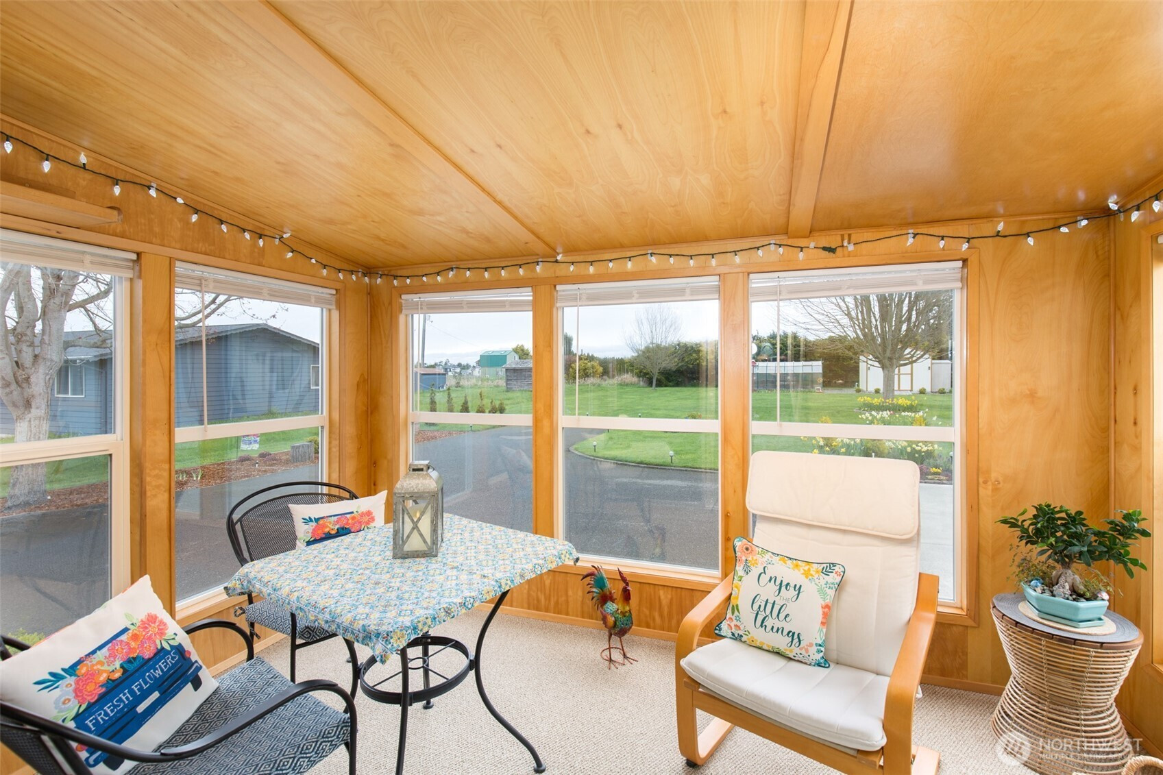 Mountain View retreat on .67 acres of beautifully manicured grounds, gardens, and orchard! This spacious 2,175 sq ft home offers 3 bedrooms and 2.5 baths with vaulted ceilings and striking cedar beams, creating a warm yet open feel. Enjoy year-round natural light in the attached sunroom just off the dining area. The kitchen features granite countertops, propane cooktop, double ovens, stainless steel appliances, and updated lighting—ideal for both everyday living and entertaining. Additional highlights include a woodstove, heat pump, central vacuum, wide hallways, and three solar tubes. Over 250 outlets and upgraded LED lighting add convenience and functionality. A standout feature is the extensive shop and garage space totaling 1,788 sq ft—including an attached oversized 2-car garage with office/studio, a second garage with its own electrical panel, a third outbuilding perfect for hobbies, plus an additional equipment shed and greenhouse. The property is supported by Cline Irrigation and includes fruit trees, berries, a variety of flowers, shrubs, and outdoor lighting throughout. Community beach access. A rare combination of space, utility, and scenic beauty—perfect for hobbyists, gardeners, or those seeking a peaceful lifestyle with room to grow.