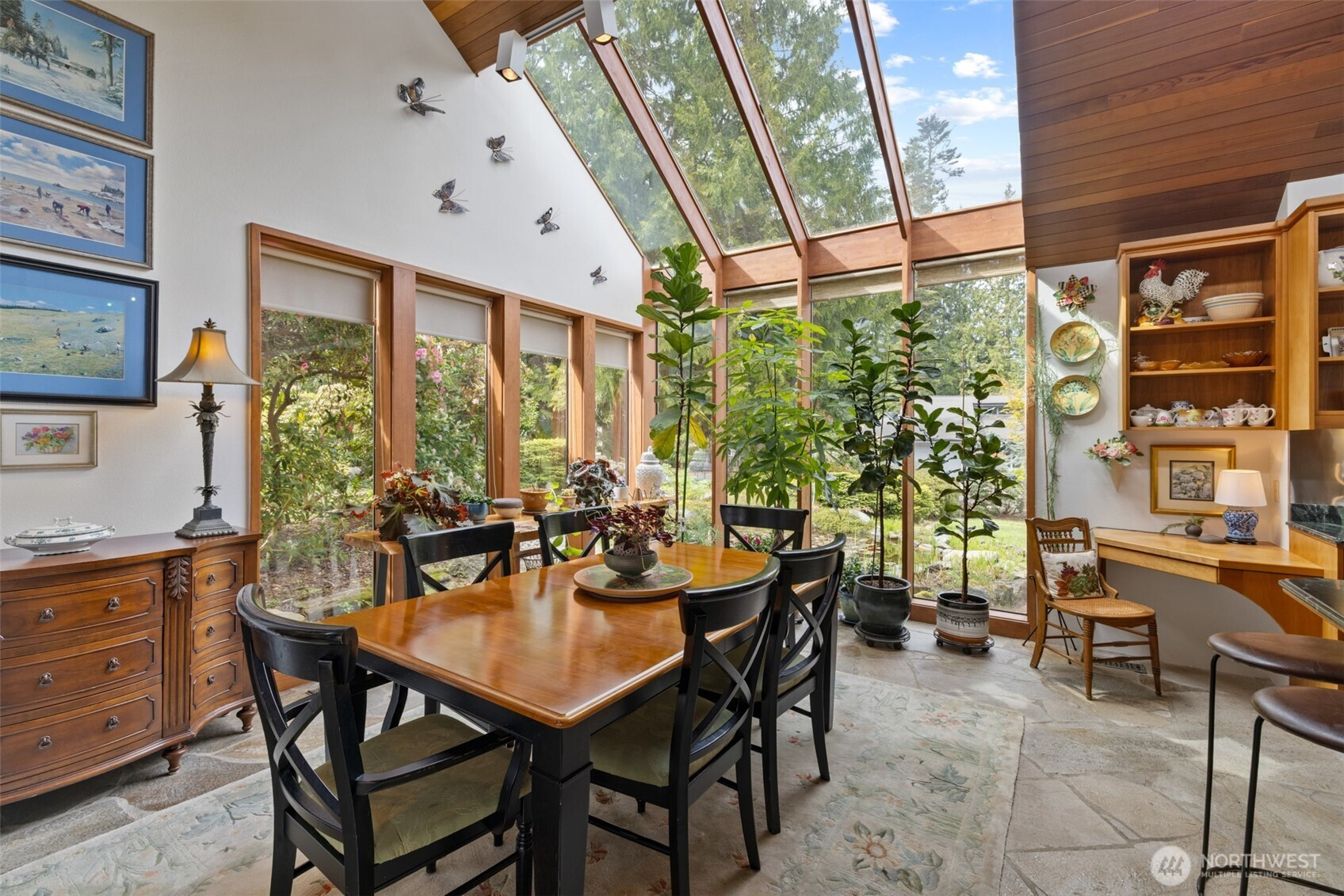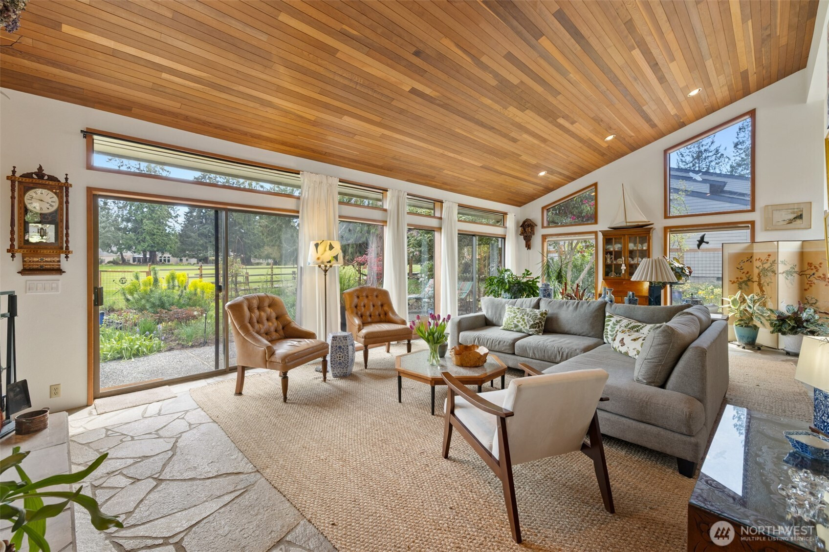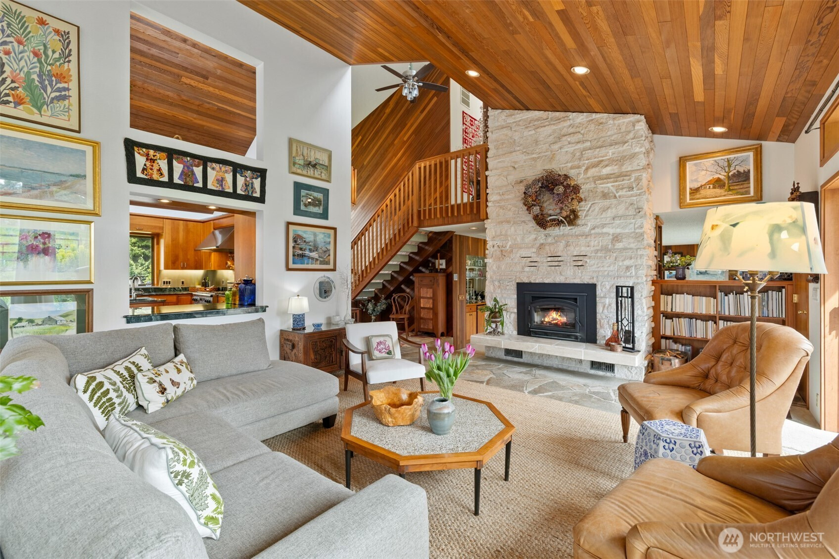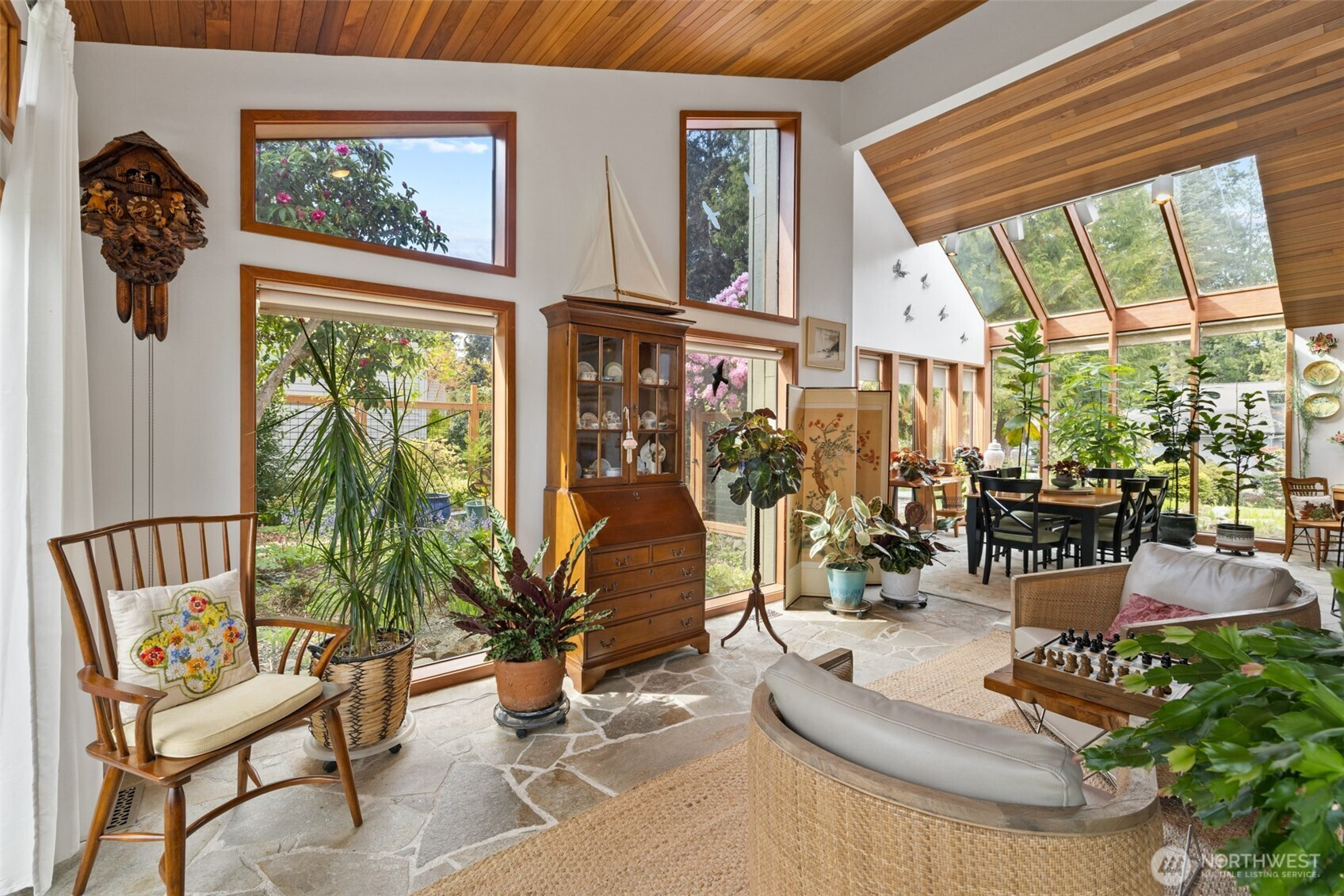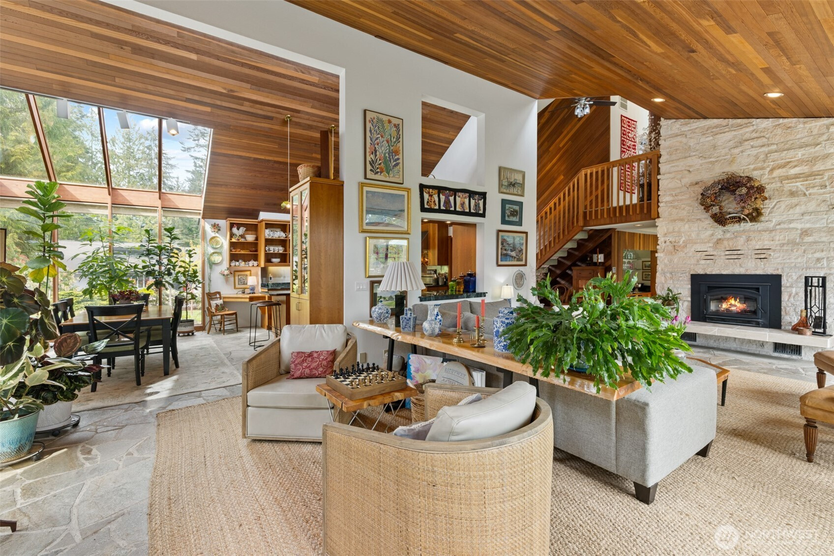 This is a home you feel the moment you enter, architecturally expressive, warm, and rich with character that’s nearly impossible to replicate. Soaring vaulted ceilings lined with tongue and groove cedar, sculptural quartz wood-burning fireplace, slate floors, and walls of windows create a striking interplay of natural light and organic textures, while the extraordinary handcrafted millwork carries a cohesive, timeless design throughout. The kitchen is a true centerpiece, thoughtfully designed with custom cherry cabinetry, dramatic jade marble countertops and island, double sinks, double ovens, high-end appliances including a gas range, on-demand hot water tap & stainless steel backsplash. Just off the kitchen, a bright solarium offers the perfect setting for viewing beautifully landscaped grounds with a tranquil pond and water feature. The home’s vintage character is honored with intention in the cozy sunken living room, stunning wood paneling, wet bar, and a double-sided fireplace. A private office or main-floor bedroom adds flexibility, while all south-facing living spaces provide seamless access to the expansive patio and lush gardens, ideally positioned along the last—and widest—fairway of the Sunland golf course. Upstairs, two primary suites each offer spacious, renovated bathrooms and private balconies. Fully fenced back/side yard, even along the golf course, the property strikes a rare balance of privacy and openness, creating a one of a kind memorable home.