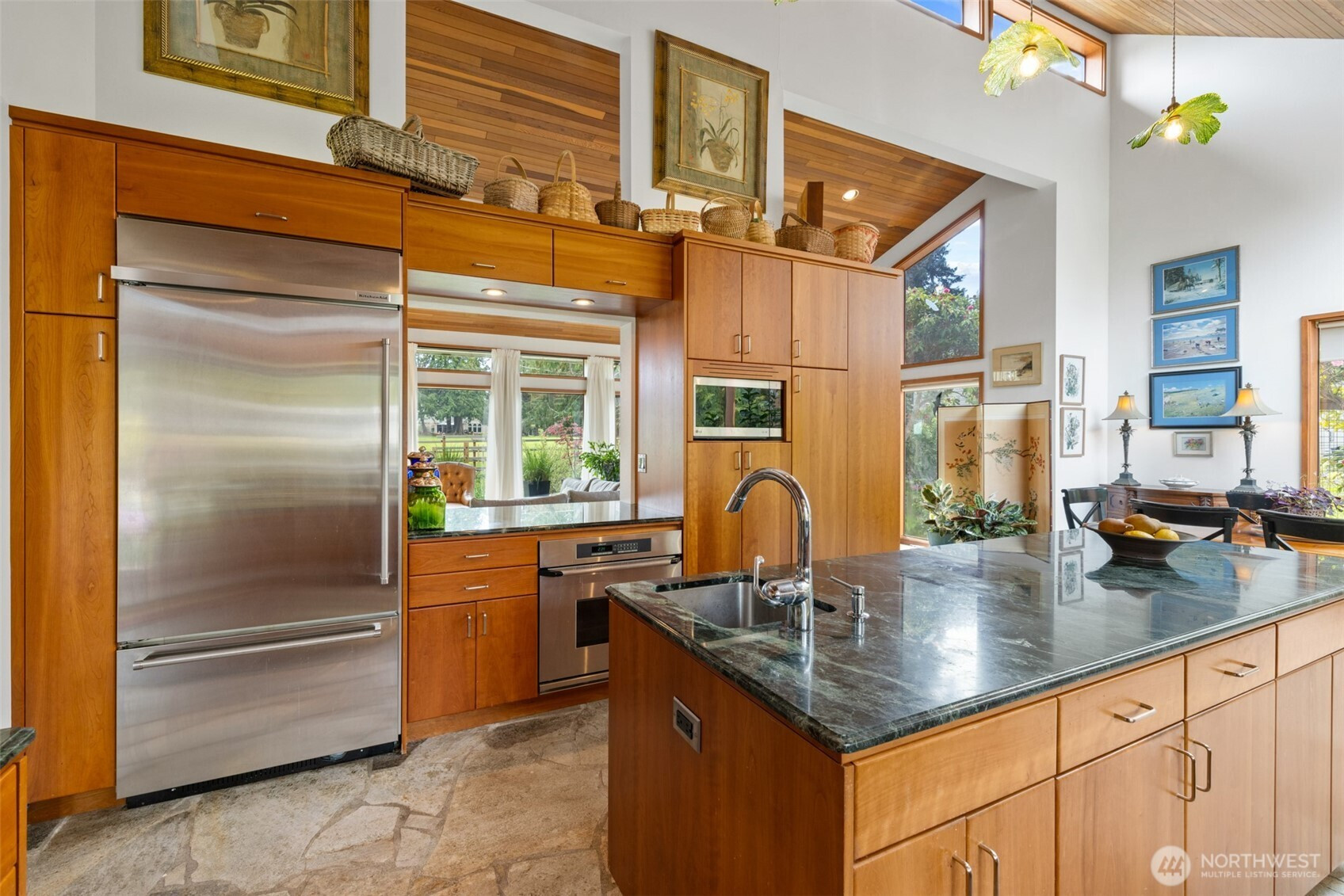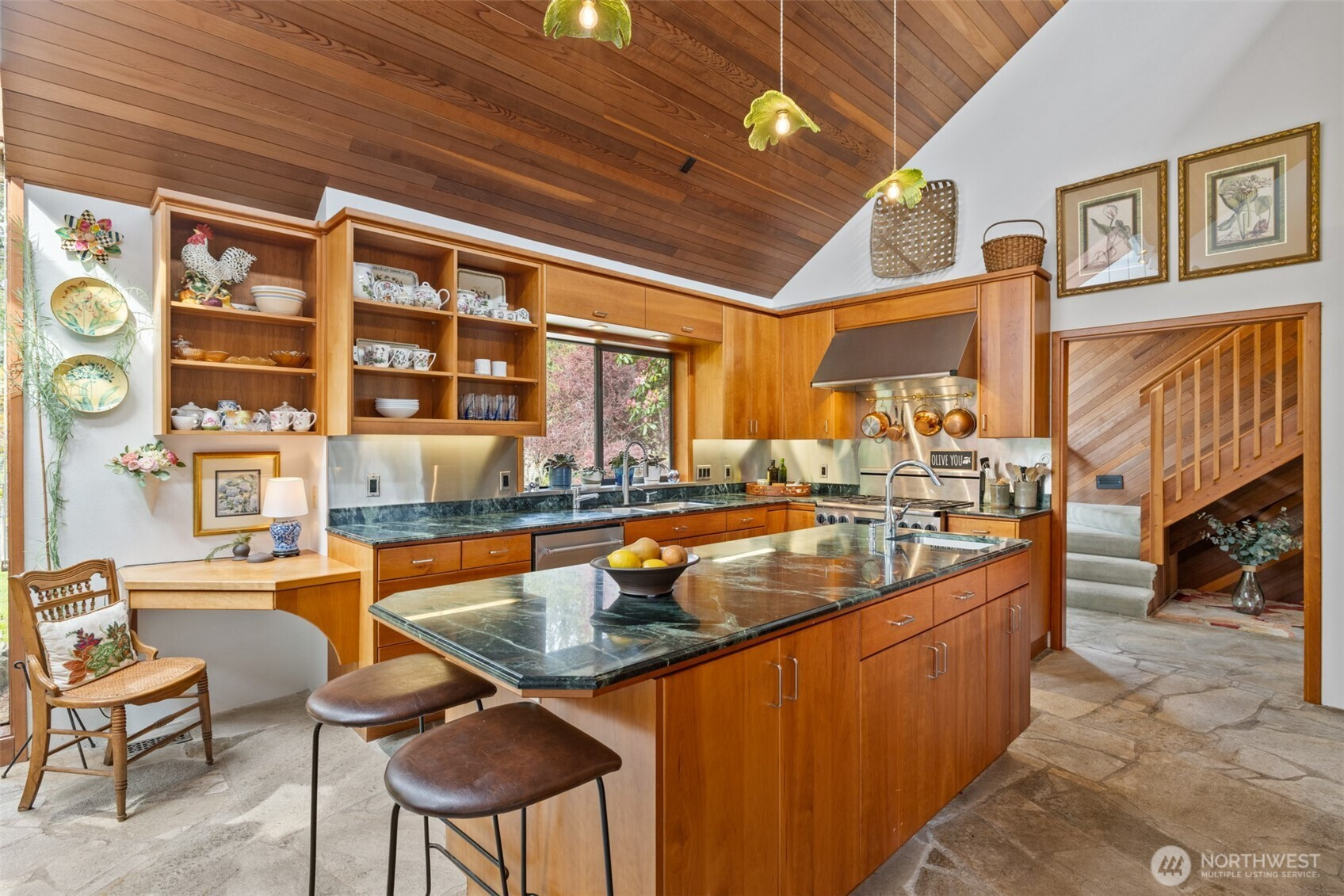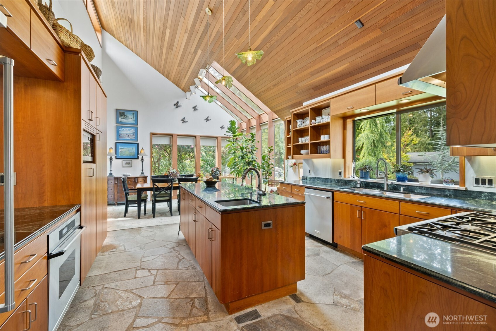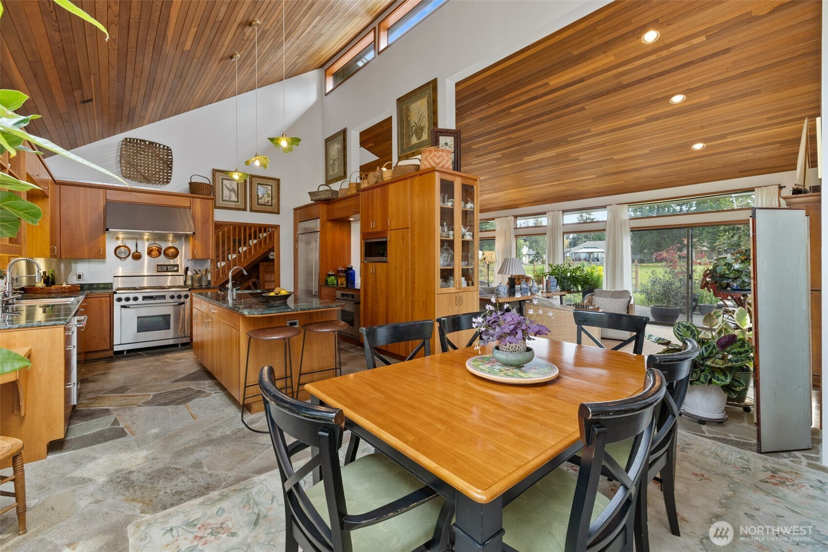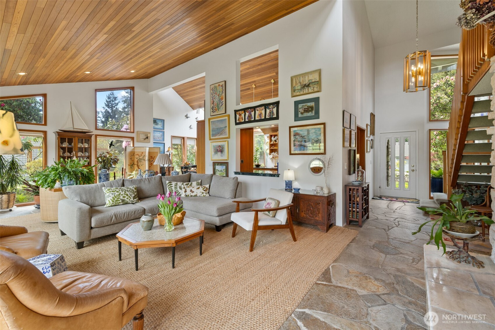 This is a home you feel the moment you enter, architecturally expressive, warm, and rich with character that’s nearly impossible to replicate. Soaring vaulted ceilings lined with tongue and groove cedar, sculptural quartz wood-burning fireplace, slate floors, and walls of windows create a striking interplay of natural light and organic textures, while the extraordinary handcrafted millwork carries a cohesive, timeless design throughout. The kitchen is a true centerpiece, thoughtfully designed with custom cherry cabinetry, dramatic jade marble countertops and island, double sinks, double ovens, high-end appliances including a gas range, on-demand hot water tap & stainless steel backsplash. Just off the kitchen, a bright solarium offers the perfect setting for viewing beautifully landscaped grounds with a tranquil pond and water feature. The home’s vintage character is honored with intention in the cozy sunken living room, stunning wood paneling, wet bar, and a double-sided fireplace. A private office or main-floor bedroom adds flexibility, while all south-facing living spaces provide seamless access to the expansive patio and lush gardens, ideally positioned along the last—and widest—fairway of the Sunland golf course. Upstairs, two primary suites each offer spacious, renovated bathrooms and private balconies. Fully fenced back/side yard, even along the golf course, the property strikes a rare balance of privacy and openness, creating a one of a kind memorable home.