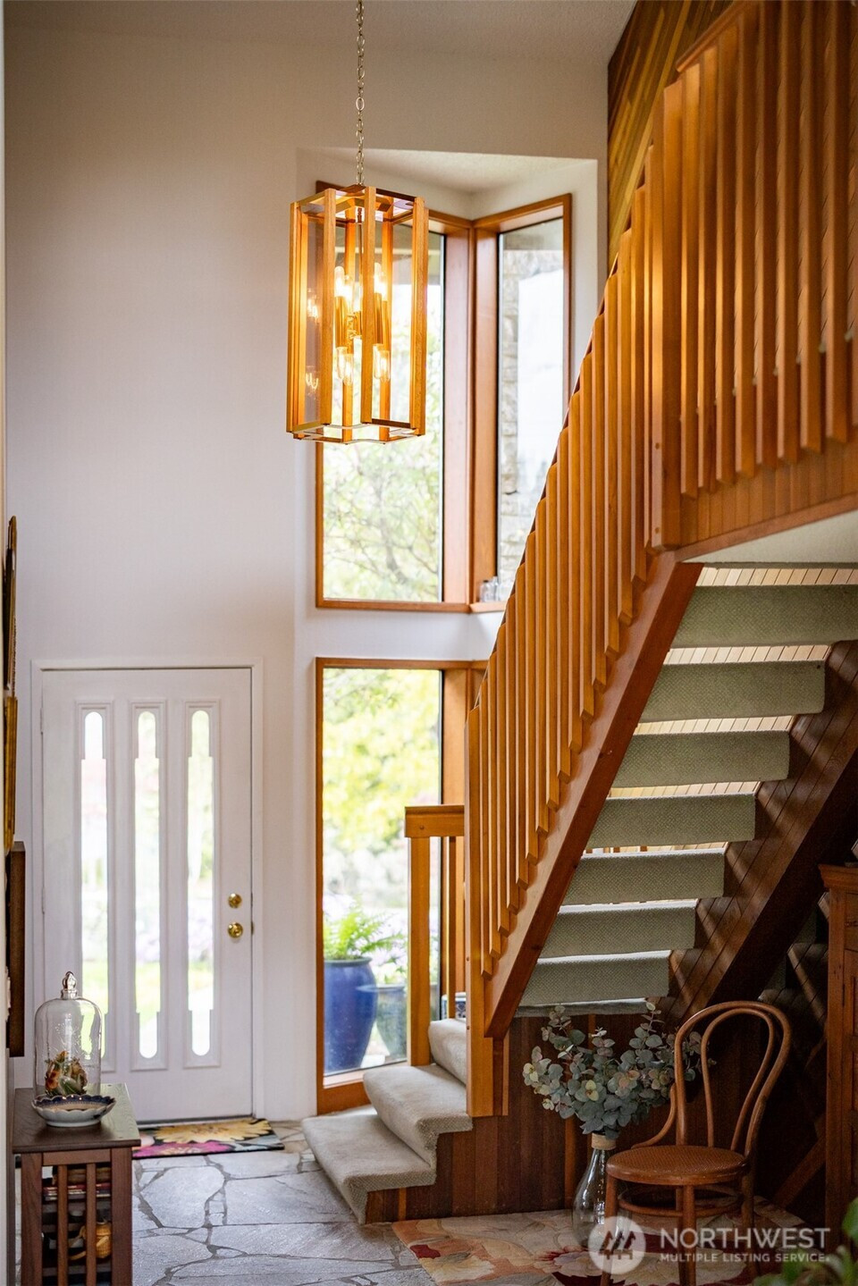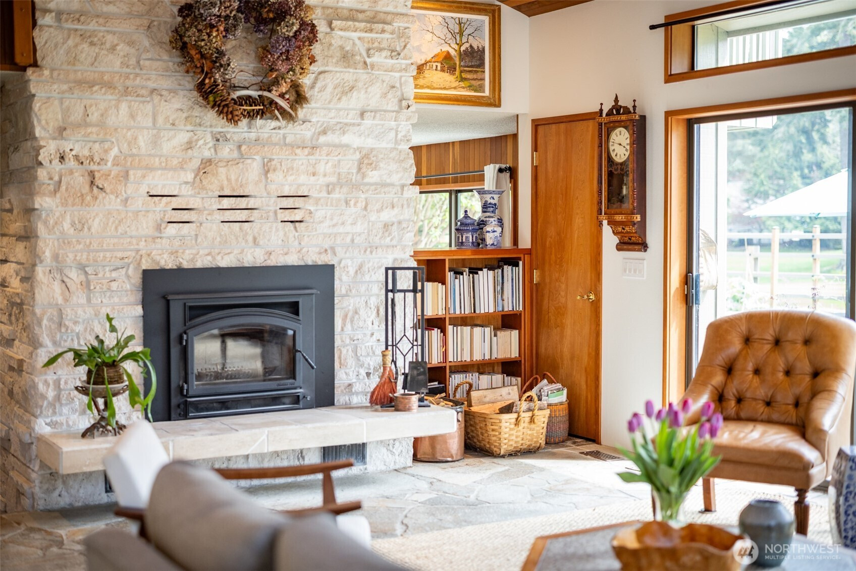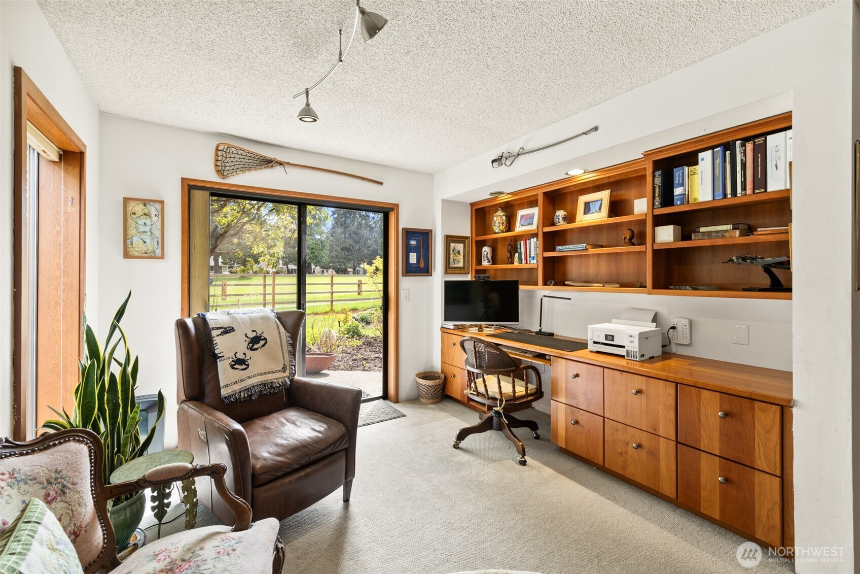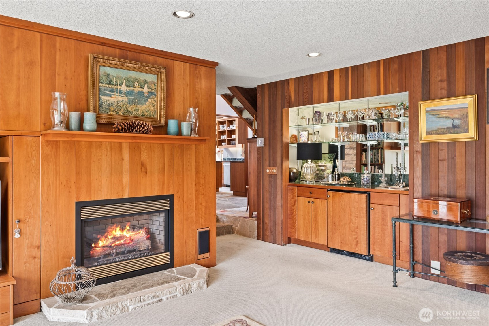 This is a home you feel the moment you enter, architecturally expressive, warm, and rich with character that’s nearly impossible to replicate. Soaring vaulted ceilings lined with tongue and groove cedar, sculptural quartz wood-burning fireplace, slate floors, and walls of windows create a striking interplay of natural light and organic textures, while the extraordinary handcrafted millwork carries a cohesive, timeless design throughout. The kitchen is a true centerpiece, thoughtfully designed with custom cherry cabinetry, dramatic jade marble countertops and island, double sinks, double ovens, high-end appliances including a gas range, on-demand hot water tap & stainless steel backsplash. Just off the kitchen, a bright solarium offers the perfect setting for viewing beautifully landscaped grounds with a tranquil pond and water feature. The home’s vintage character is honored with intention in the cozy sunken living room, stunning wood paneling, wet bar, and a double-sided fireplace. A private office or main-floor bedroom adds flexibility, while all south-facing living spaces provide seamless access to the expansive patio and lush gardens, ideally positioned along the last—and widest—fairway of the Sunland golf course. Upstairs, two primary suites each offer spacious, renovated bathrooms and private balconies. Fully fenced back/side yard, even along the golf course, the property strikes a rare balance of privacy and openness, creating a one of a kind memorable home.