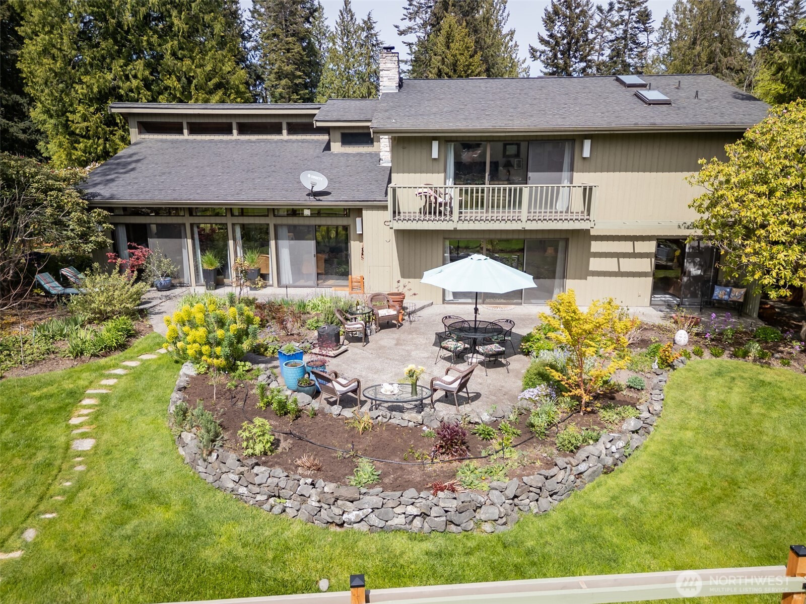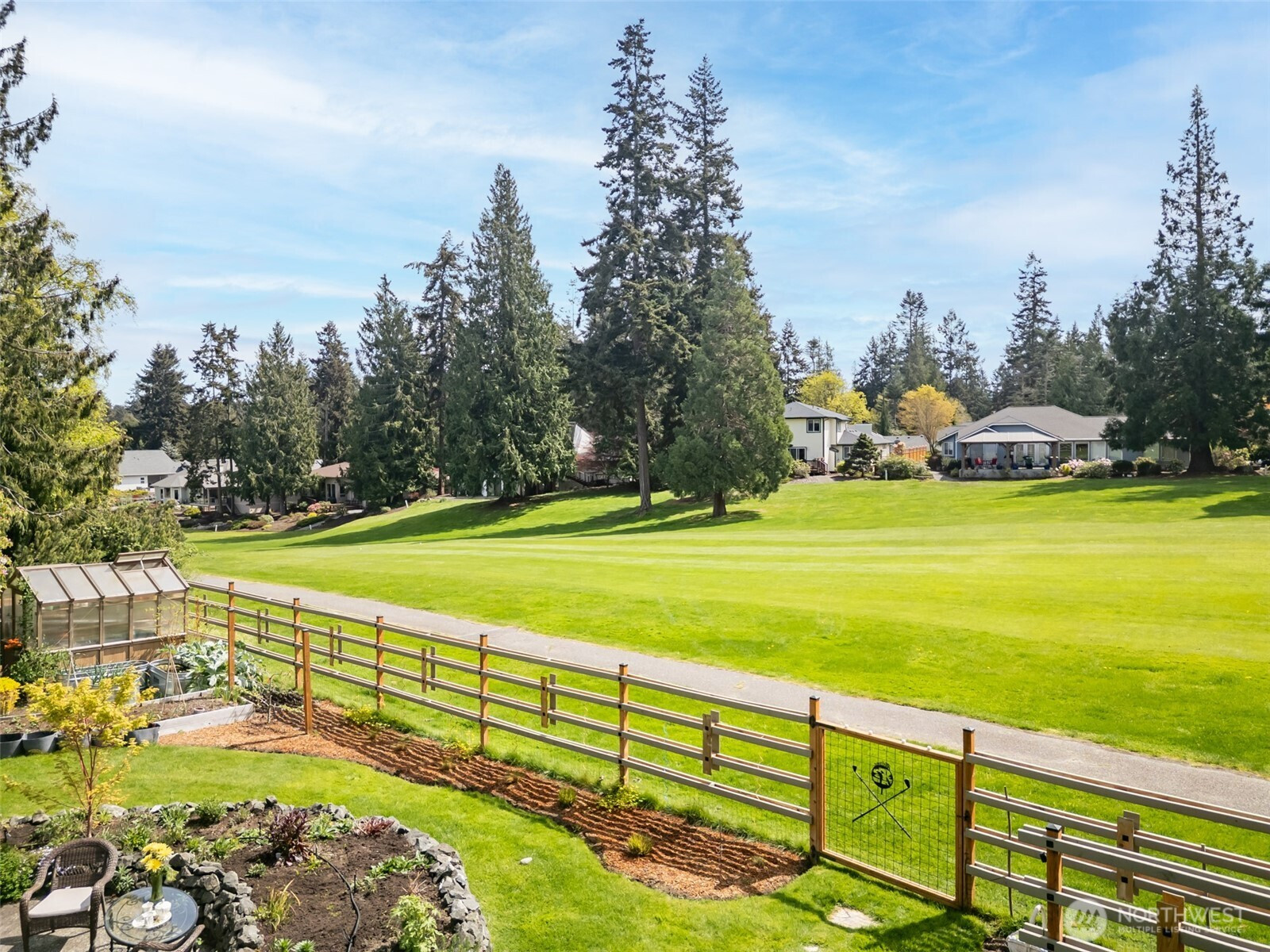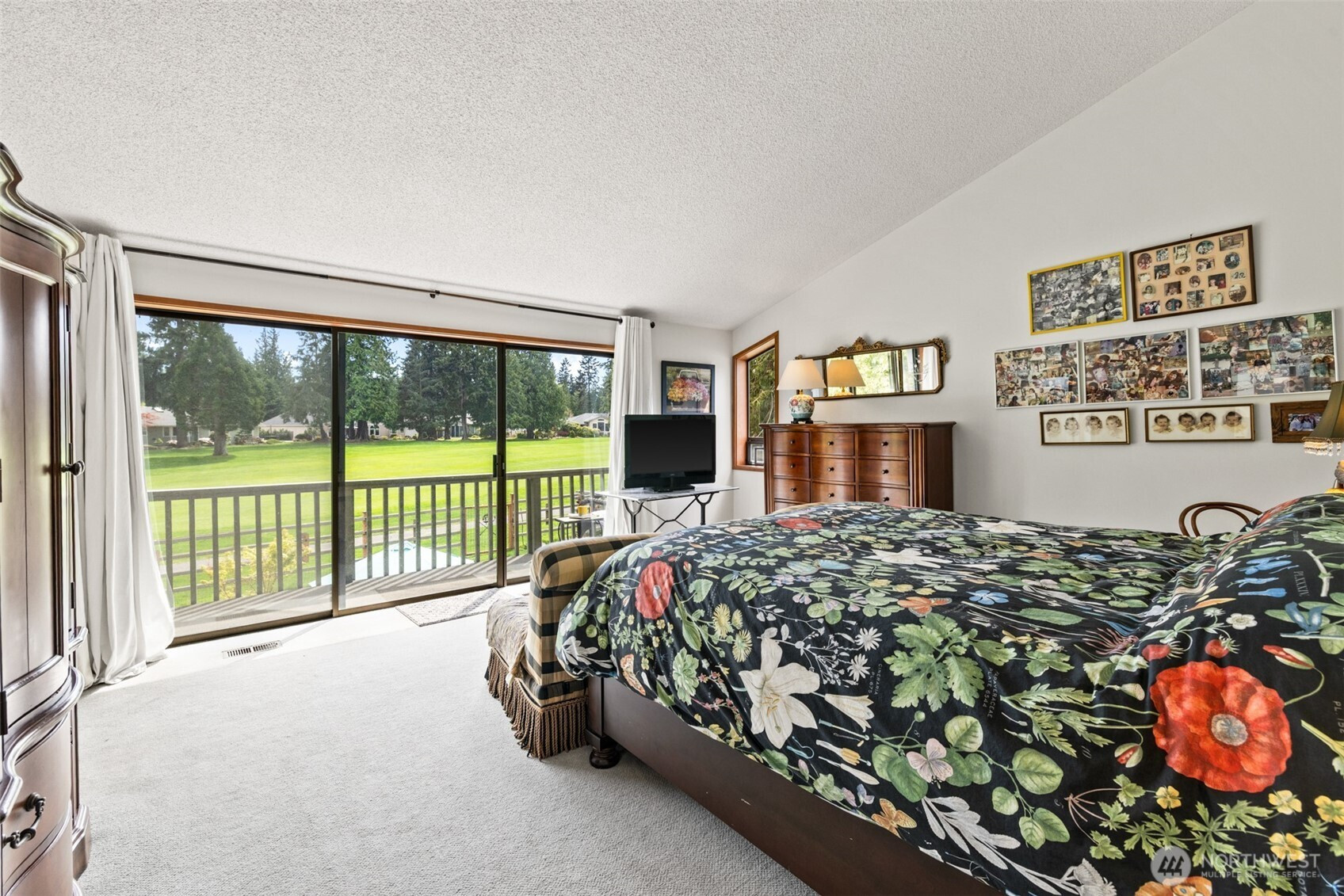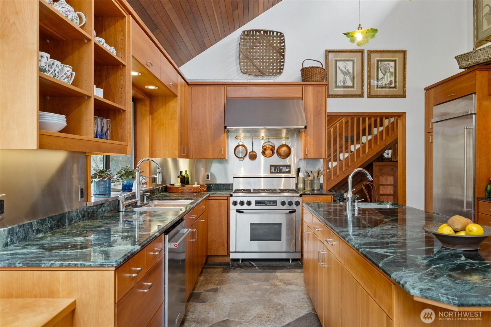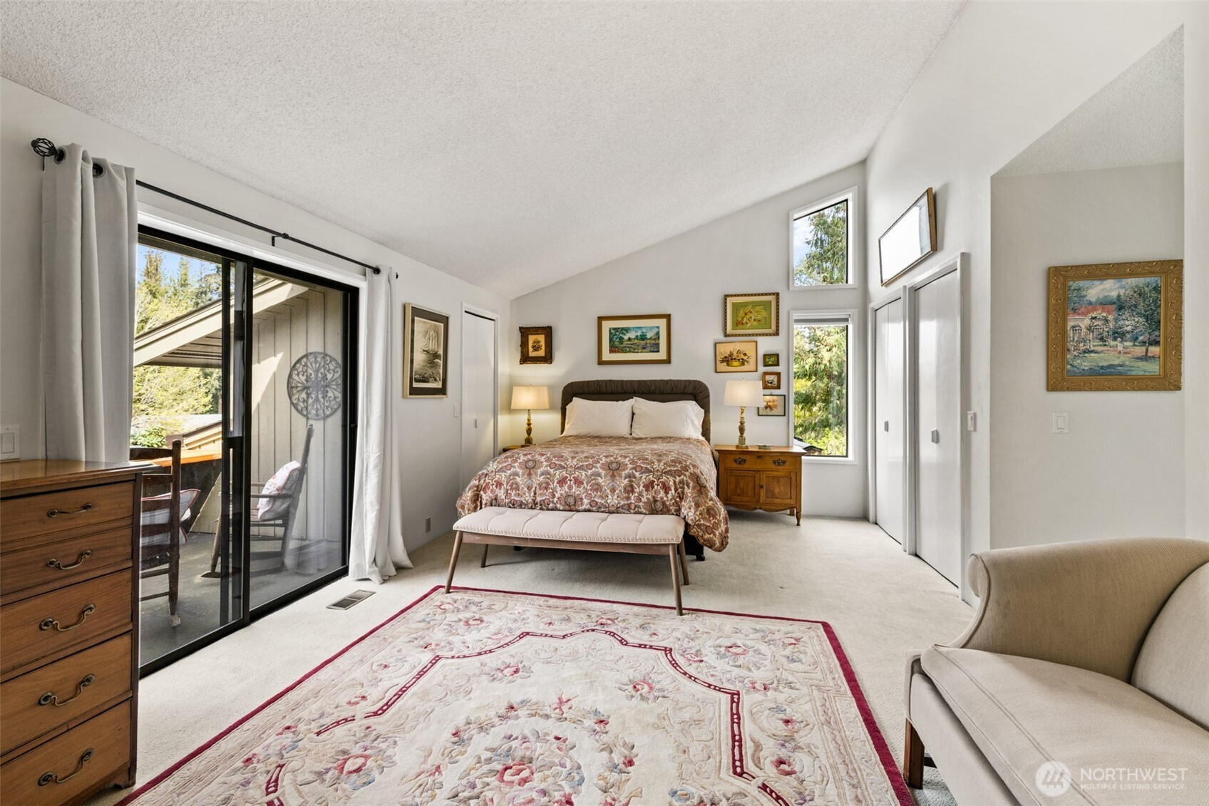This is a home you feel the moment you enter, architecturally expressive, warm, and rich with character that’s nearly impossible to replicate. Soaring vaulted ceilings lined with tongue and groove cedar, sculptural quartz wood-burning fireplace, slate floors, and walls of windows create a striking interplay of natural light and organic textures, while the extraordinary handcrafted millwork carries a cohesive, timeless design throughout. The kitchen is a true centerpiece, thoughtfully designed with custom cherry cabinetry, dramatic jade marble countertops and island, double sinks, double ovens, high-end appliances including a gas range, on-demand hot water tap & stainless steel backsplash. Just off the kitchen, a bright solarium offers the perfect setting for viewing beautifully landscaped grounds with a tranquil pond and water feature. The home’s vintage character is honored with intention in the cozy sunken living room, stunning wood paneling, wet bar, and a double-sided fireplace. A private office or main-floor bedroom adds flexibility, while all south-facing living spaces provide seamless access to the expansive patio and lush gardens, ideally positioned along the last—and widest—fairway of the Sunland golf course. Upstairs, two primary suites each offer spacious, renovated bathrooms and private balconies. Fully fenced back/side yard, even along the golf course, the property strikes a rare balance of privacy and openness, creating a one of a kind memorable home.