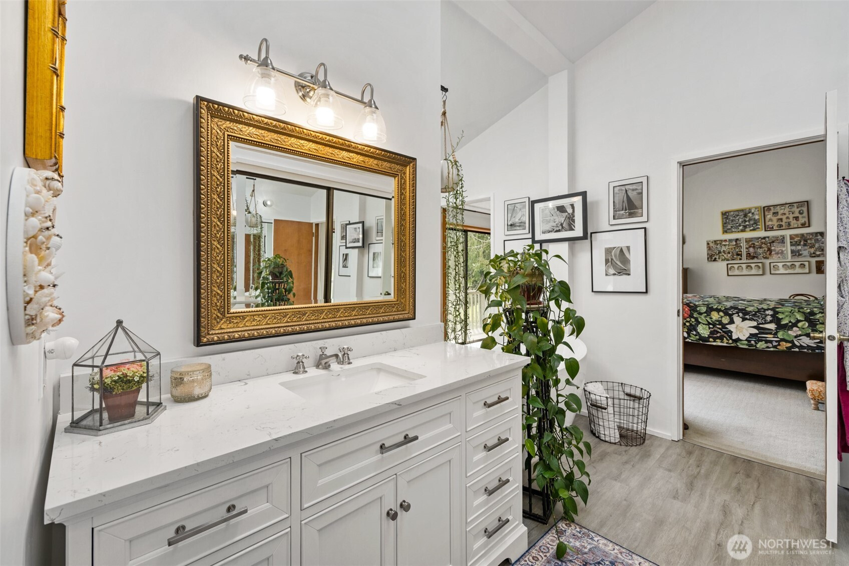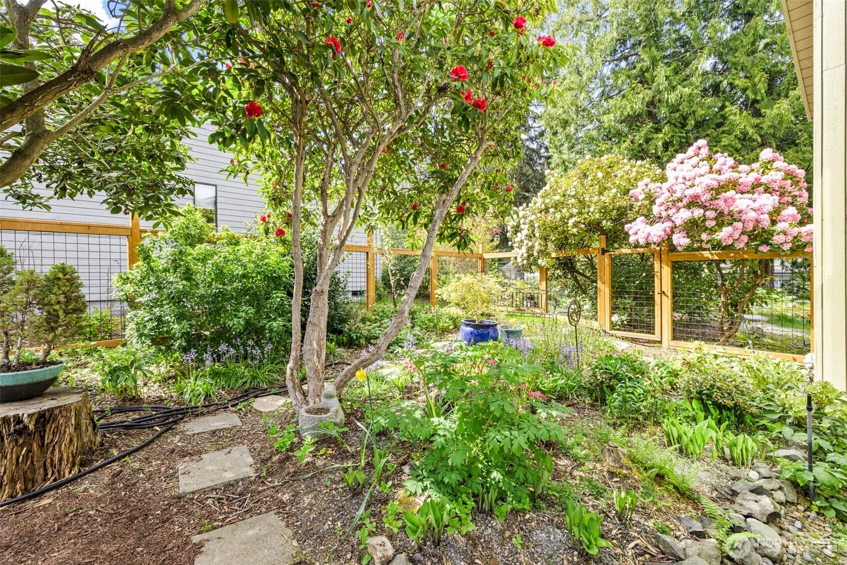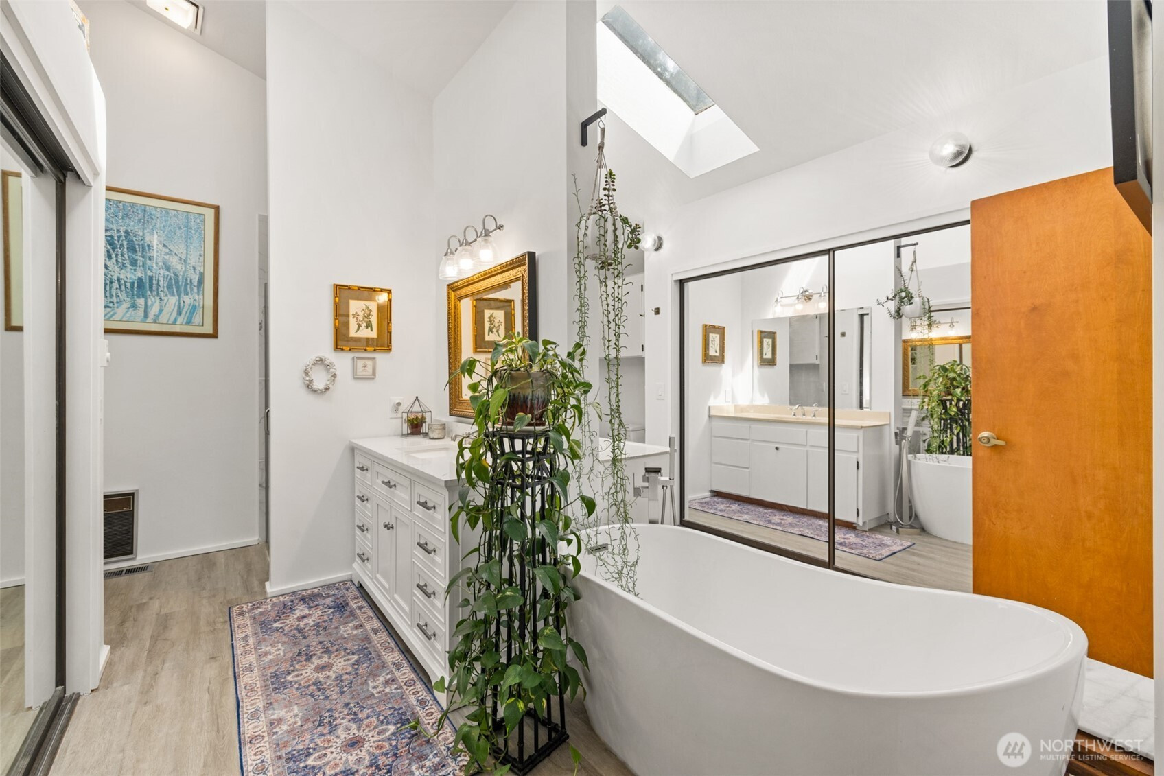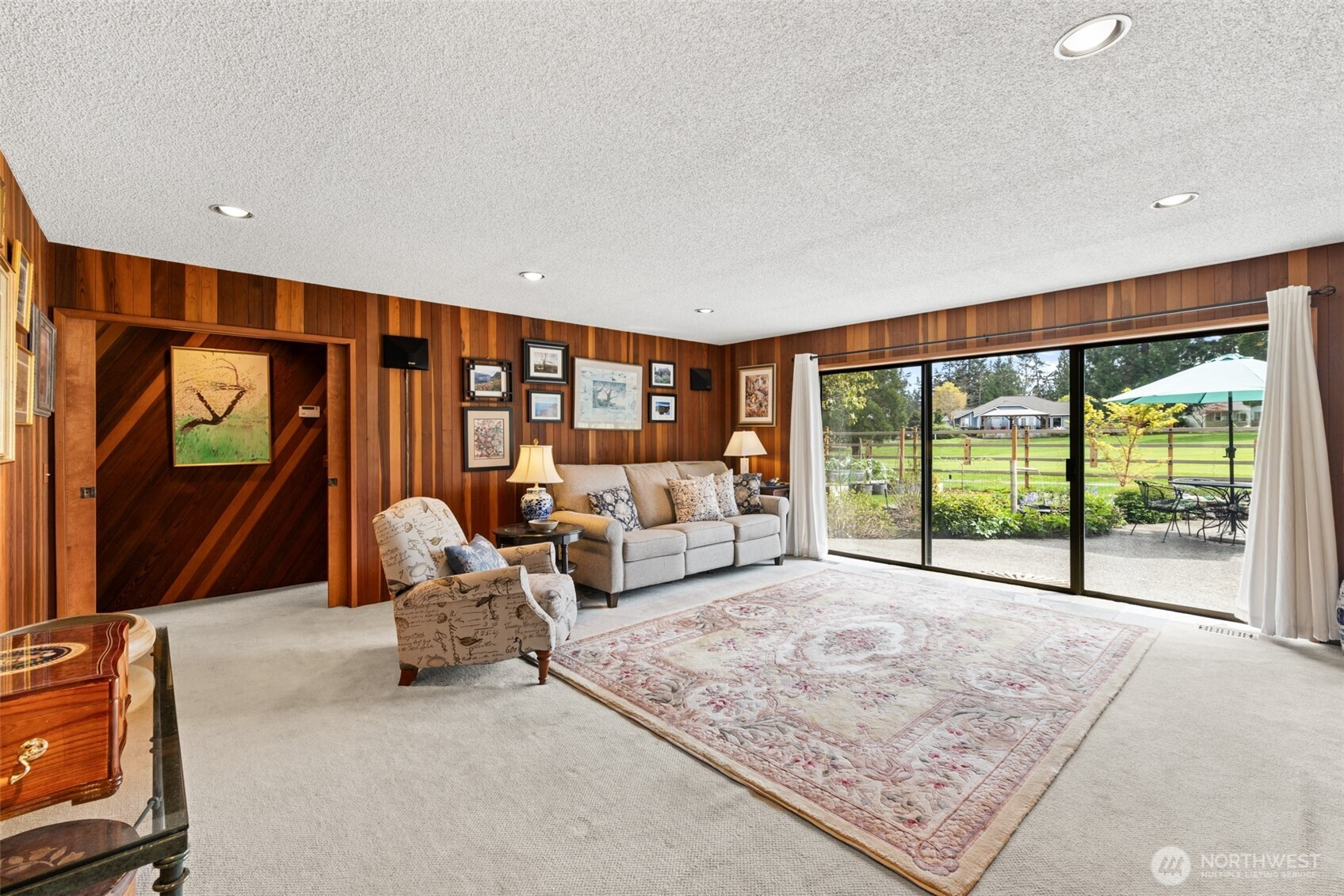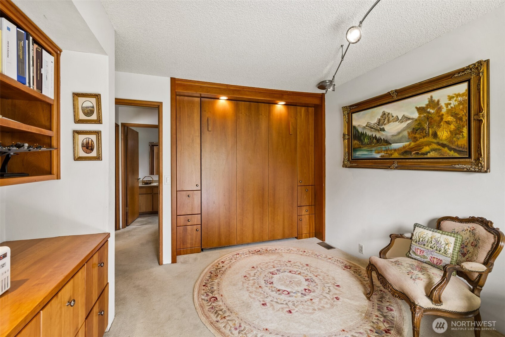 This is a home you feel the moment you enter, architecturally expressive, warm, and rich with character that’s nearly impossible to replicate. Soaring vaulted ceilings lined with tongue and groove cedar, sculptural quartz wood-burning fireplace, slate floors, and walls of windows create a striking interplay of natural light and organic textures, while the extraordinary handcrafted millwork carries a cohesive, timeless design throughout. The kitchen is a true centerpiece, thoughtfully designed with custom cherry cabinetry, dramatic jade marble countertops and island, double sinks, double ovens, high-end appliances including a gas range, on-demand hot water tap & stainless steel backsplash. Just off the kitchen, a bright solarium offers the perfect setting for viewing beautifully landscaped grounds with a tranquil pond and water feature. The home’s vintage character is honored with intention in the cozy sunken living room, stunning wood paneling, wet bar, and a double-sided fireplace. A private office or main-floor bedroom adds flexibility, while all south-facing living spaces provide seamless access to the expansive patio and lush gardens, ideally positioned along the last—and widest—fairway of the Sunland golf course. Upstairs, two primary suites each offer spacious, renovated bathrooms and private balconies. Fully fenced back/side yard, even along the golf course, the property strikes a rare balance of privacy and openness, creating a one of a kind memorable home.
