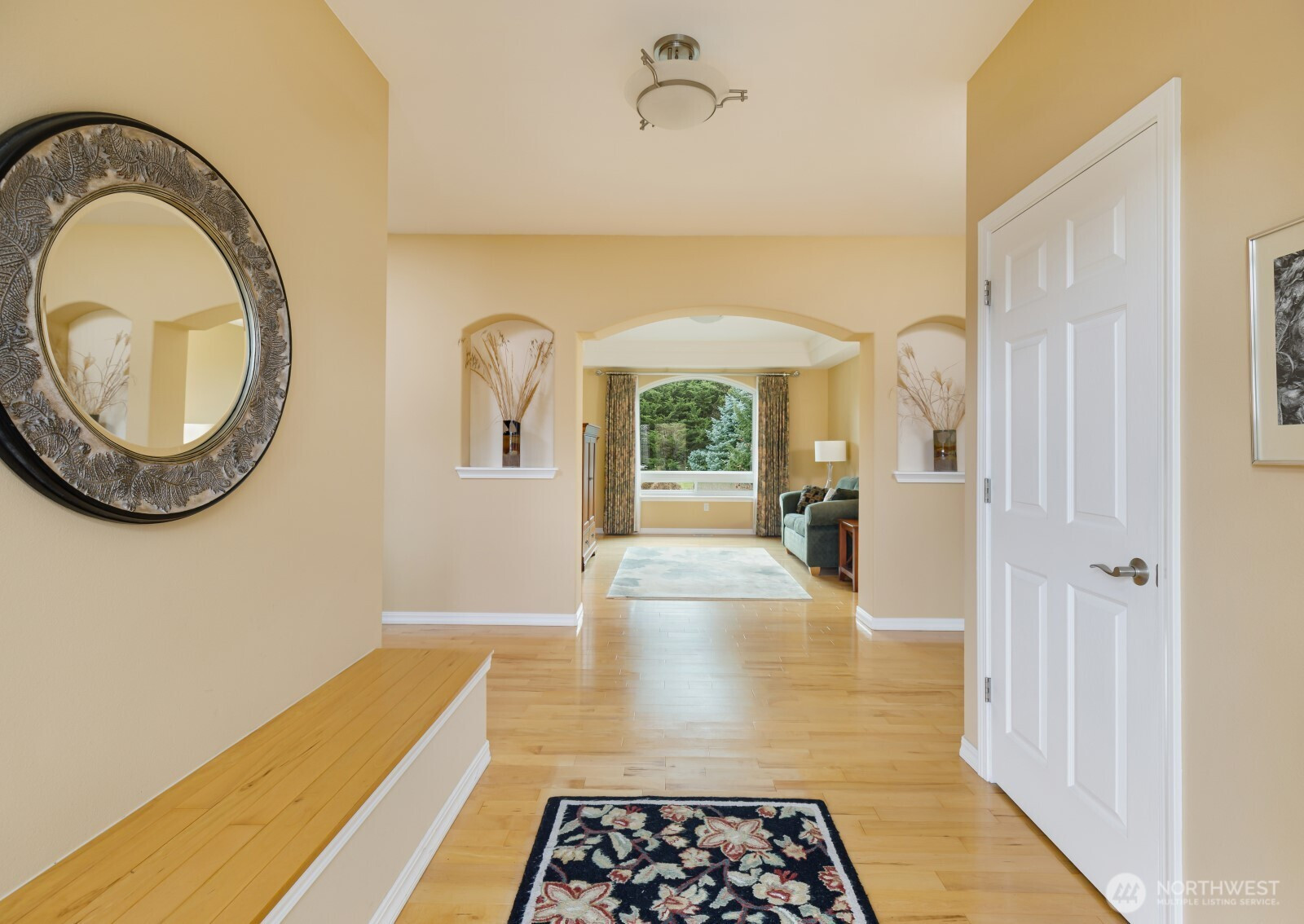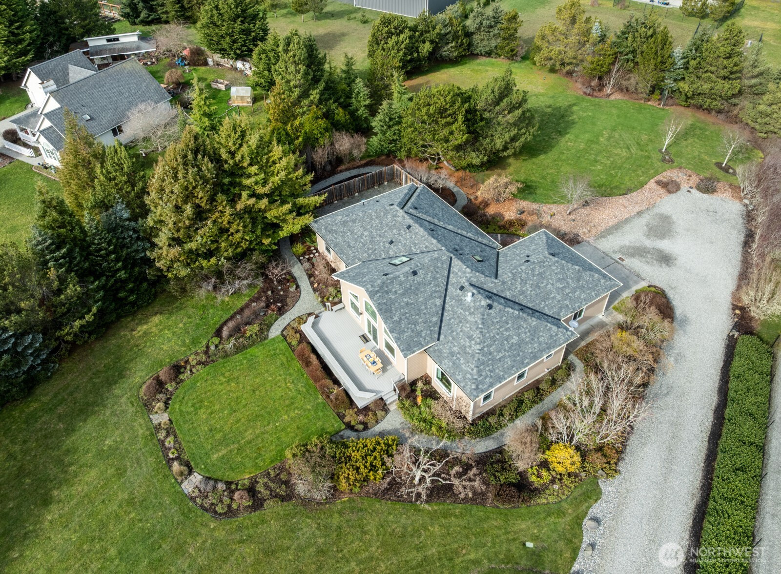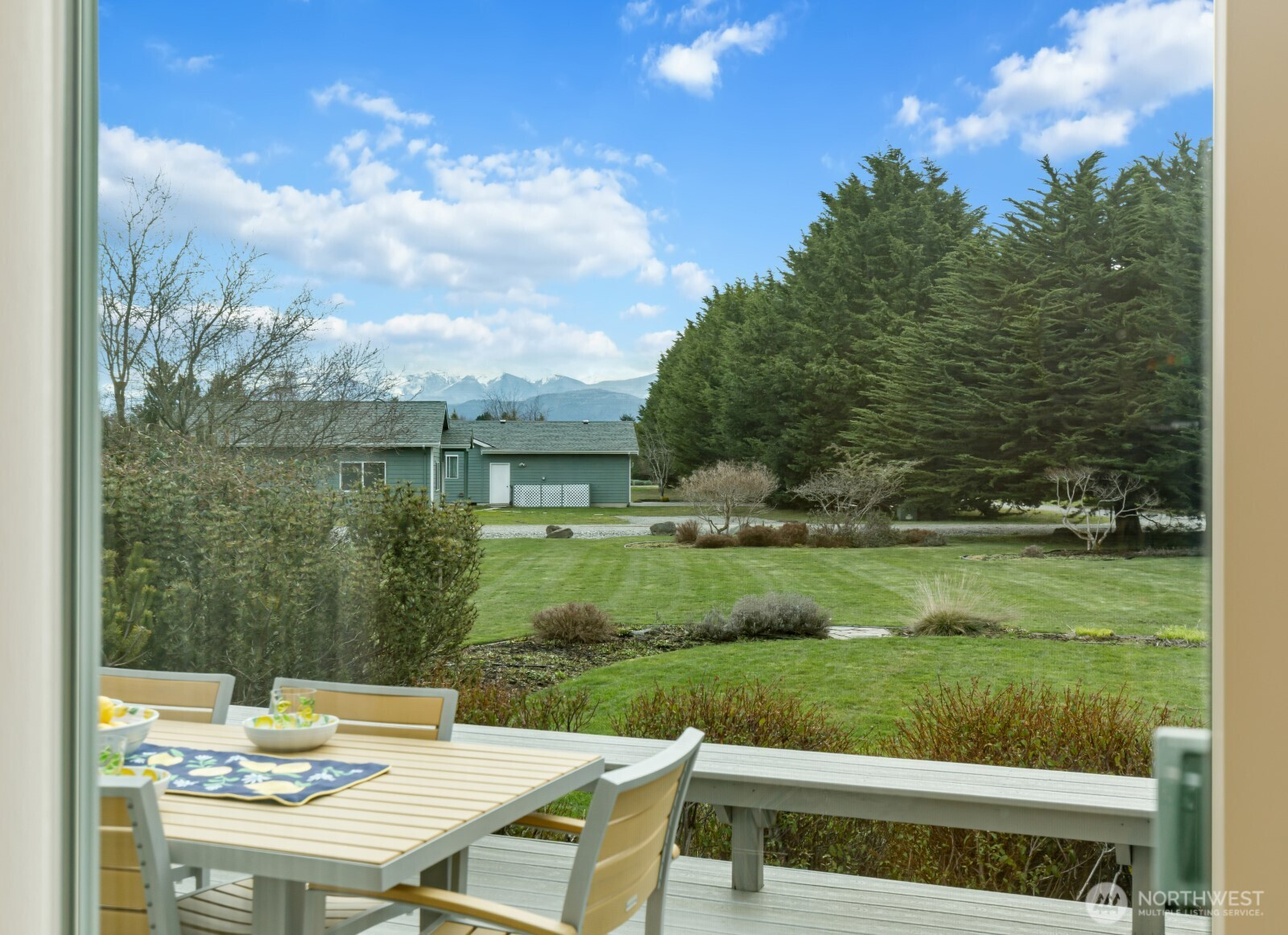 Bask in the southern exposure while soaking up the breath-taking views of the Olympic Mountains. This home is situated on a beautifully landscaped 1.37 acres located in Sequim’s desirable Blue Ribbon community. This 2,362 sqft single-level home offers 3 beds, 2 baths, & a thoughtful open layout with vaulted ceilings, hardwood floors, & expansive windows framing the mountain views. Spacious kitchen features granite countertops, stainless appliances, abundant designer cabinetry, & large peninsula that flows seamlessly into the dining area and great room with gas fireplace—perfect for entertaining or simply relaxing. The primary suite offers natural lighting, personal mountain views, custom window coverings & a large walk-in closet. Primary bath complete with soaking/jetted tub, shower, & dual vanity. Step outside to a generous Trex-style deck with seating that overlooks beautifully landscaped grounds with irrigation, sprinkler system, and lush established greenery and several mature trees. The level lot offers a fenced dog run, along with privacy at the end of a street with a long, private drive. Additional highlights include central A/C, heat pump, forced air heating, attached 2-car garage, septic system, new roof, all new Anderson dual pane windows and newly painted exterior. Located in the Sequim School District and part of an airfield community, this property blends peaceful country living with convenience to town, outdoor recreation, and the Olympic Peninsula lifestyle.