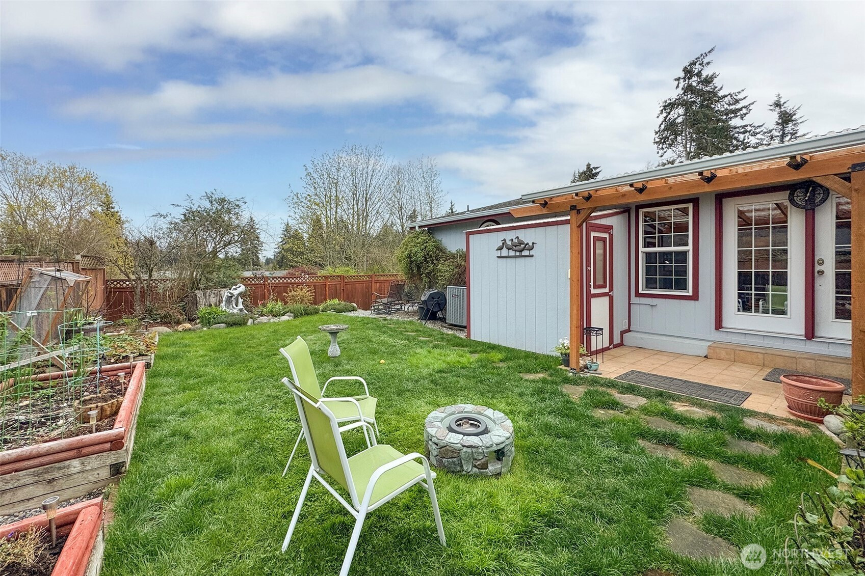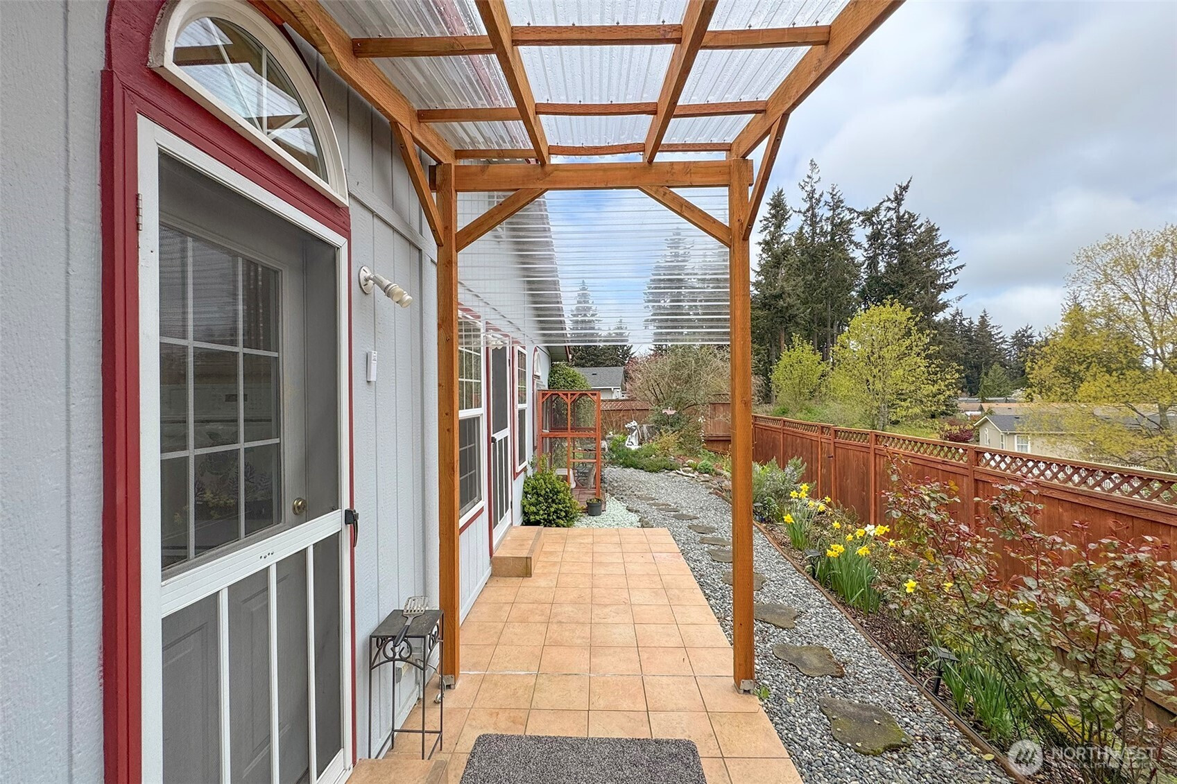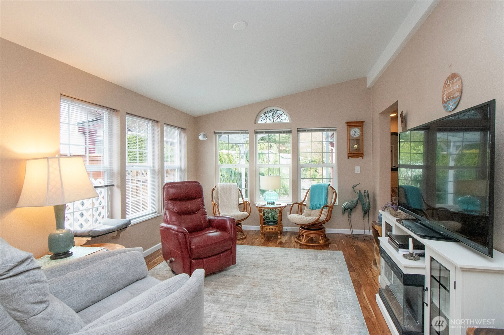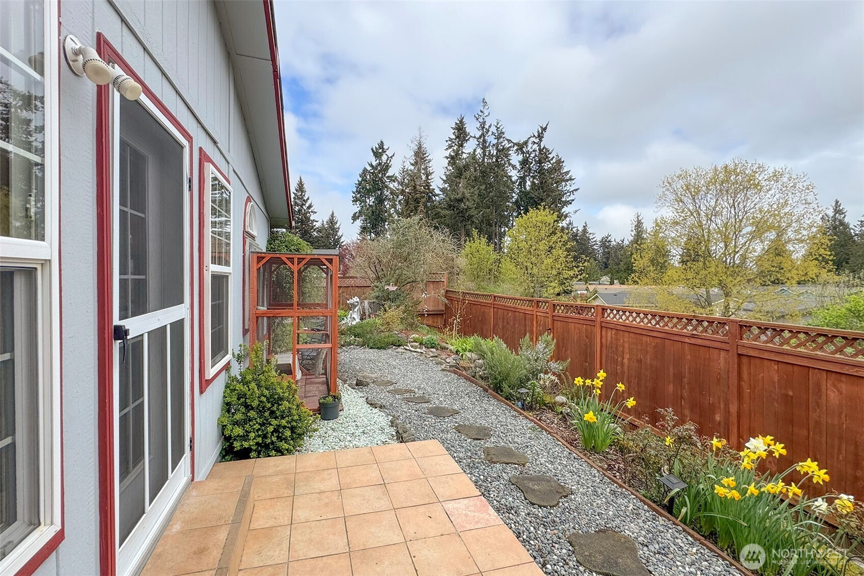 Newly updated, well maintained, and spacious triple-wide home, perfectly located in the quiet back corner of beautiful Parkwood. Light and bright home with an exceptional floor-plan, two large open living areas, updated kitchen with quartz countertops and skylight, primary suite has a walk-in closet, walk-in tiled shower, double sinks, and a jetted soaking tub. All new Acacia flooring throughout, new kitchen appliances, a new under-counter sink and faucet with instant hot water, new guest bathroom fixtures and tile, all new exterior covered porch/patio areas, new back and south side fencing, as well as mature landscaping with fig and pear trees, strawberries and blueberries. The large two car garage has an additional heated/finished shop area with workbench perfect for crafts and hobbies. The back yard with raised beds, flower garden and greenhouse/garden shed has a very private feel. The landscaping with drip irrigation, two covered and tiled outdoor living/patio areas, lush lawn and the homes location in the park add to the feeling of privacy. Parkwood offers many amenities including a clubhouse, BBQ area, exercise room, sauna, RV parking and trails.