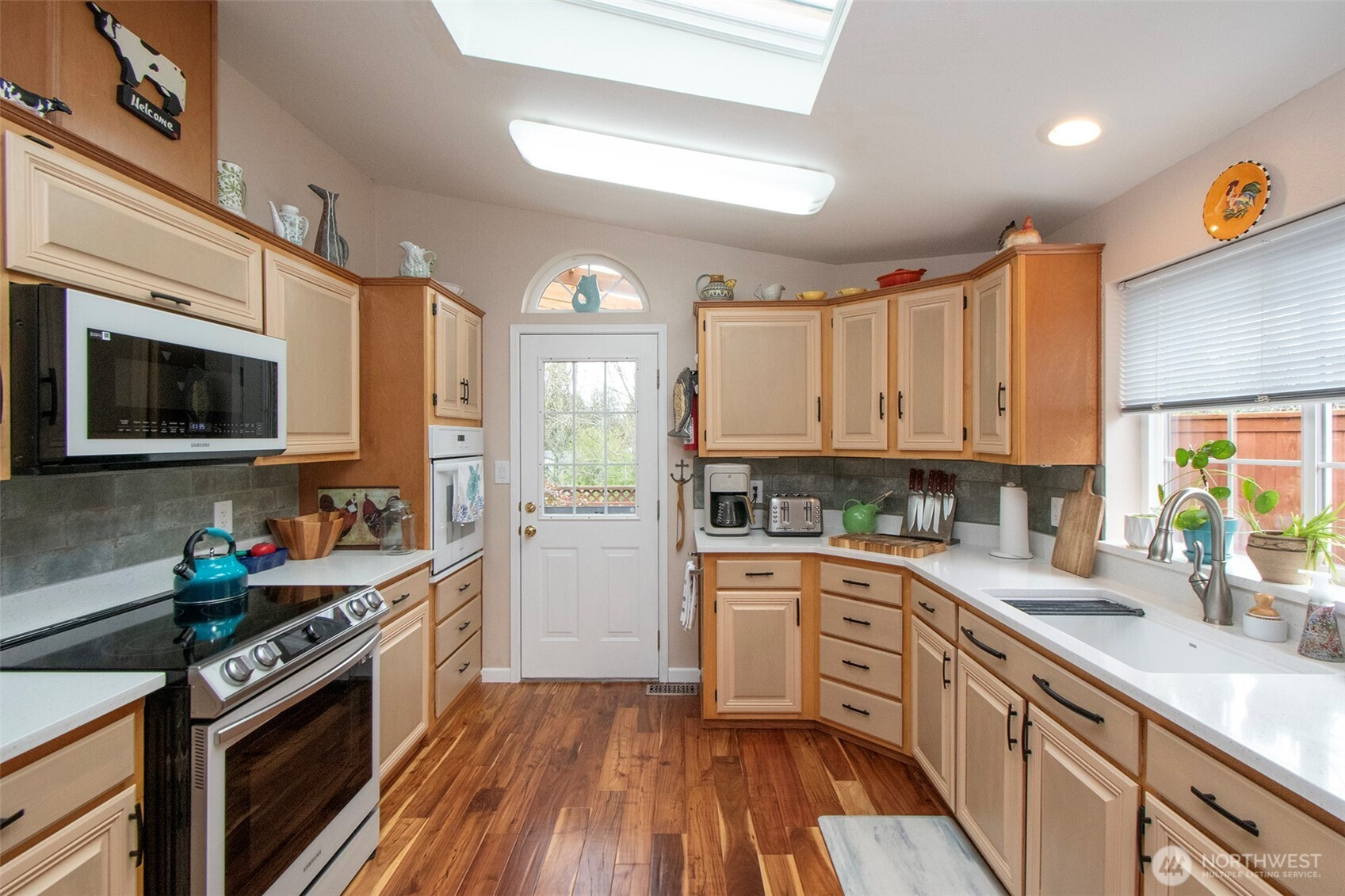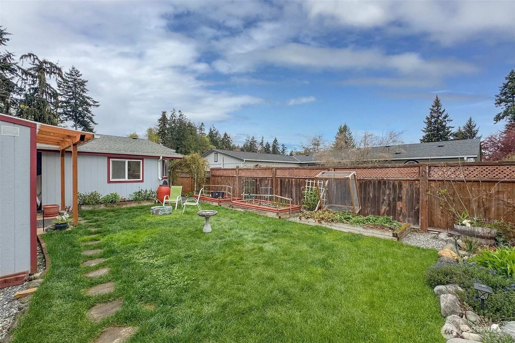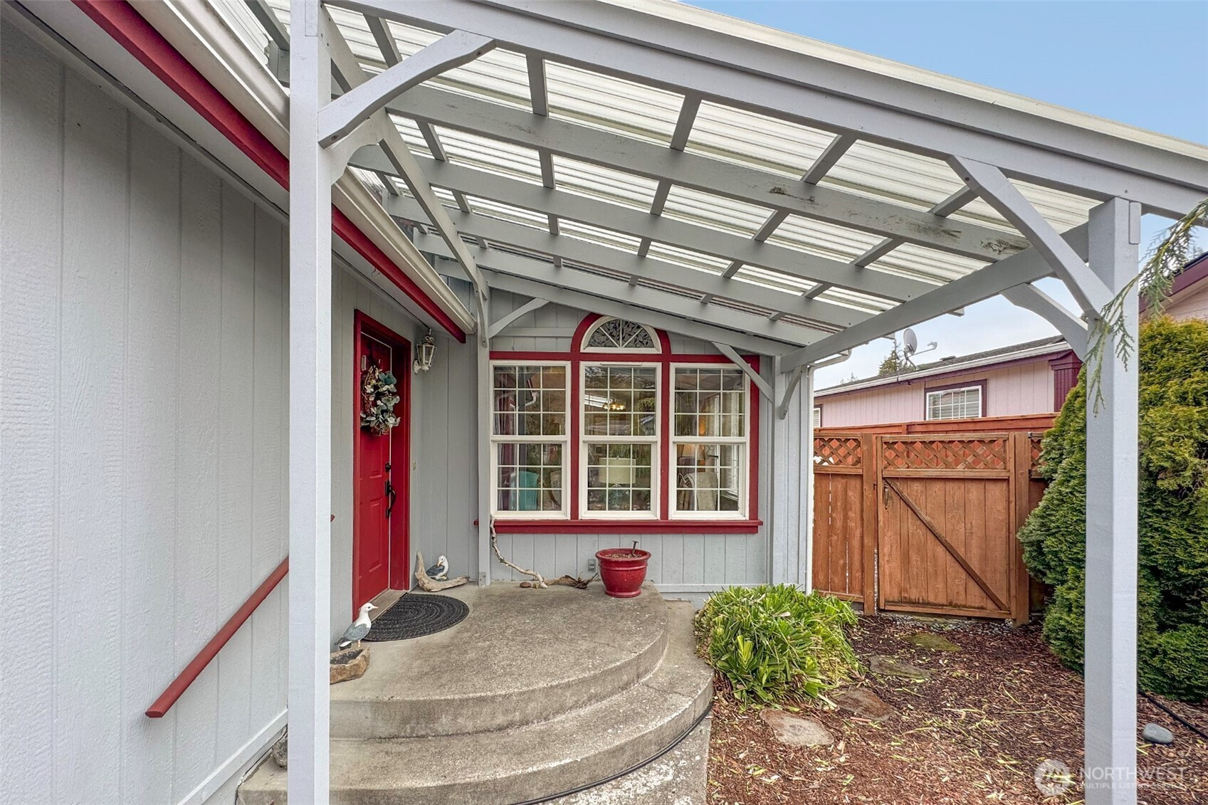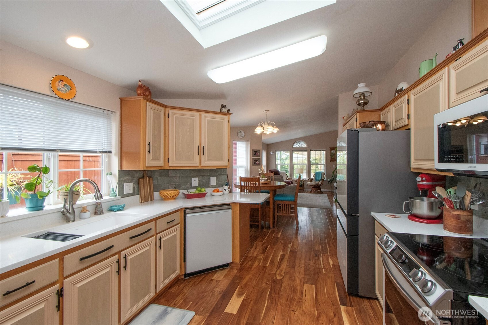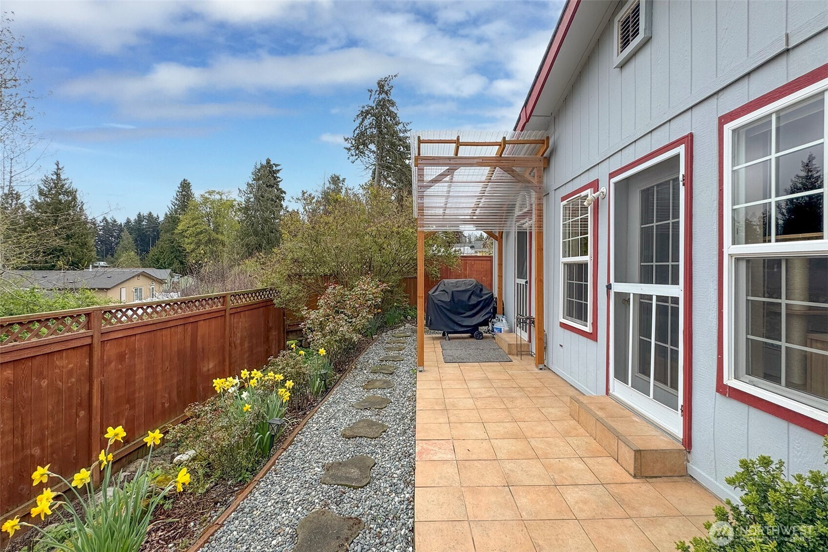 Newly updated, well maintained, and spacious triple-wide home, perfectly located in the quiet back corner of beautiful Parkwood. Light and bright home with an exceptional floor-plan, two large open living areas, updated kitchen with quartz countertops and skylight, primary suite has a walk-in closet, walk-in tiled shower, double sinks, and a jetted soaking tub. All new Acacia flooring throughout, new kitchen appliances, a new under-counter sink and faucet with instant hot water, new guest bathroom fixtures and tile, all new exterior covered porch/patio areas, new back and south side fencing, as well as mature landscaping with fig and pear trees, strawberries and blueberries. The large two car garage has an additional heated/finished shop area with workbench perfect for crafts and hobbies. The back yard with raised beds, flower garden and greenhouse/garden shed has a very private feel. The landscaping with drip irrigation, two covered and tiled outdoor living/patio areas, lush lawn and the homes location in the park add to the feeling of privacy. Parkwood offers many amenities including a clubhouse, BBQ area, exercise room, sauna, RV parking and trails.