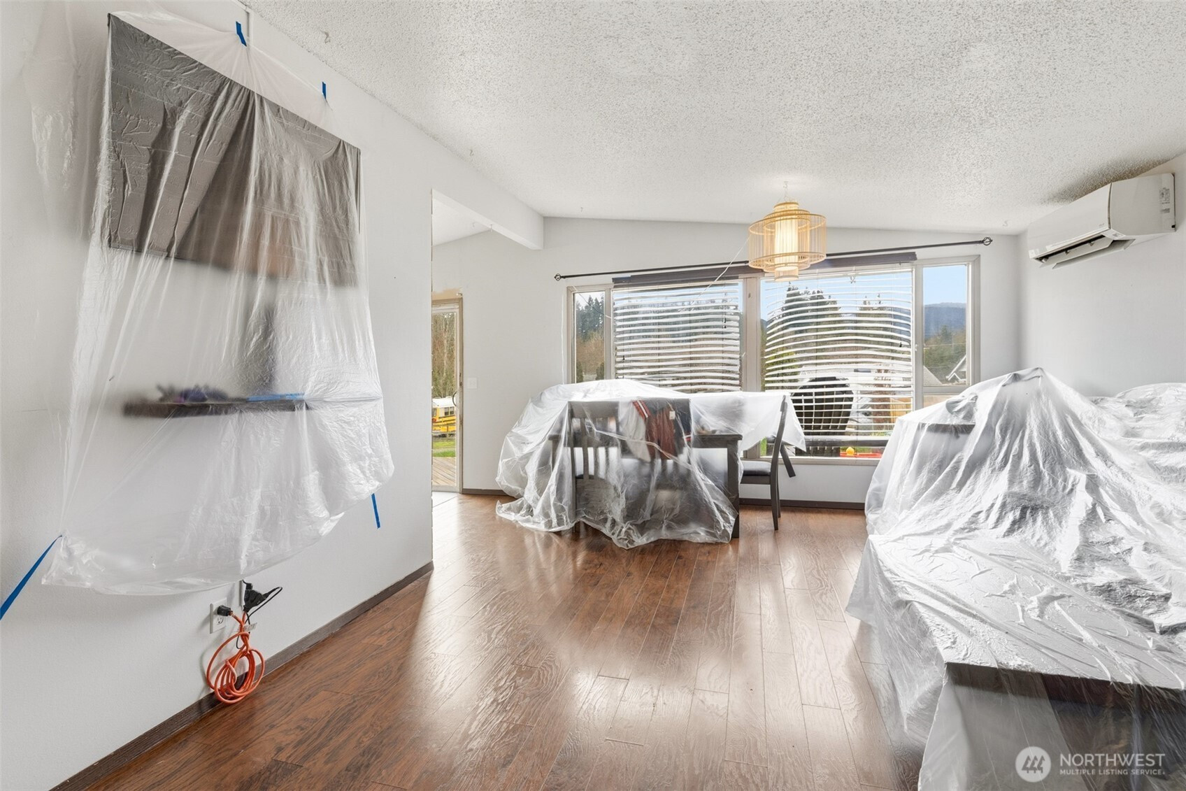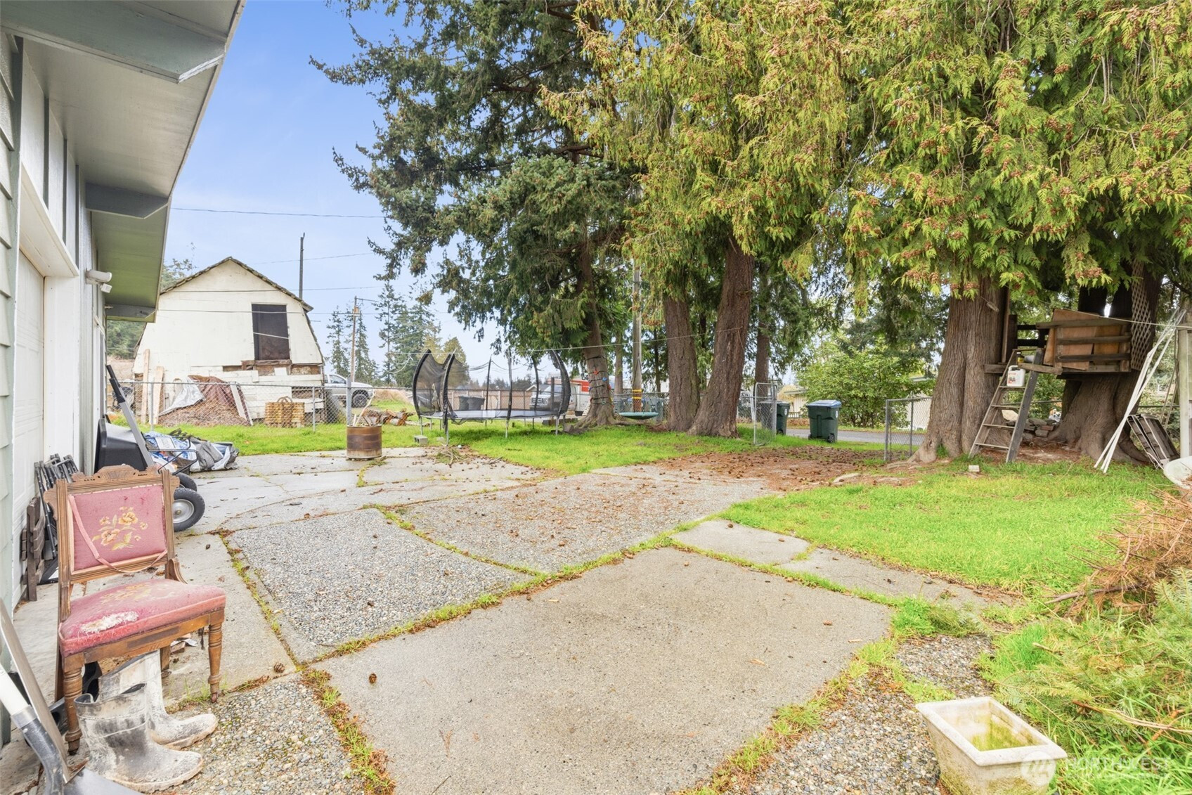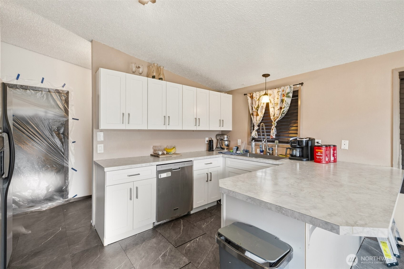 Tucked away on the quiet dead-end portion of West 13th, this mid-century inspired home offers a fantastic opportunity to build sweat equity in a solid, well-laid-out property. Concrete walkways lead to a fully fenced yard stretching from front to back, complete with gated alley access for added convenience. Inside, vaulted ceilings and a wood accent wall create an open, character-filled living space. The kitchen has already been thoughtfully updated with modern cabinetry, countertops, and tile flooring, and features a peninsula for casual seating along with a dining area that opens to the front deck through a sliding door. The flexible floor plan includes three bedrooms and one and a half baths, with the primary bedroom offering convenient Jack-and-Jill access to the half bath and nearby laundry area. A shared full bathroom serves the additional bedrooms. At the back of the home, a spacious rec room with fireplace opens to a concrete patio through another sliding door, perfect for indoor-outdoor living and easily adaptable as a fourth bedroom, guest space, or bonus room. Two ductless heat pumps provide efficiency from either end of the house, and vinyl windows are already in place. An attached one-car garage, fenced yard, and classic mid-century lines round out the property. With strong bones, a great layout, and several key updates already completed, this home is ready for someone to bring their vision and make it shine.