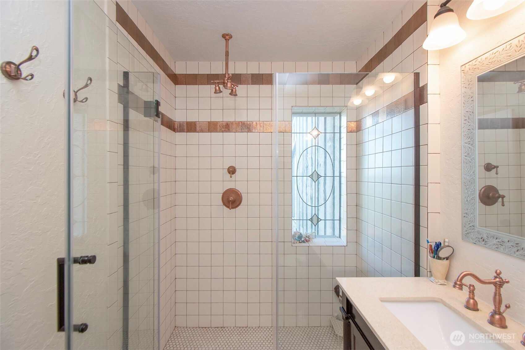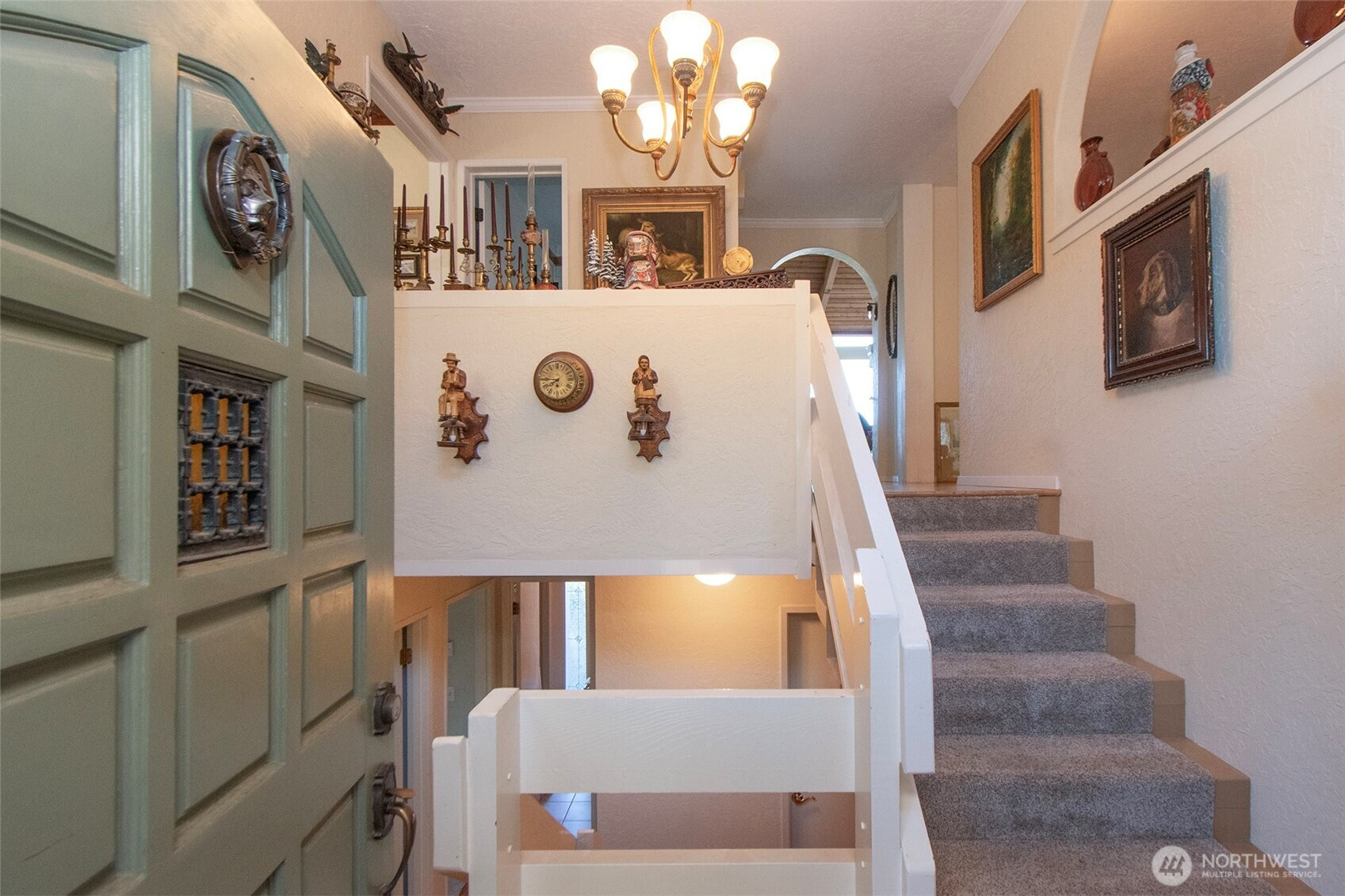 Beautifully unique NW Style home sits at the top of the hill in a quiet, well established neighborhood close to the Peninsula Golf Course. Home is elegantly appointed by the floral mature landscaping and park like setting. Large windows and skylights make it filled with light each day and create an incredible feeling of space and comfort. Open beamed cathedral ceilings, dressed up with tongue and groove cedar along with elegant hardwood floors and lovely built-in cabinets in dining room. 4 bedrooms plus an EXTRA den/office, 3 baths, spacious kitchen, living room with WATER VIEWS and wood fireplace. Primary bedroom has a newer pellet stove and cozy sunroom with access to the north deck. You can also soak up the sun while drinking your morning beverage on the south-east deck right off the kitchen. Attached garage also features a shop area with massive storage space and a plumbed/vented hobby room- could be a wine cellar. Heated floors in downstairs bathrooms. Roof around 9 years old. Custom details throughout and an amazing location allowing quick access to all city’s amenities.