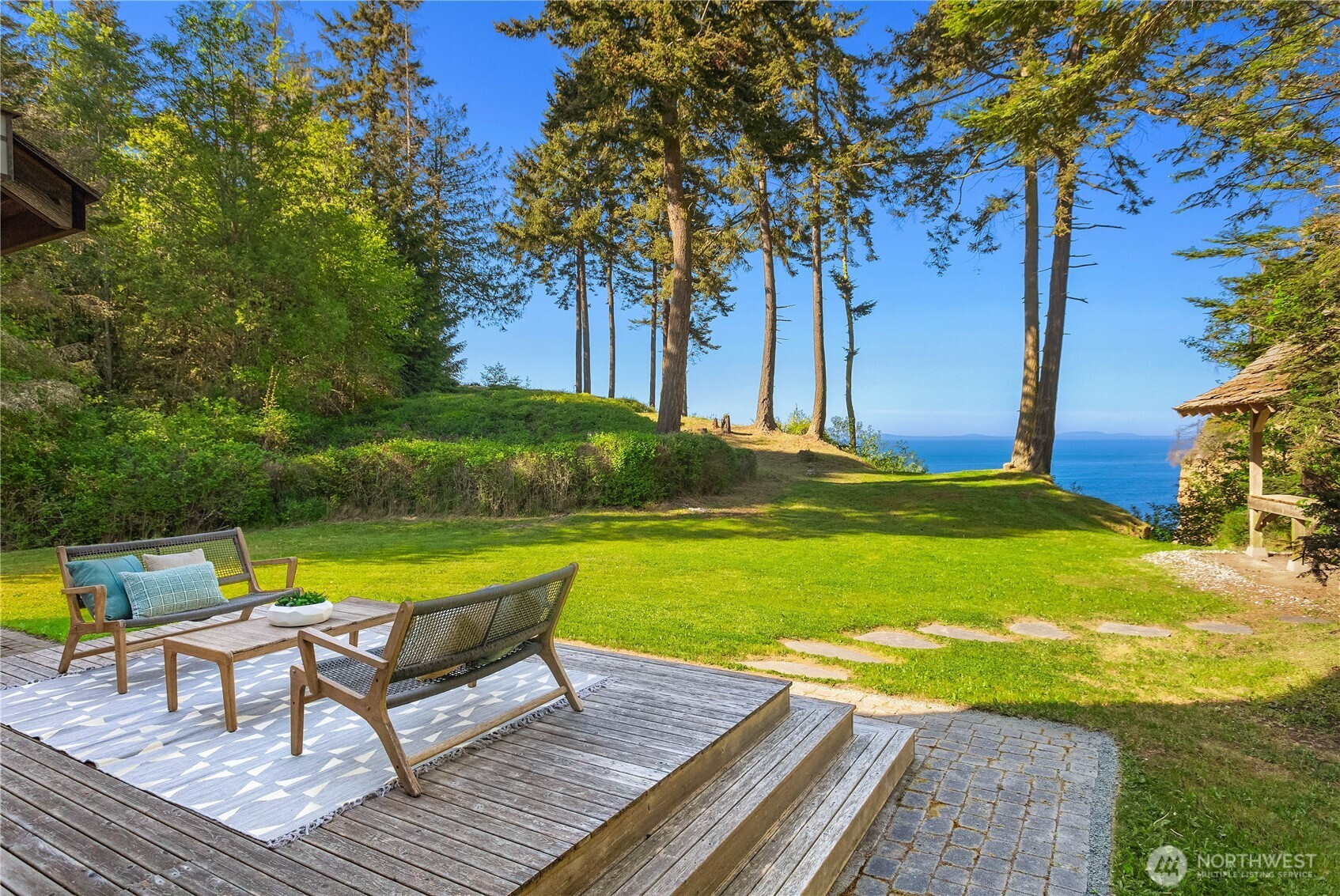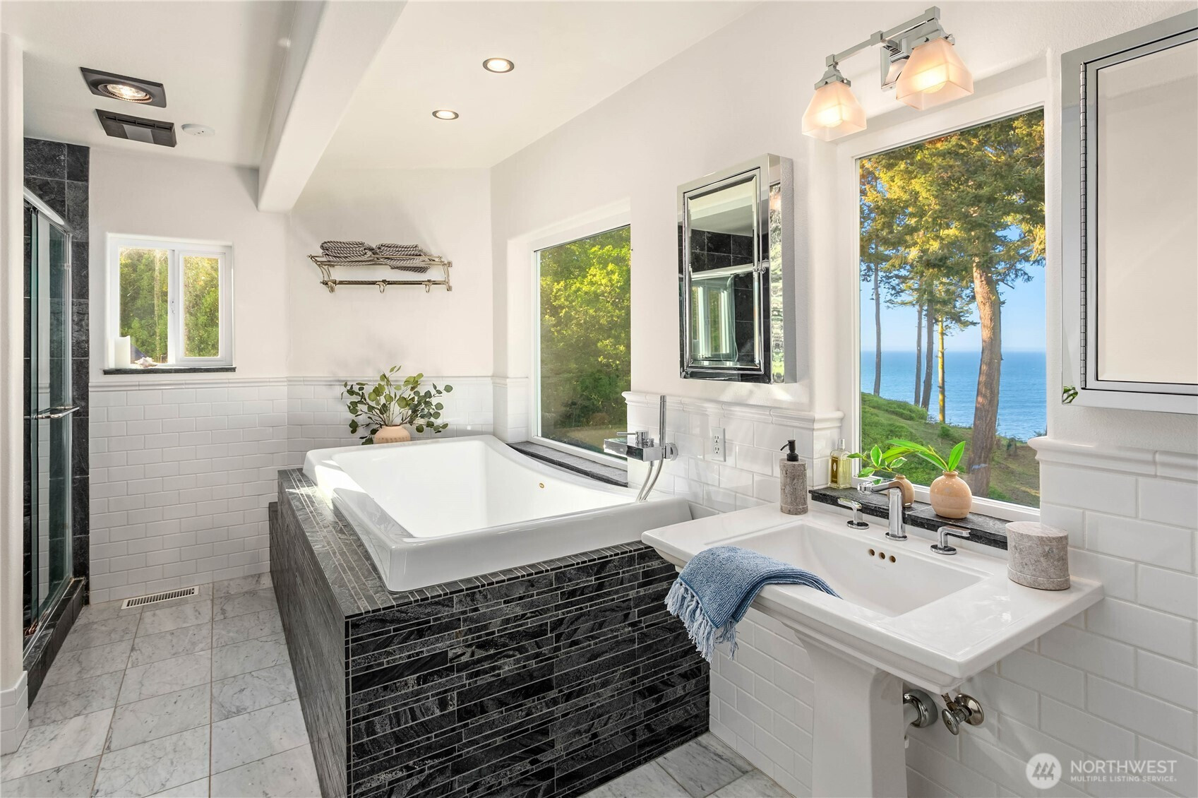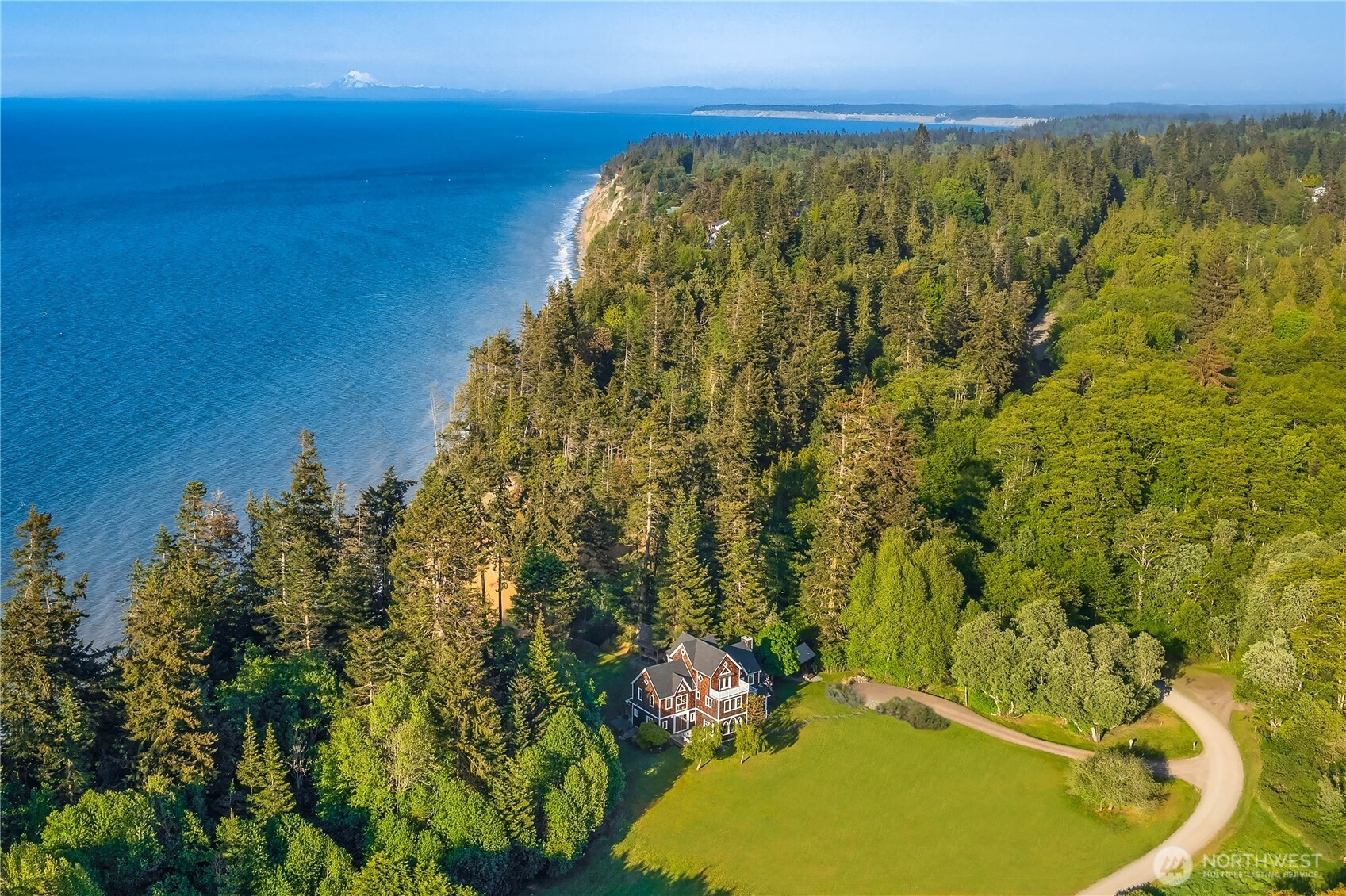From the water’s edge to the summit above, this rare 10-acre coastal blufftop estate is a true climate haven in the heart of the Olympic rain shadow between Sequim and Port Angeles, where blue skies and sun-drenched days are the norm. Set across two parcels, including a second 5-acre lot with future potential (buyer to verify), the property captures sweeping Olympic Mountain and Strait of Juan de Fuca views from nearly every room. Follow your private trail to the beach below, rinse off in the outdoor surf shower, or unwind beneath the cedar pergola in the covered hot tub overlooking the water. Designed for both retreat and adventure, the grounds unfold in a park-like setting with pond, evergreens, and a covered recreational pavilion currently a half-pipe, an unexpected space for play, creativity, or reimagining. Inside, light-filled living spaces frame the landscape, complemented by a chef’s kitchen with Viking appliances, dual refrigerators, and pantry, along with three en-suite bedrooms and a private sauna. A main-level office nook with water views invites inspiration, while a spacious bonus room offers flexibility for a gym, studio, or media lounge. Each suite includes a lofted area above for additional storage and utility. Multiple view patios, oriented to both mountain and Strait, create seamless indoor-outdoor living. A setting that feels both expansive and deeply personal, crafted for those who seek beauty, privacy, and a life well-lived at the edge of land and sea.