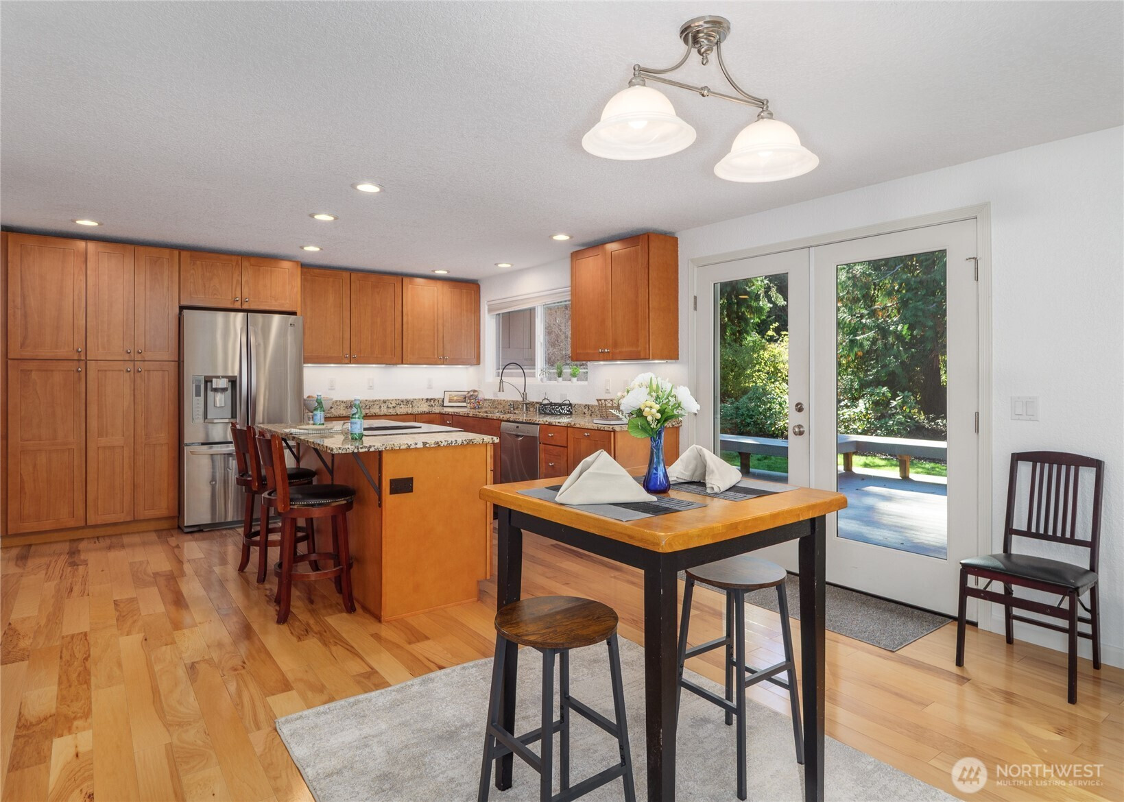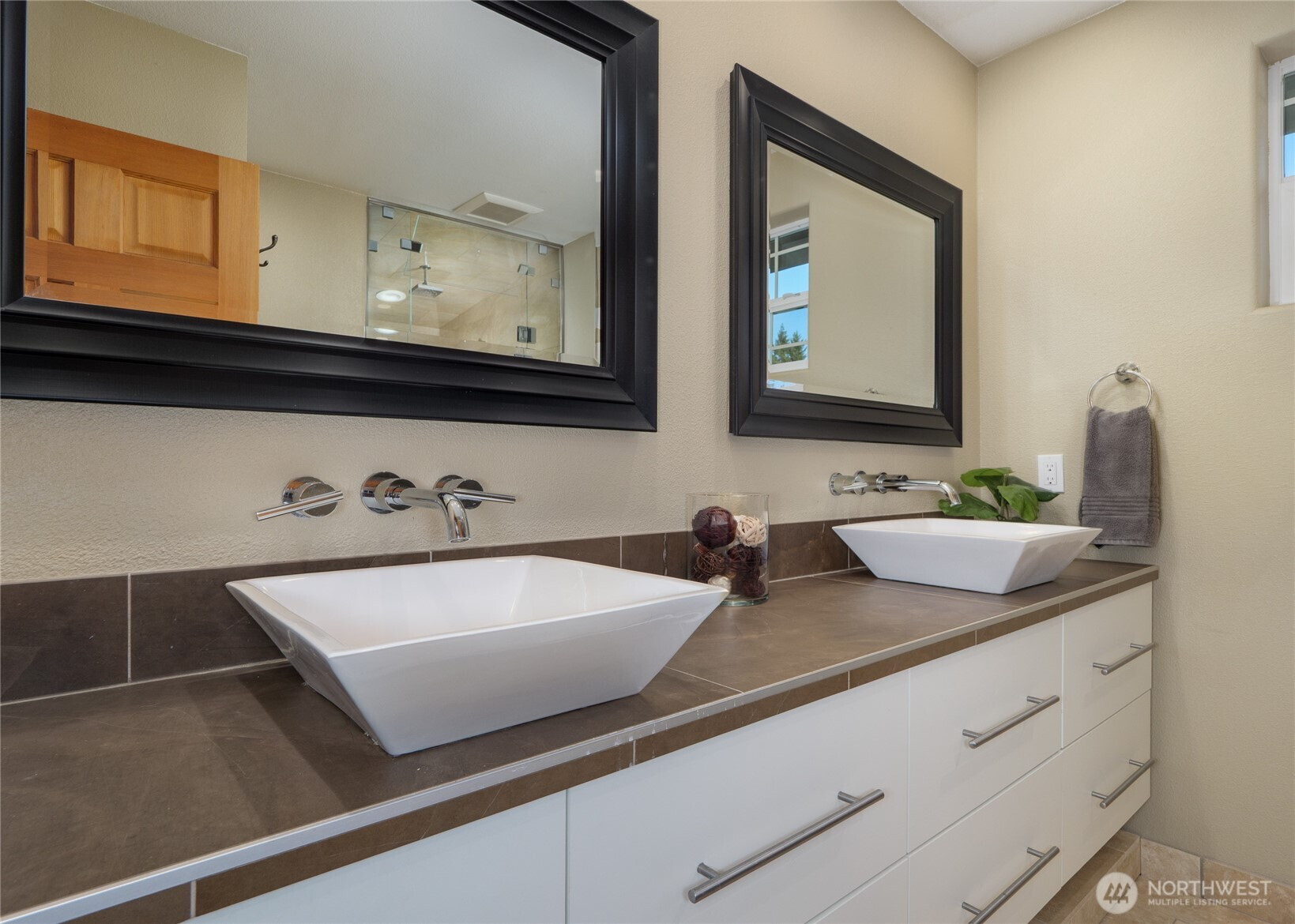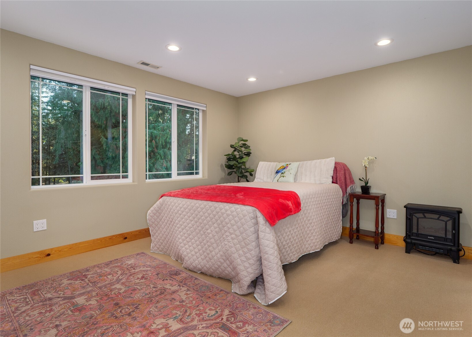Tucked among the trees ! Spacious 2,512 square ft. multi-level home in Sequim’s Sunland community. 4 bedrooms, 3.5 baths, and a versatile layout. Open kitchen with granite counters, stainless appliances, and custom cabinetry. 2 main-floor living areas include wood-burning fireplace and access to the backyard deck. Upstairs find 3 bedrooms—one with an ensuite and heated floors—plus a full hall bath. Private primary suite occupies the top floor with a walk-in closet, double vanity, heated floors, and tiled shower. Bonus space off the two-car garage makes an ideal spot for gym or media room. Additional features include hardwood flooring, heat pump, and storage. Ample parking.Low-maintenance backyard with large deck, wood fire pit and privacy.